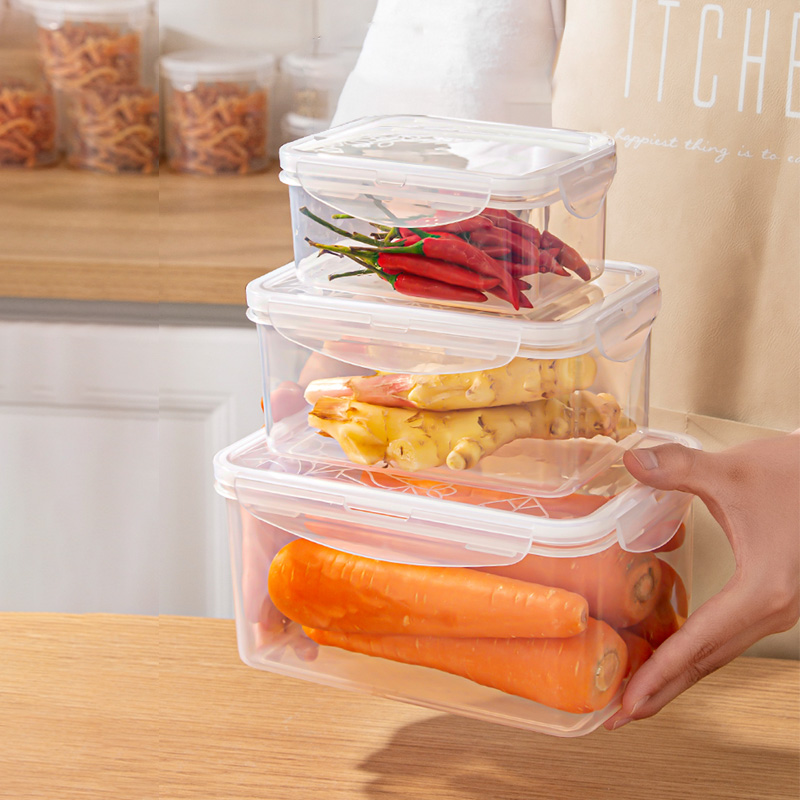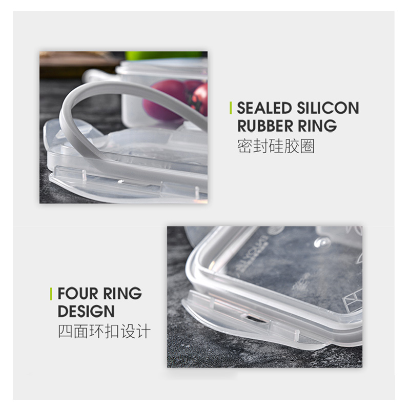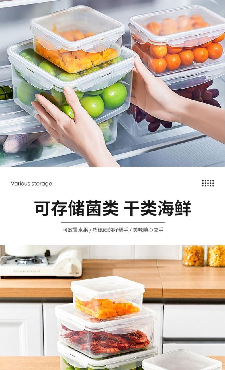 颜色:透明色 容量:660ml+1330ml+2550ml 材质:盖子材质:聚丙烯 硅胶树脂,盒子材质:PP材质 产品尺寸:0.66L:15*10.5*6.5cm,1.33L:18*12.2*8cm,2.55L:22*15.5*10.8cm 包装尺寸:22.5*16*11.5cm 毛重:0.607kg 1、660ml+1330ml+2550ml三个规格,分类收纳 2、四面锁扣,全密封不渗漏; 3、优选pp材质; 4、适用冰箱、微波炉加热; 5、可叠加堆放