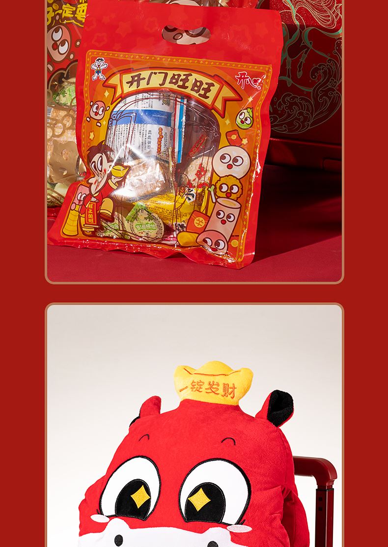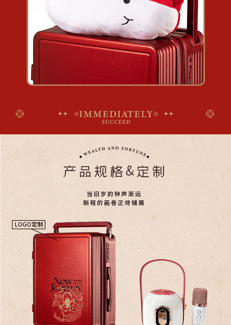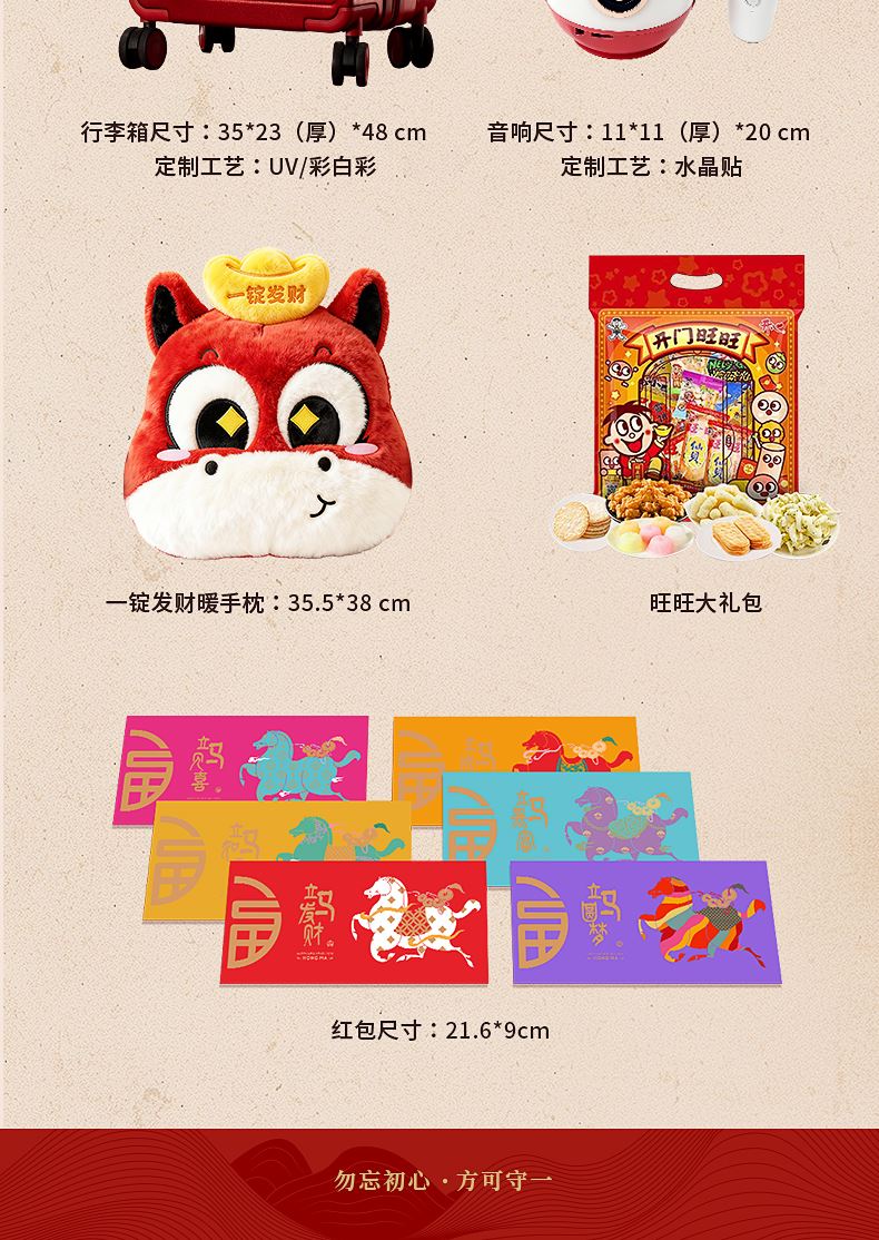 产品配置:20寸行李箱、多功能蓝牙音响加氛围灯加唛、一锭发财可爱抱枕、旺旺大礼包、马年大吉红包*6