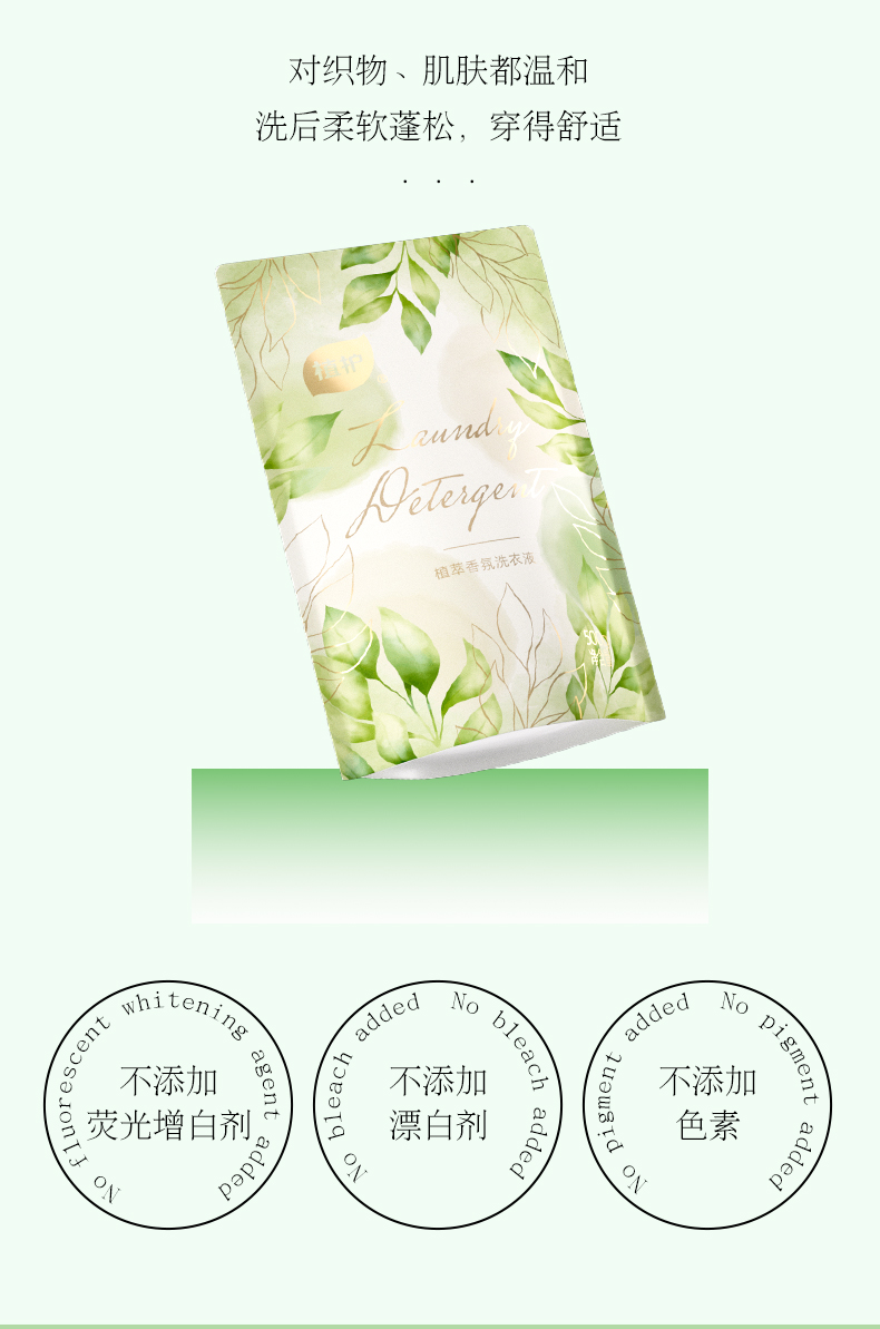 销售规格:500g/袋*5袋 外包装方式:纸箱包装 主要成分:去离子水、表面活性剂、椰子油衍生物、香精助剂、防腐剂等 保质期:3年 1、除螨,去渍柔护; 2、低泡易漂,省心洁净; 3、无磷配方,全家适用; 4、添加活性因子,洁净出彩; 5、瑞士进口香氛,散发优雅奢香; 6、微胶囊留香技术,香味绵长持久。