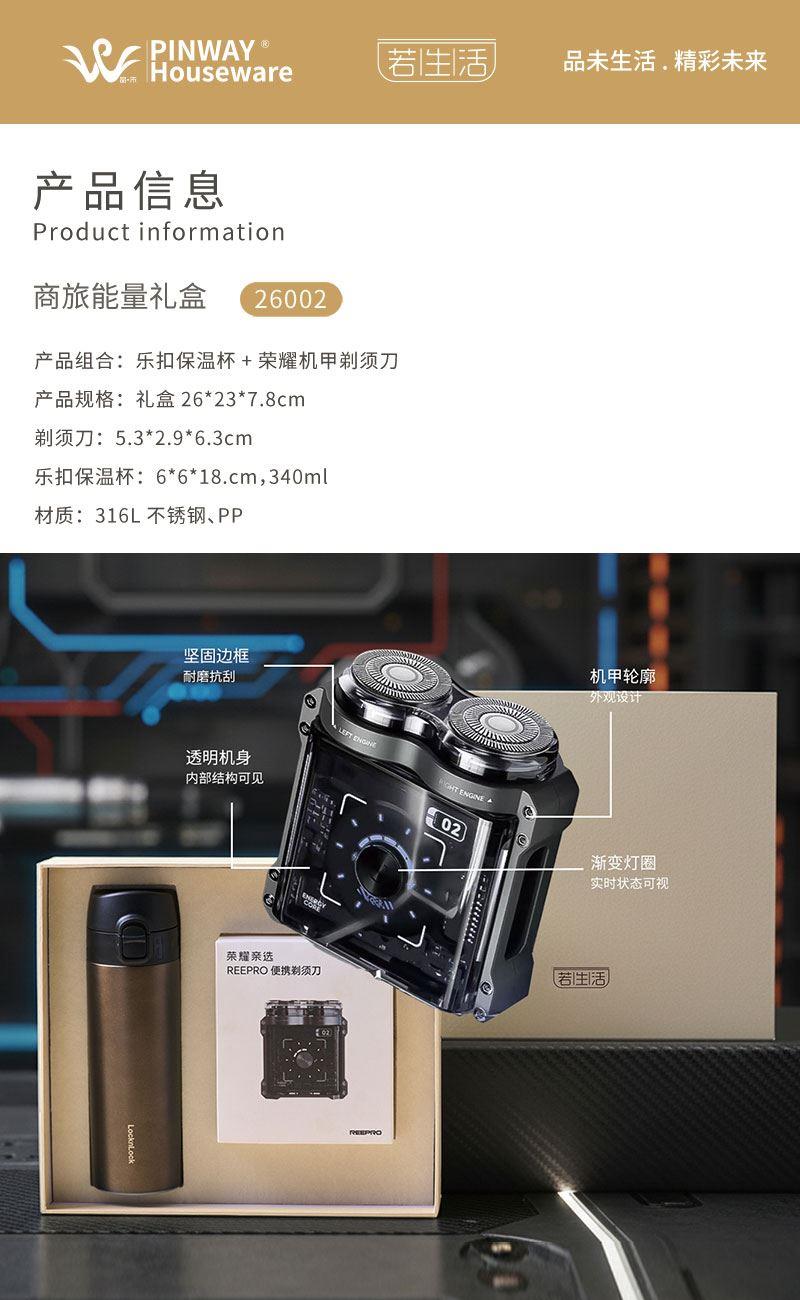 产品组合:乐扣保温杯+荣耀机甲剃须刀 产品规格:礼盒26*23*7.8cm 剃须刀:5.3*2.9*6.3cm 乐扣保温杯:6*6*18.cm,340ml 材质:316L不锈钢、PP 包装:精装礼盒