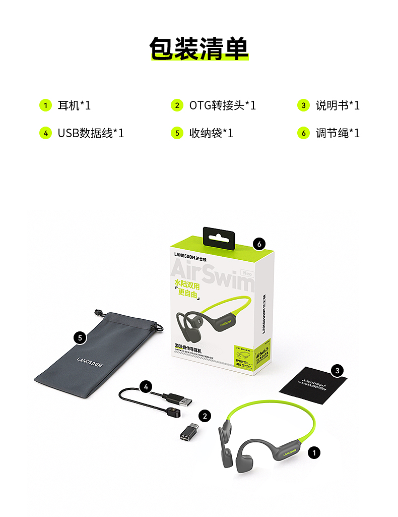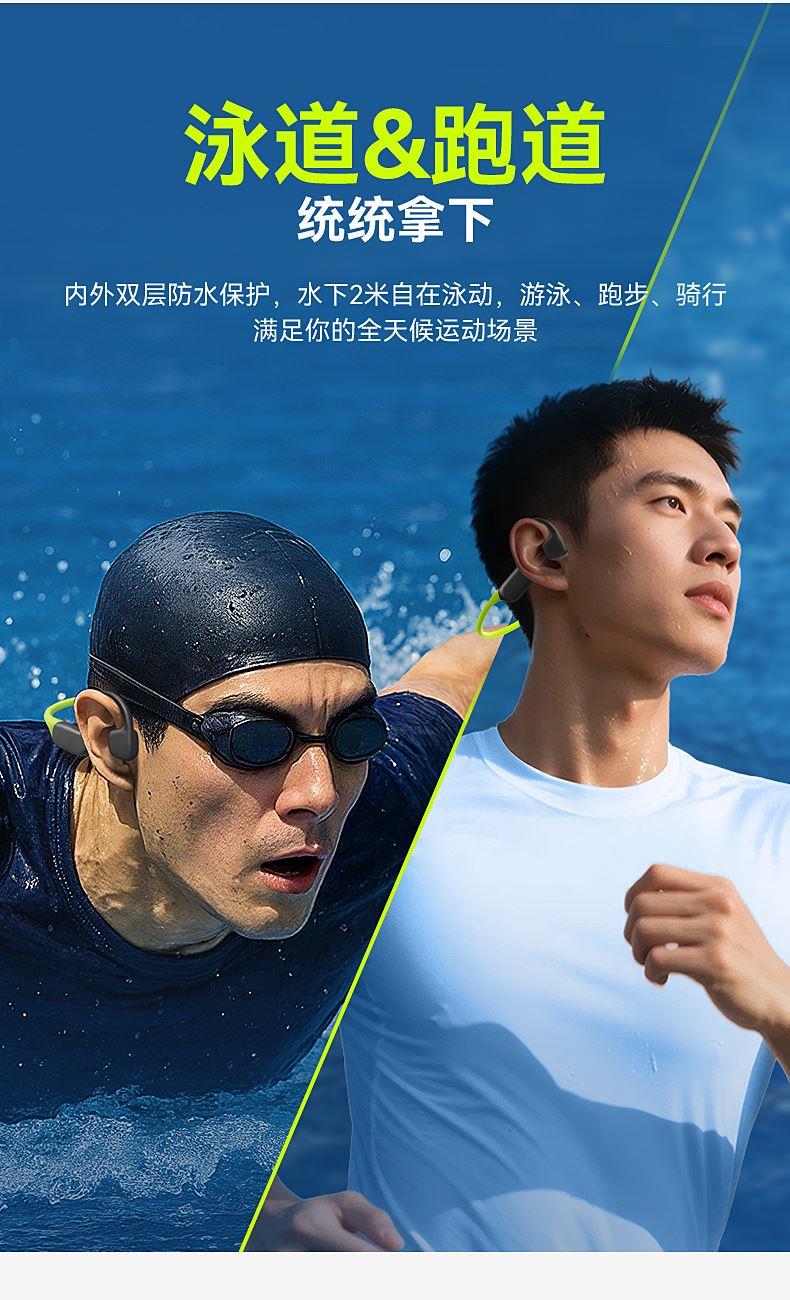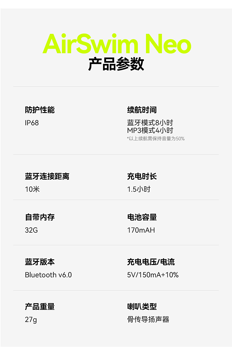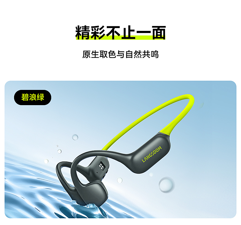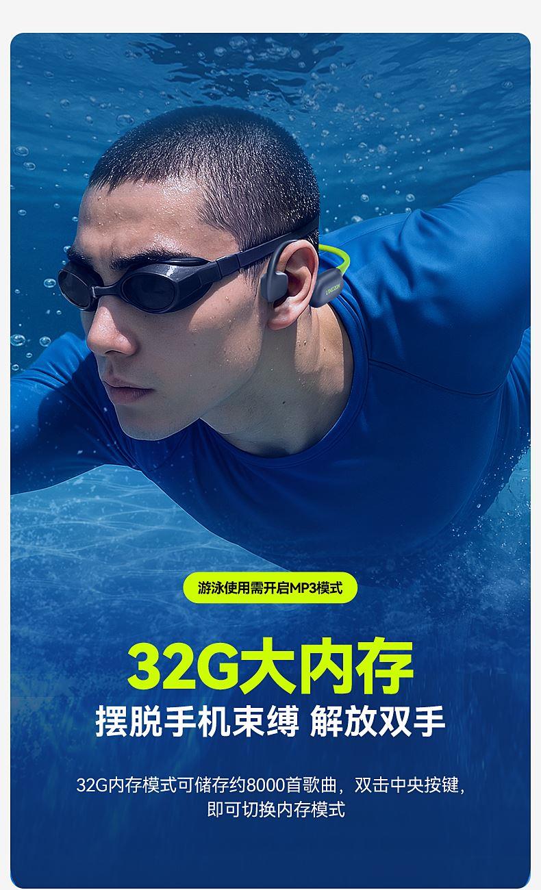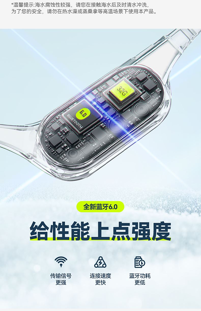 颜色:碧浪绿/潜锋黑 电池容量:170mAh 包装尺寸:130.5*161.5*53mm 外箱尺寸:580*365*550mm 续航时间:8小时 充电时间:1.5小时 蓝牙版本:V6.0 防水级别:IP68 线条简约,记忆钛金属自适配可弯折恢复 骨传导振子,传音清晰更护耳膜 ENC降噪,嘈杂环境通话清晰 IP68防尘防水,支持水下音乐 单次续航8小时,满足日常使用 32G内存,无手机也能听音乐 蓝牙6.0,传速快抗干扰音质优