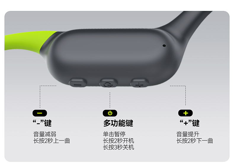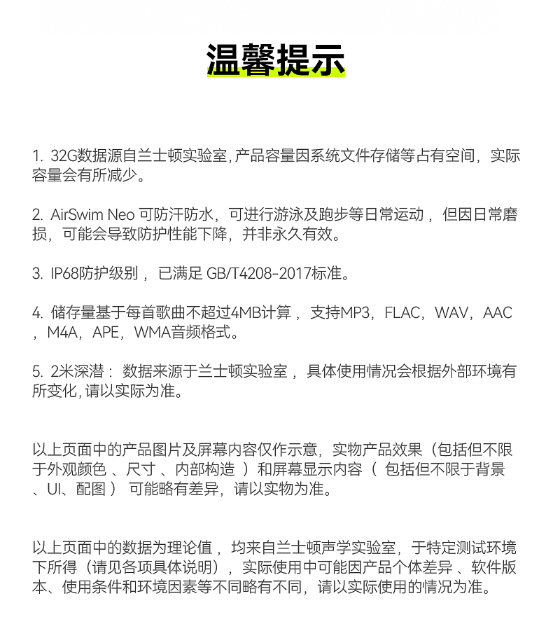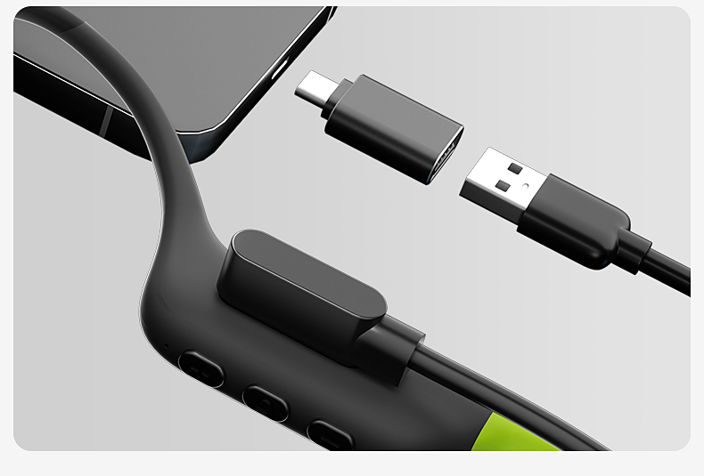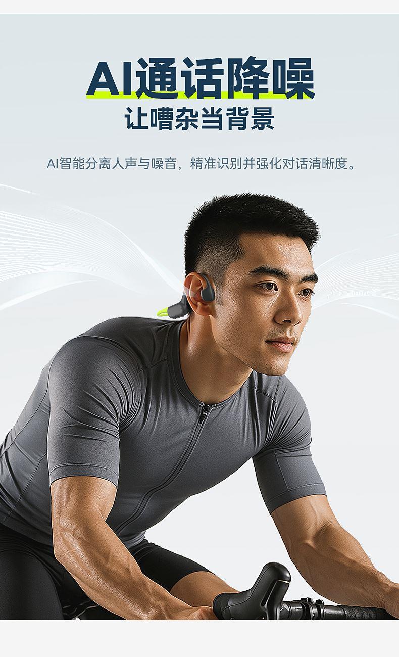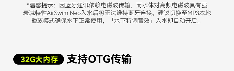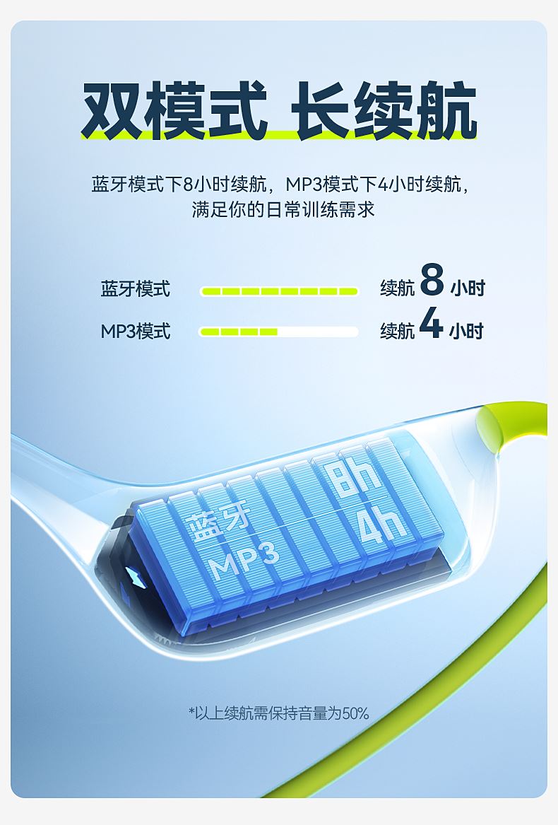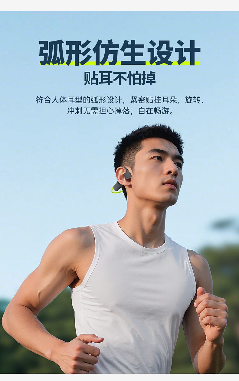 颜色:碧浪绿/潜锋黑 电池容量:170mAh 包装尺寸:130.5*161.5*53mm 外箱尺寸:580*365*550mm 续航时间:8小时 充电时间:1.5小时 蓝牙版本:V6.0 防水级别:IP68 线条简约,记忆钛金属自适配可弯折恢复 骨传导振子,传音清晰更护耳膜 ENC降噪,嘈杂环境通话清晰 IP68防尘防水,支持水下音乐 单次续航8小时,满足日常使用 32G内存,无手机也能听音乐 蓝牙6.0,传速快抗干扰音质优