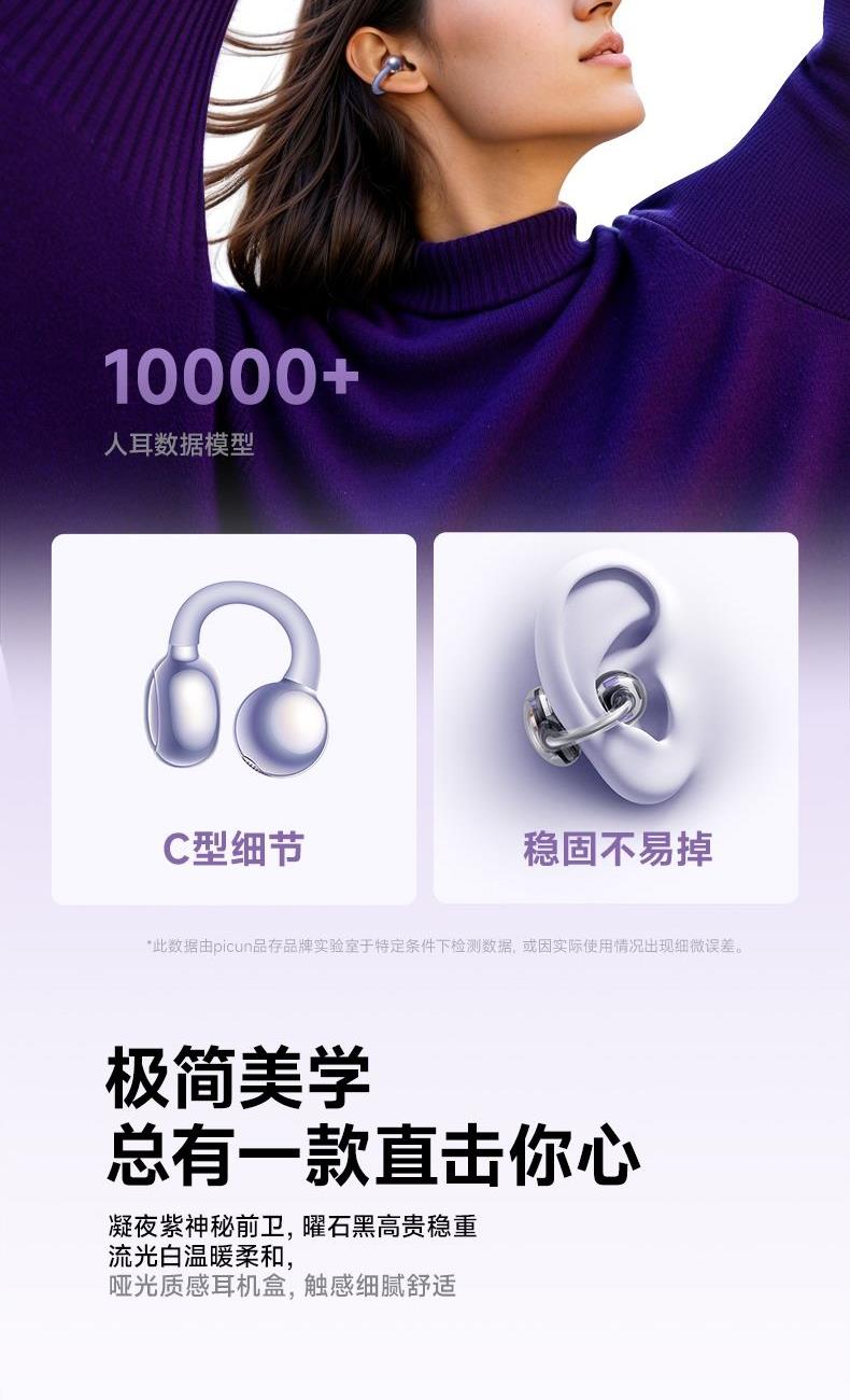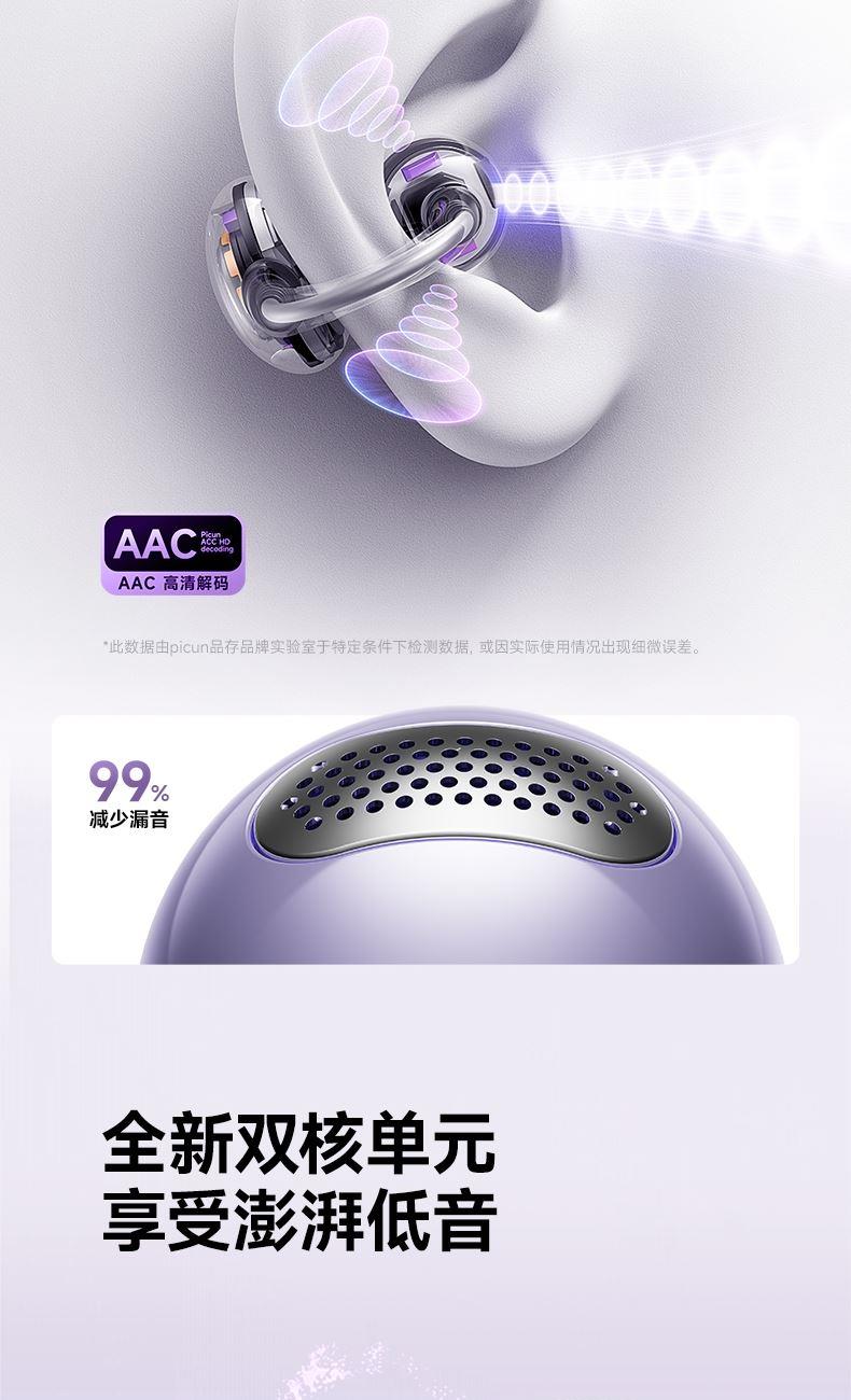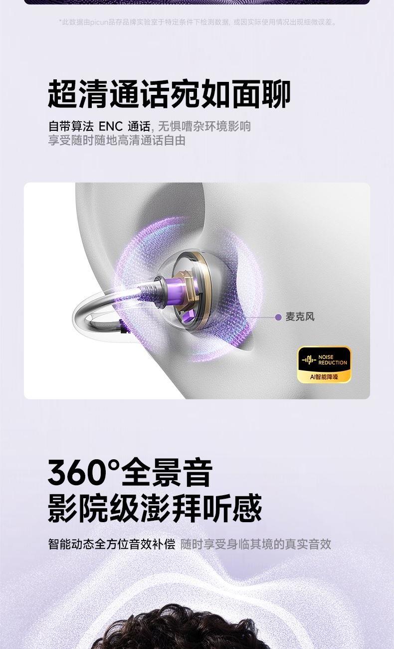 颜色:黑色、紫色 蓝牙方案 : JL7003D 蓝牙版本 : V5.4 接受距离 : 10m 频响范围 : 20HZ- 20KHZ 电池容量 40mA / 400mA 使用时间(70%音量:≈6h 喇叭尺寸 : 12mm 喇叭灵敏度: 120±3db 充电接口: TYPE-C 1、支持【picun品存】APP智能互联控制 2、360度环绕声场 3、智能触控 4、波束传音,不漏音