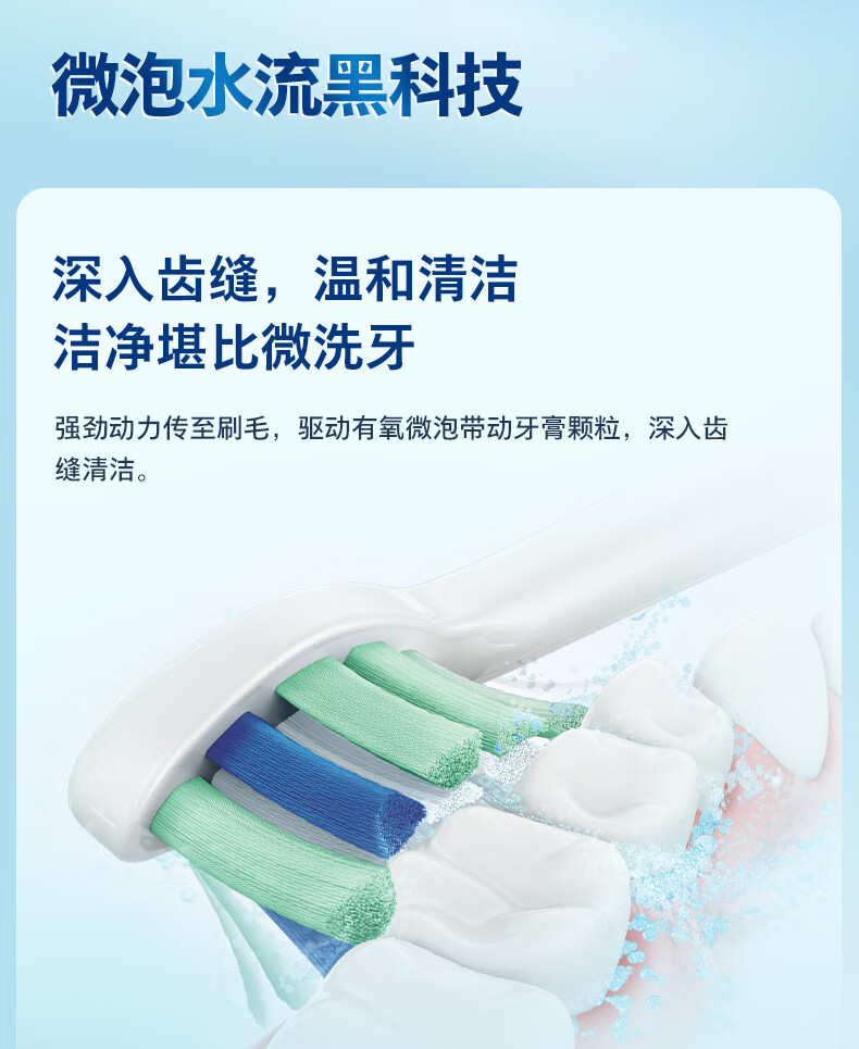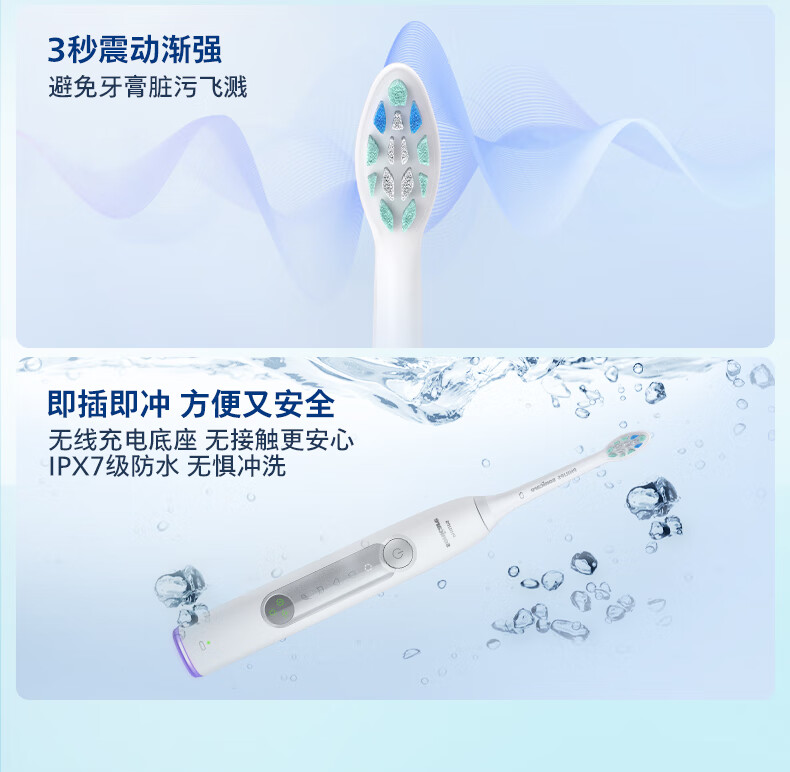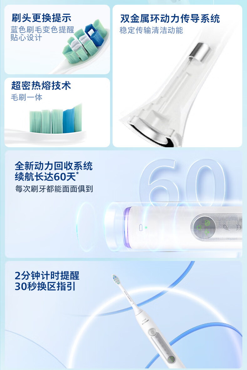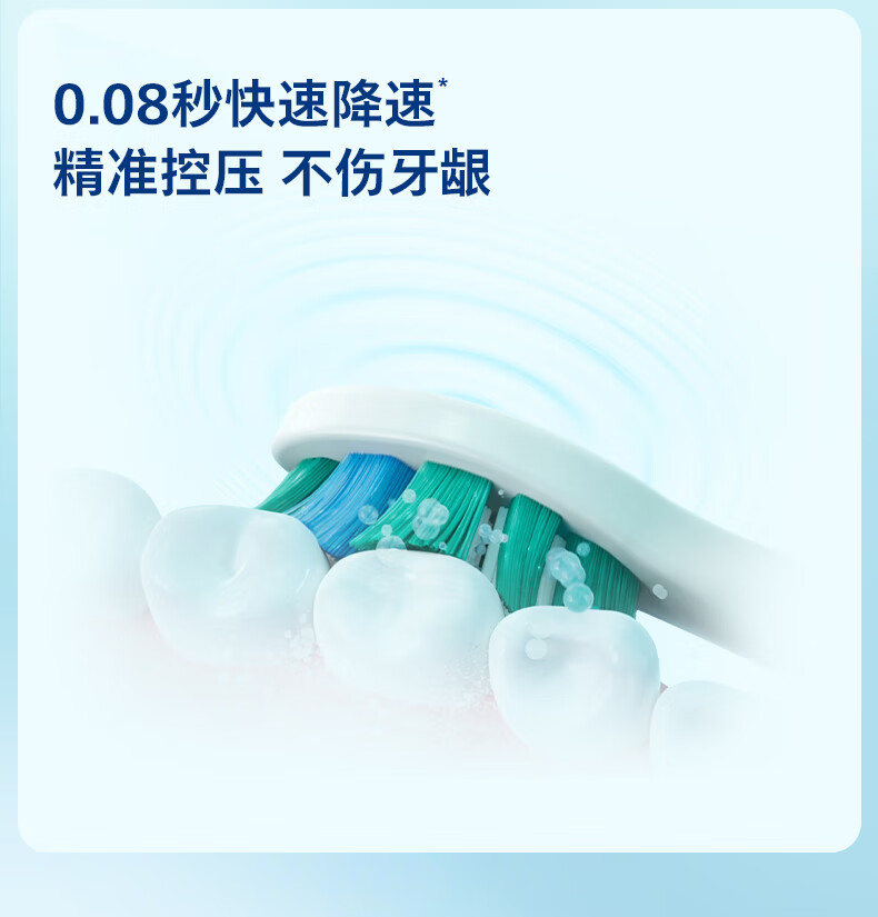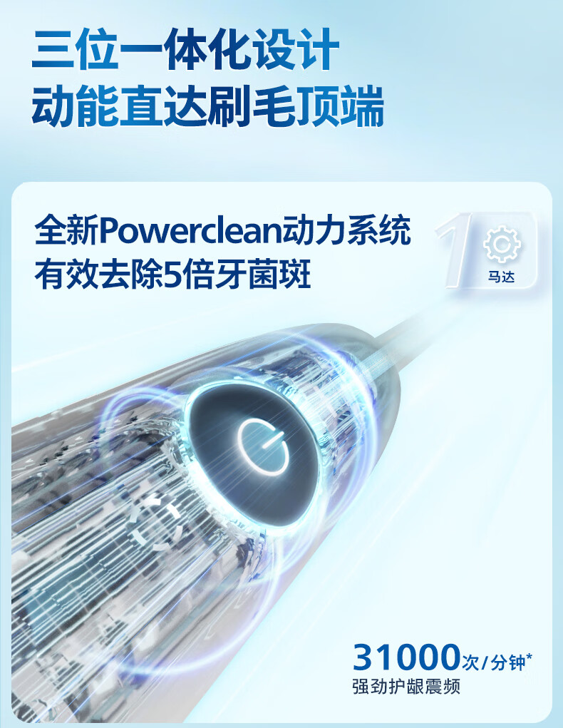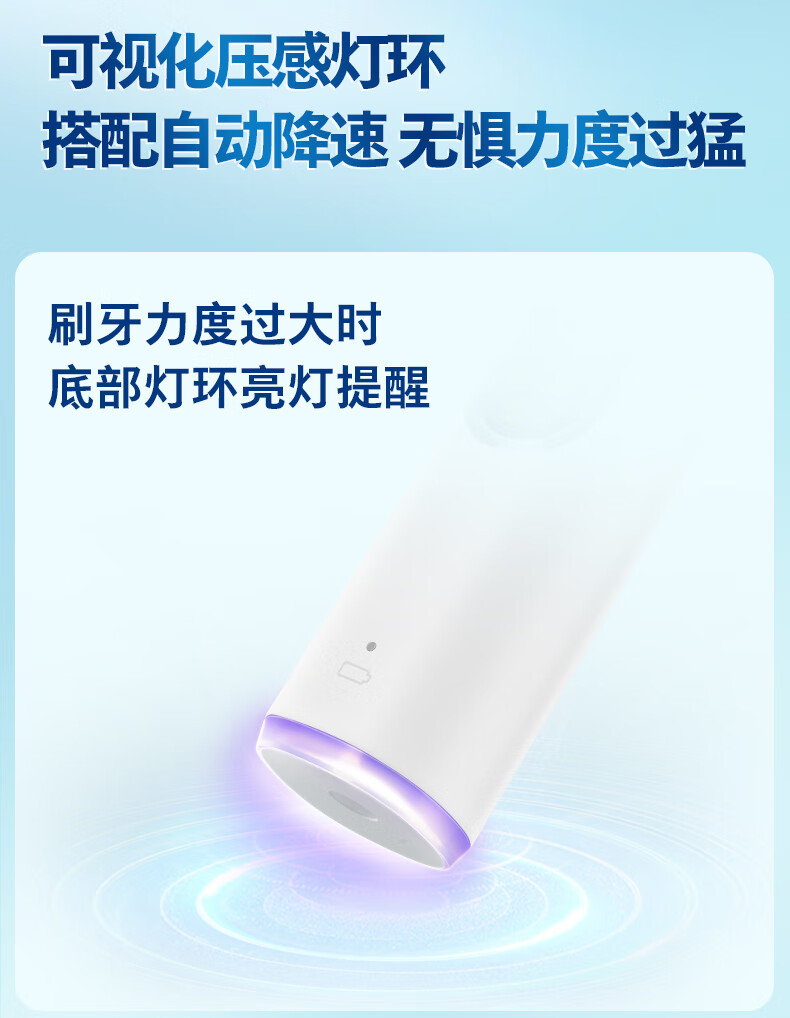 全新Powerclean动力系统有效去除5倍牙菌斑 31000次/分钟强劲护龈振频 可视化压感灯环搭配自动降速 无惧力度过猛 刷头标配2支 0.08秒快速降速 控压 不伤牙龈 五大模式清洁,亮白,护龈,专业亮白,抛光适应不同场景需求 2分钟计时提醒30秒换区指引 续航长达60天 无线充电底座 无接触更安心IPX7级防水 无惧冲洗