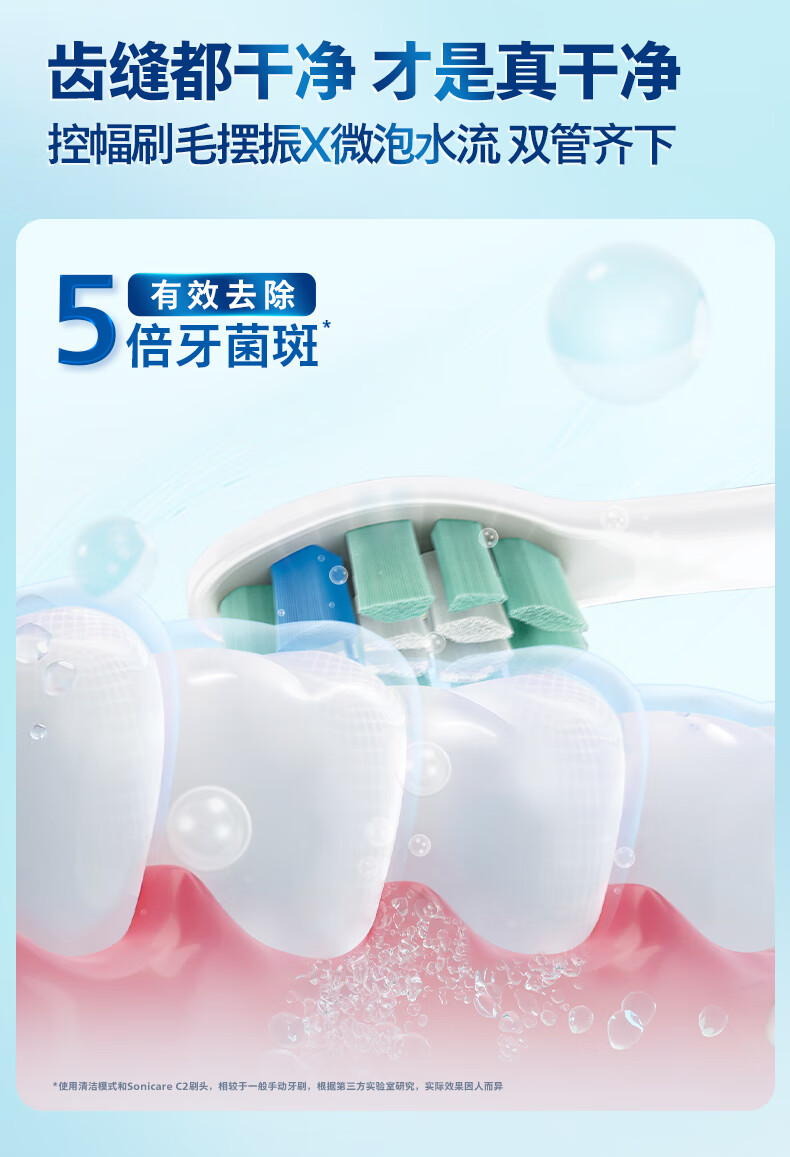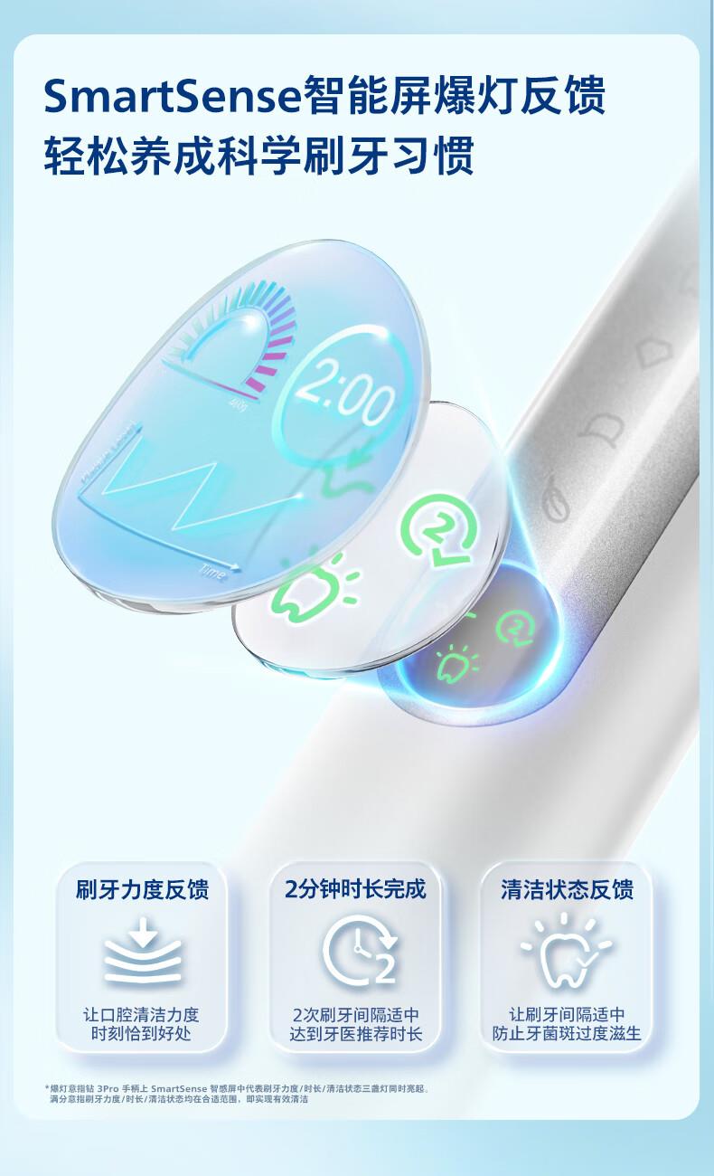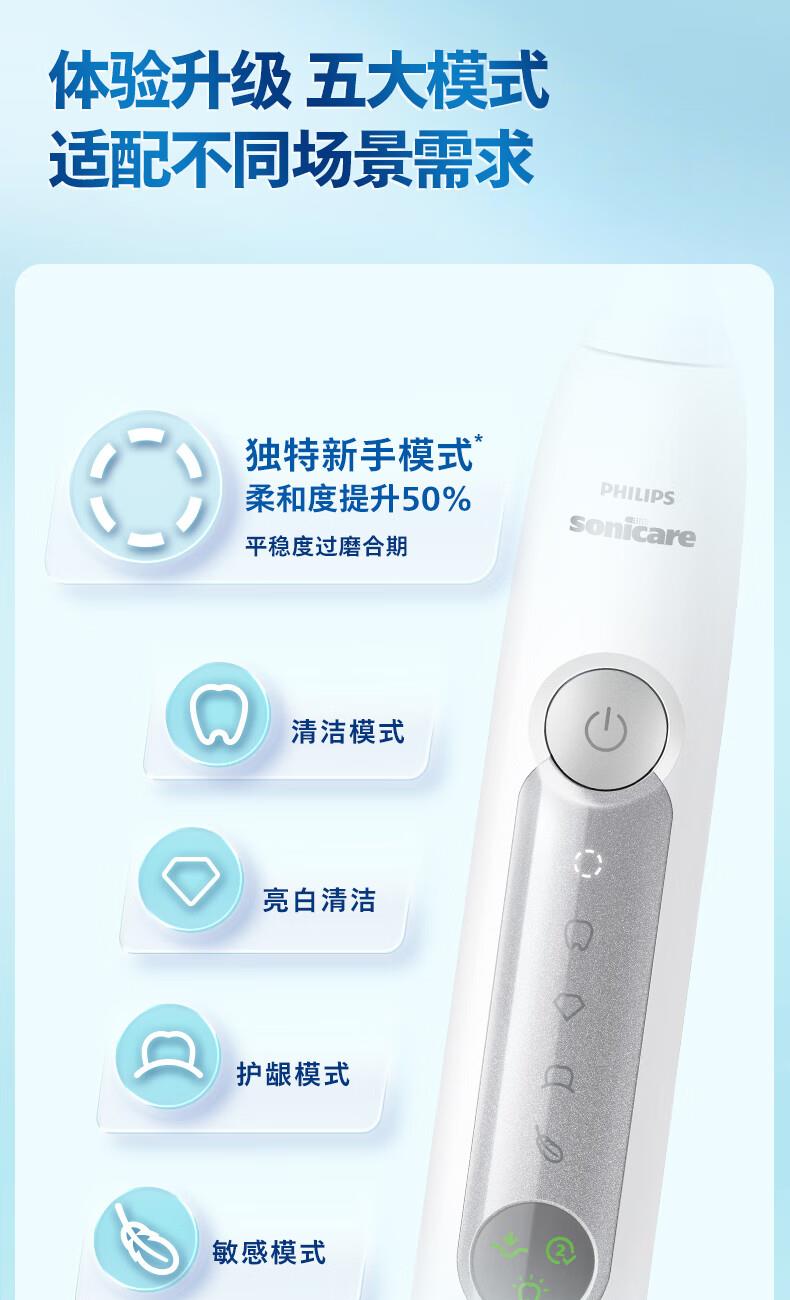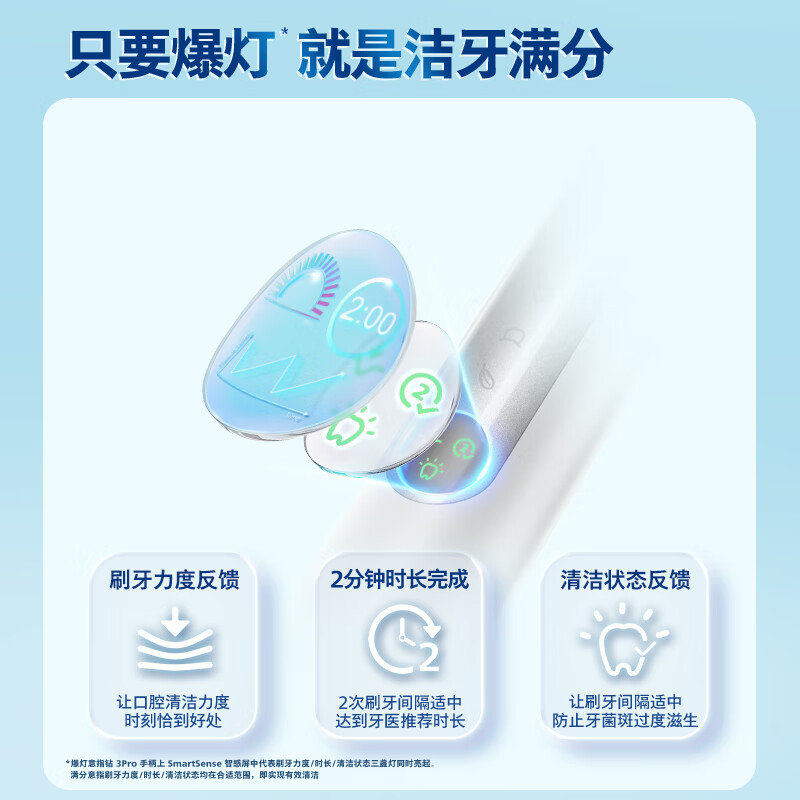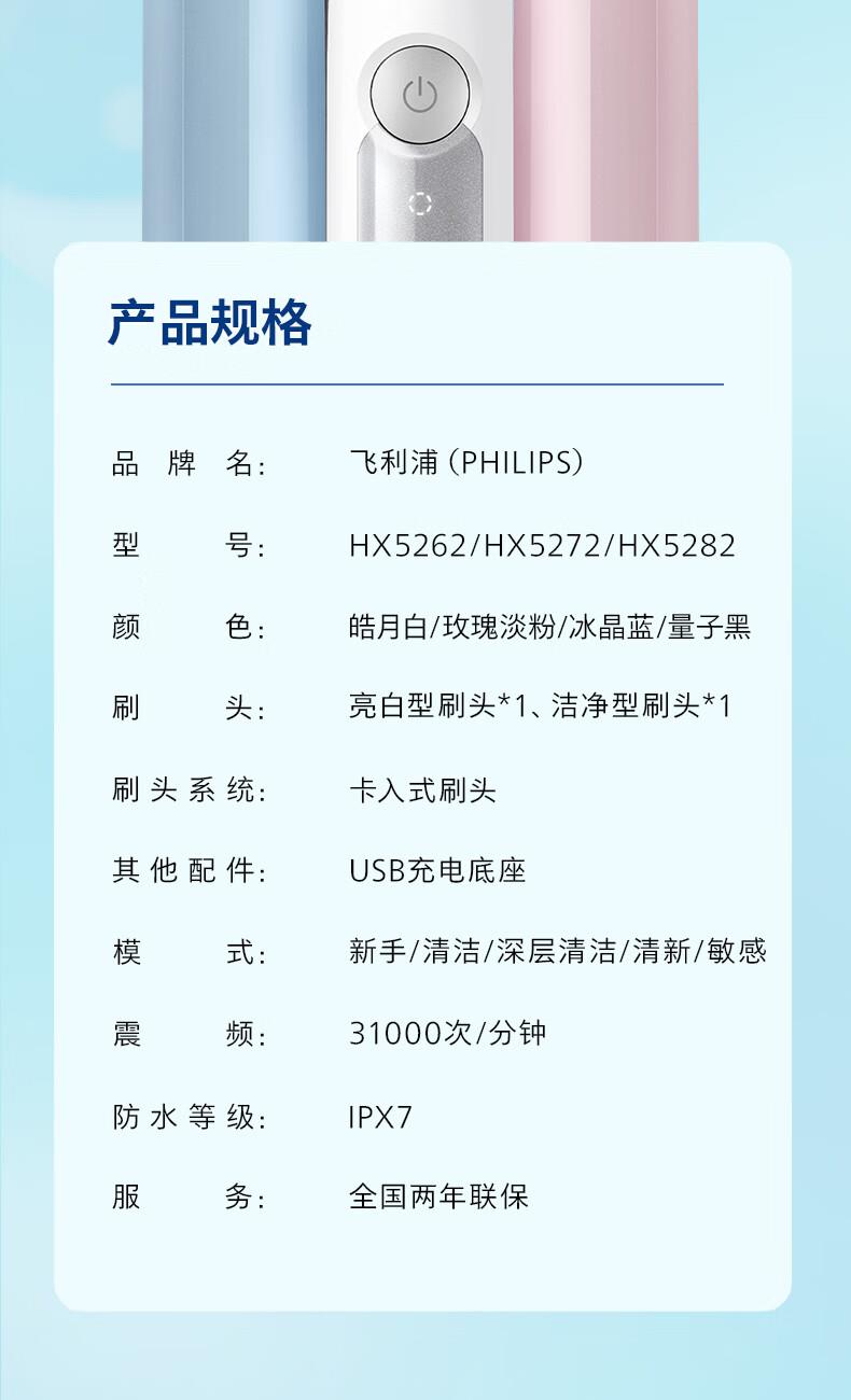 全新Powerclean动力系统有效去除5倍牙菌斑 31000次/分钟强劲护龈振频 可视化压感灯环搭配自动降速 无惧力度过猛 刷头标配2支 0.08秒快速降速 控压 不伤牙龈 五大模式清洁,亮白,护龈,专业亮白,抛光适应不同场景需求 2分钟计时提醒30秒换区指引 续航长达60天 无线充电底座 无接触更安心IPX7级防水 无惧冲洗