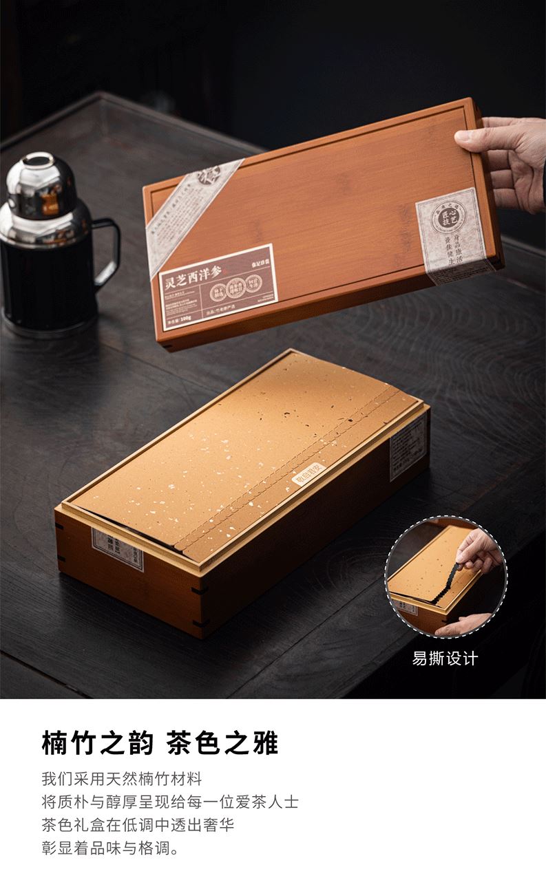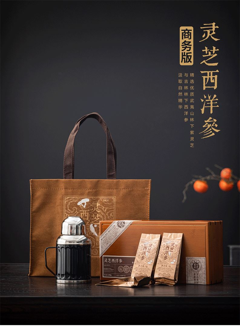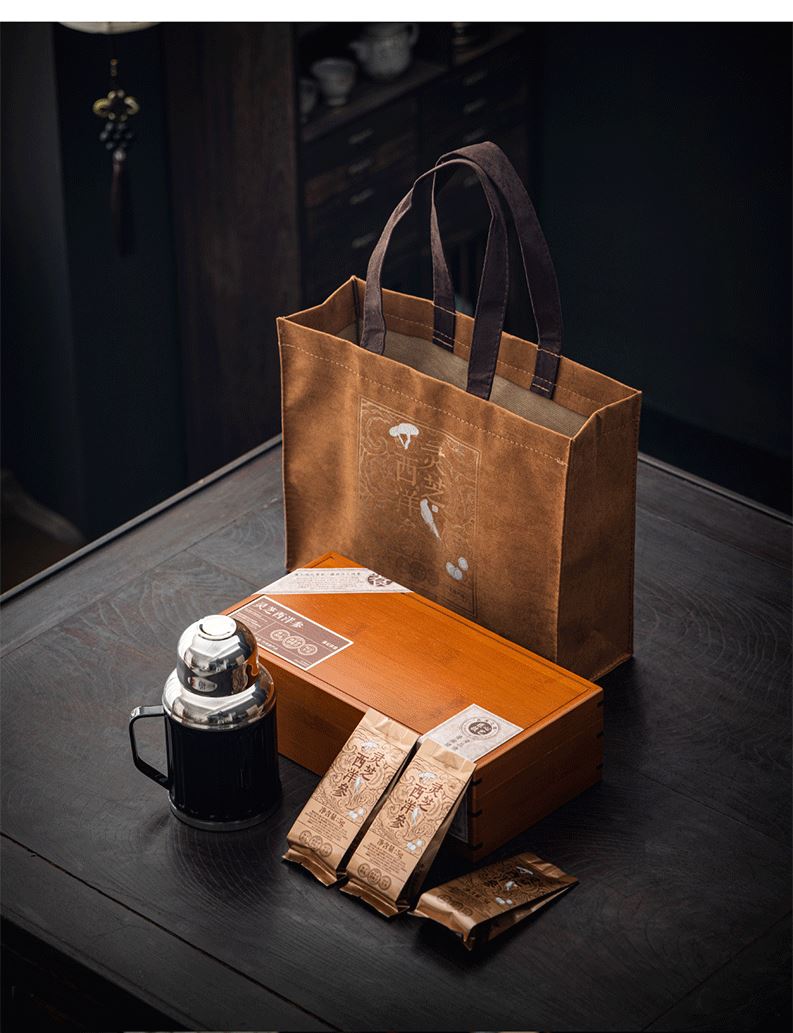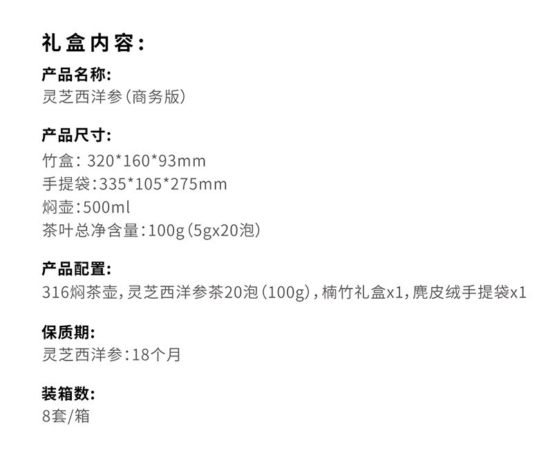 产品尺寸: 竹盒:320*160*93mm 手提袋:335*105*275mm 焖壶:500ml 茶叶总净含量:100g(5gx20泡) 产品配置: 316焖茶壶,灵芝西洋参茶20泡(100g), 楠竹礼盒x1,皮绒手提袋x1