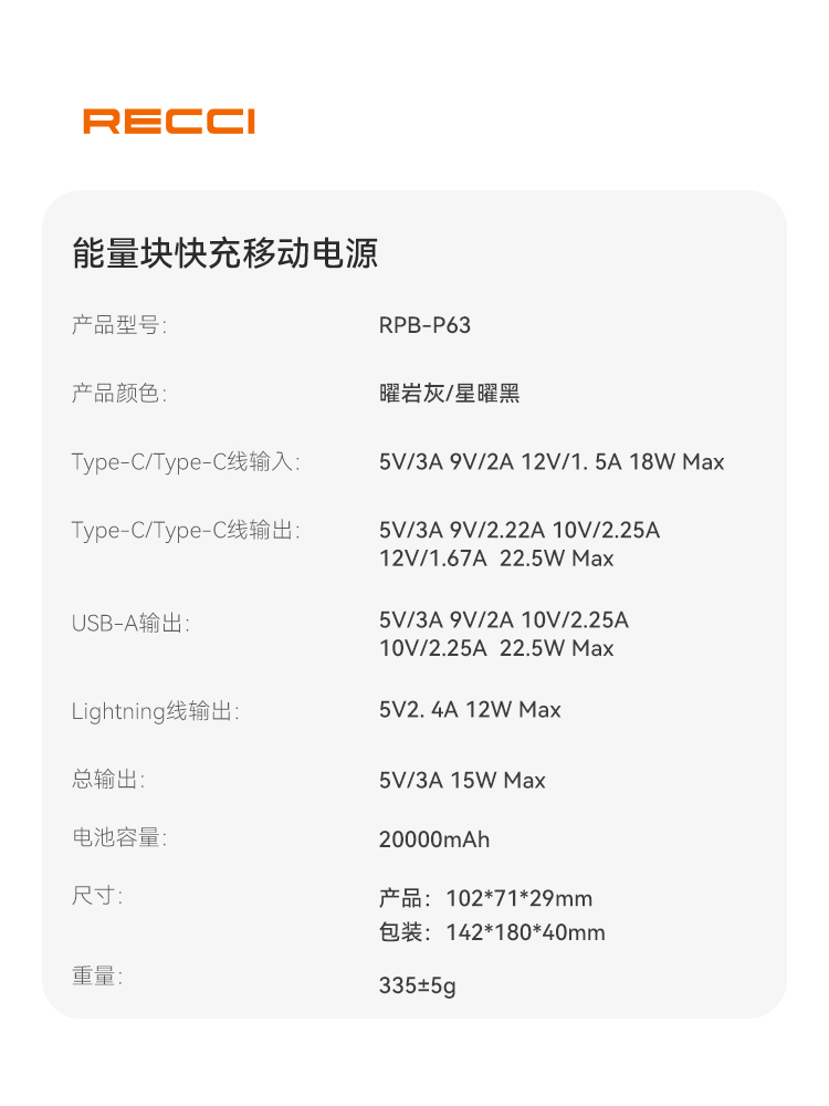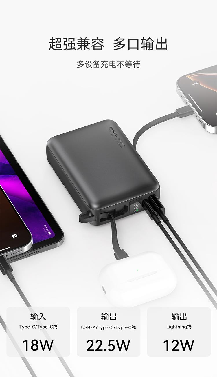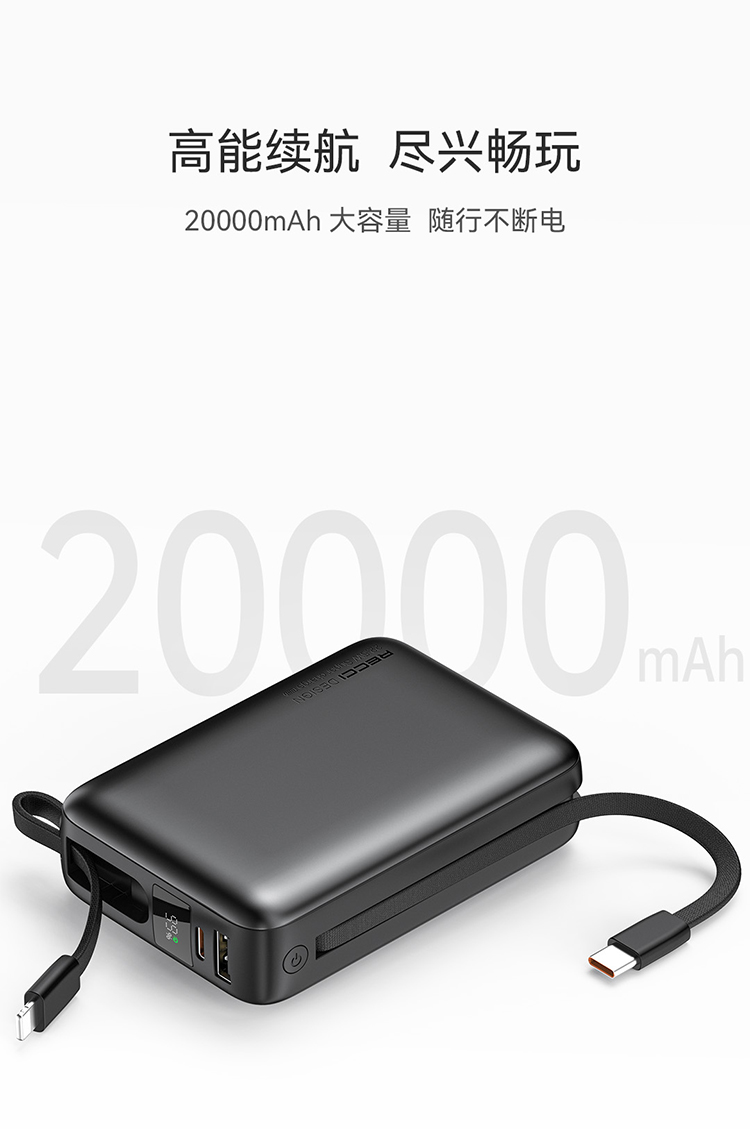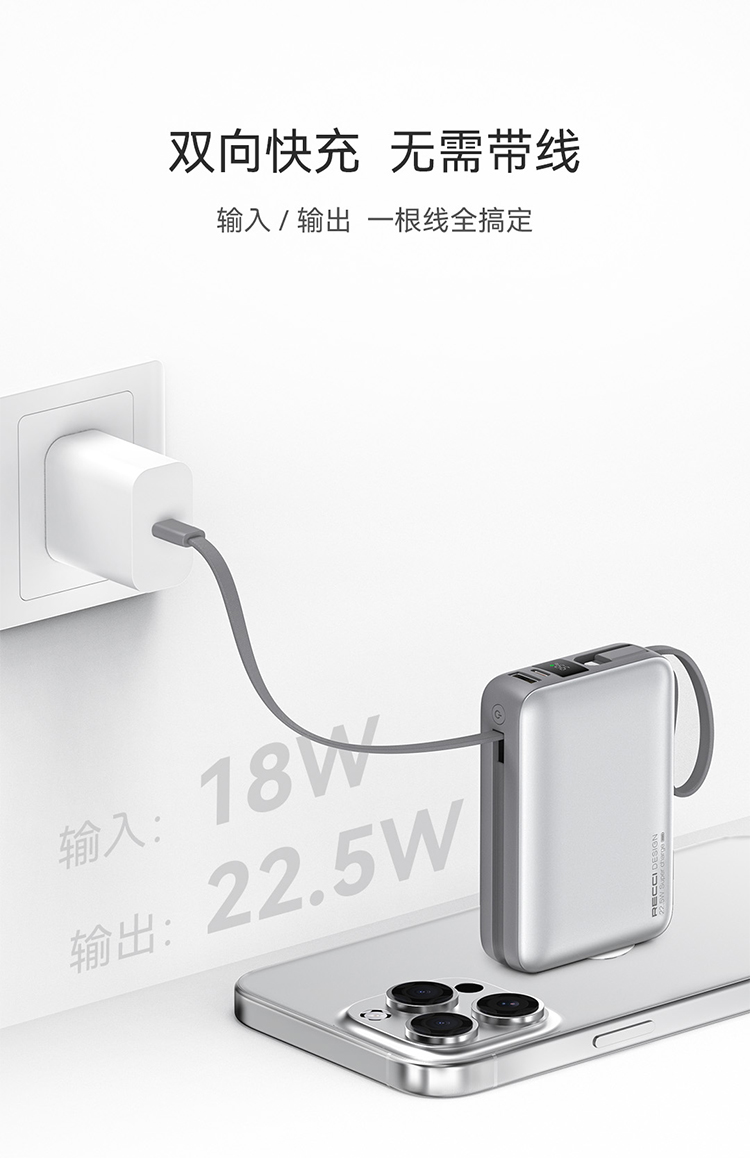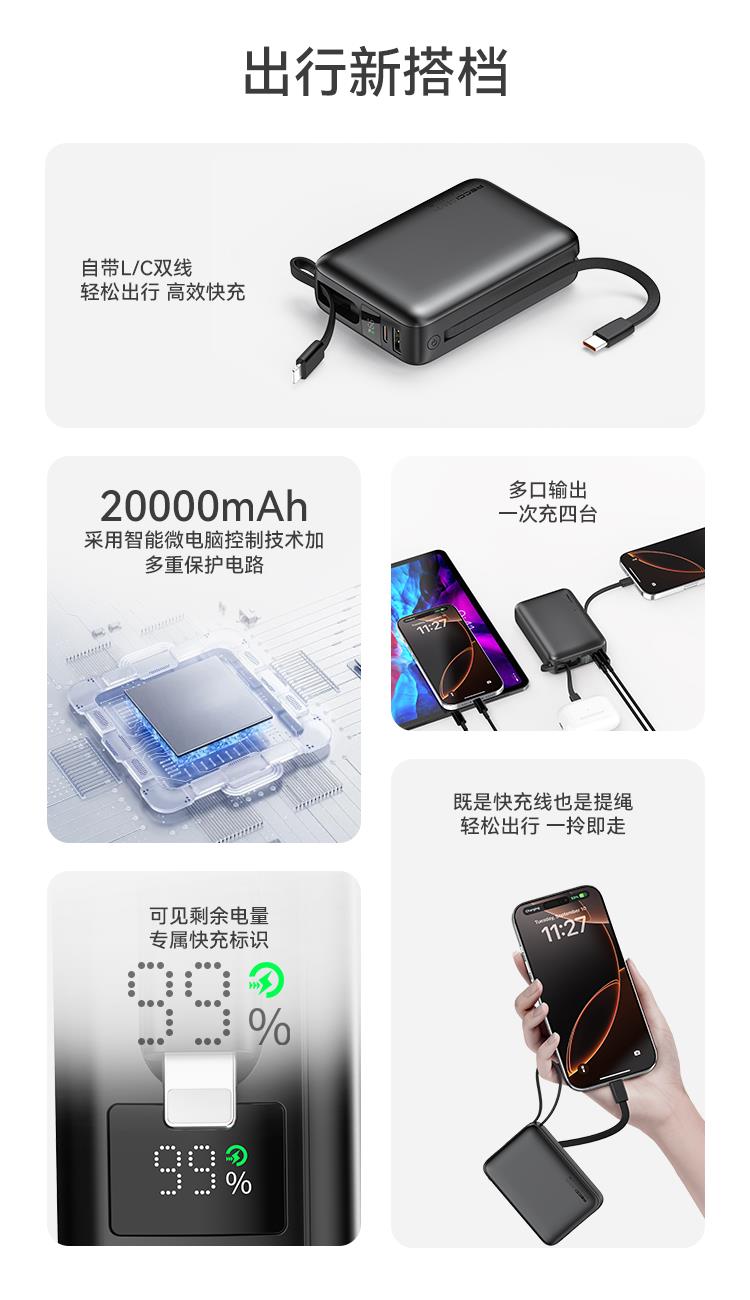 1、金属烤漆 2、C线支持双向22.5W快充 3、20000毫安大容量移动电源,小巧便捷。 4、符合3C安全标准,可携带登机 5、超强兼容多口输出,多设备充电不等待 6、双向快充 无需带线 输入/输出一根线全搞定 7、便携手提线一拎即走 快充线提拉设计可挂可拎