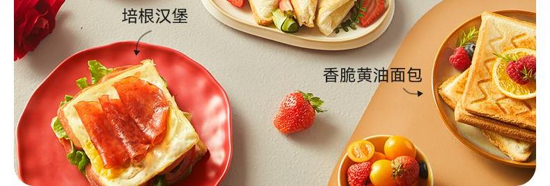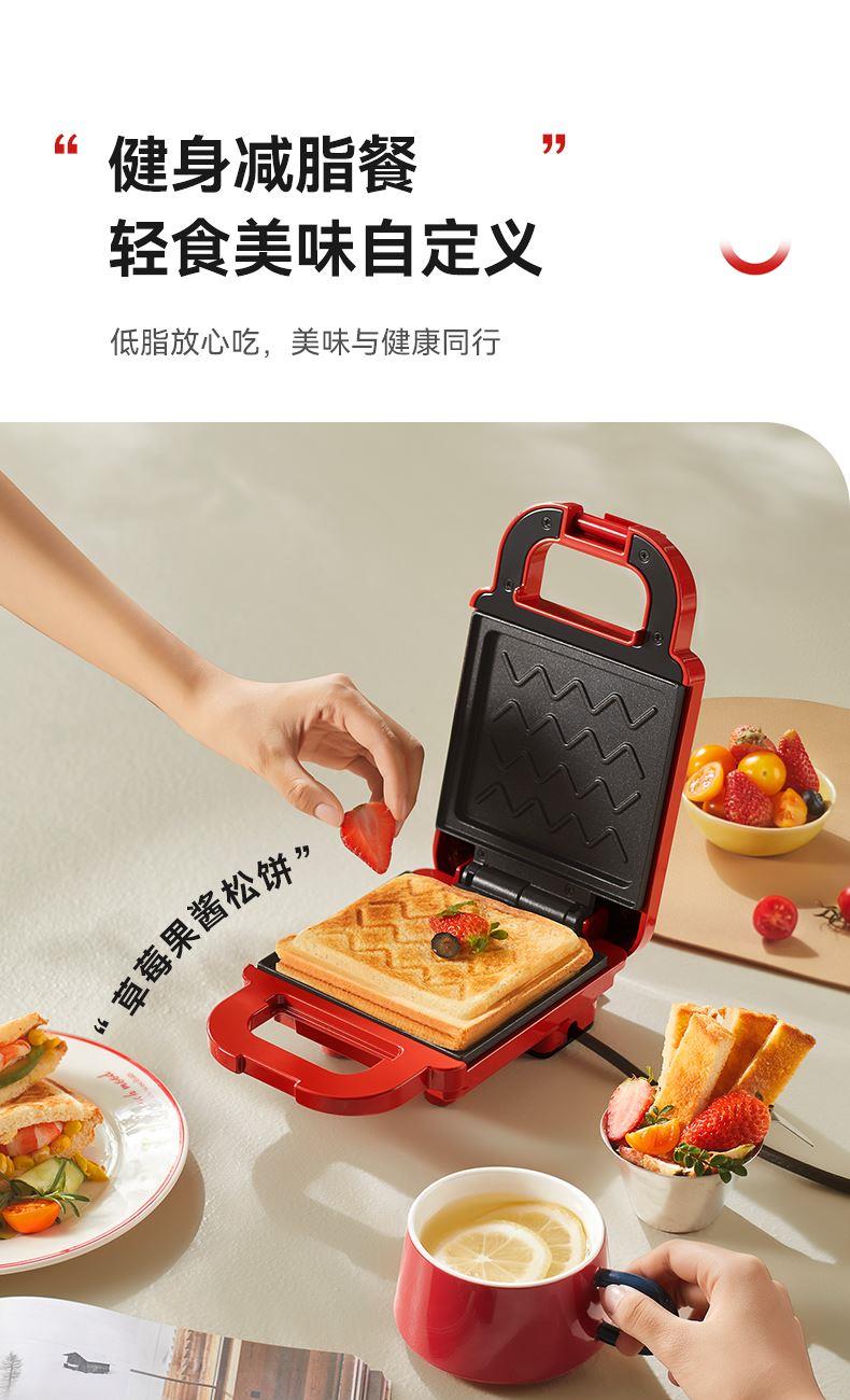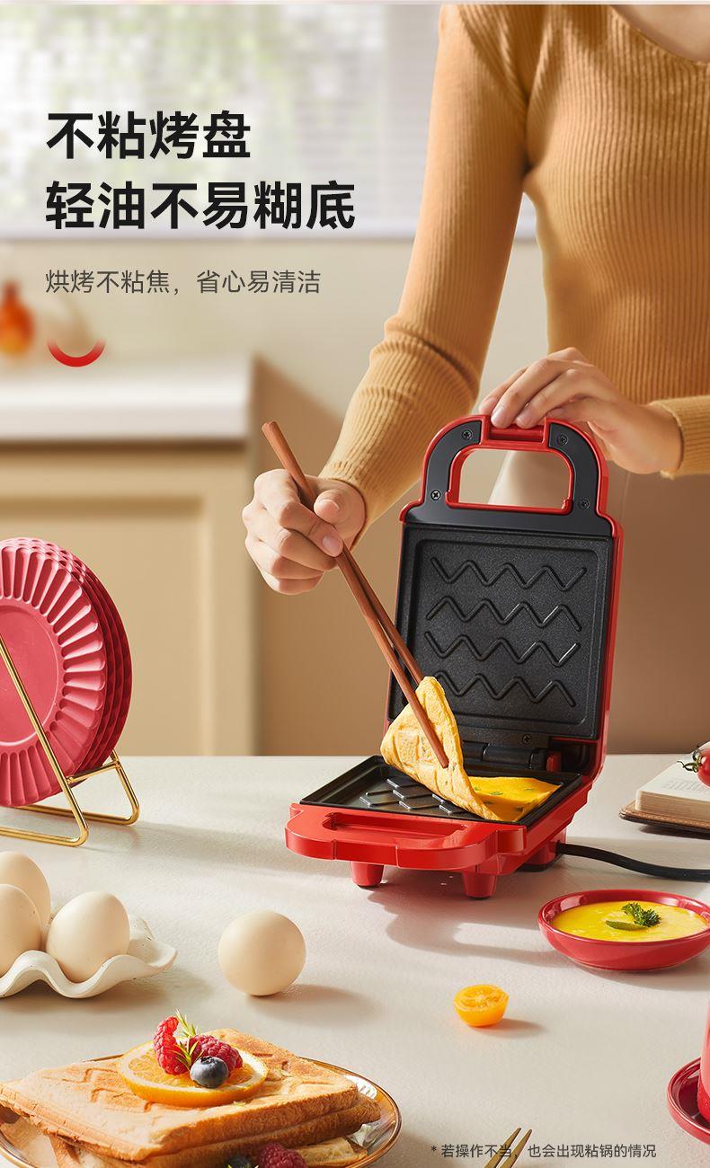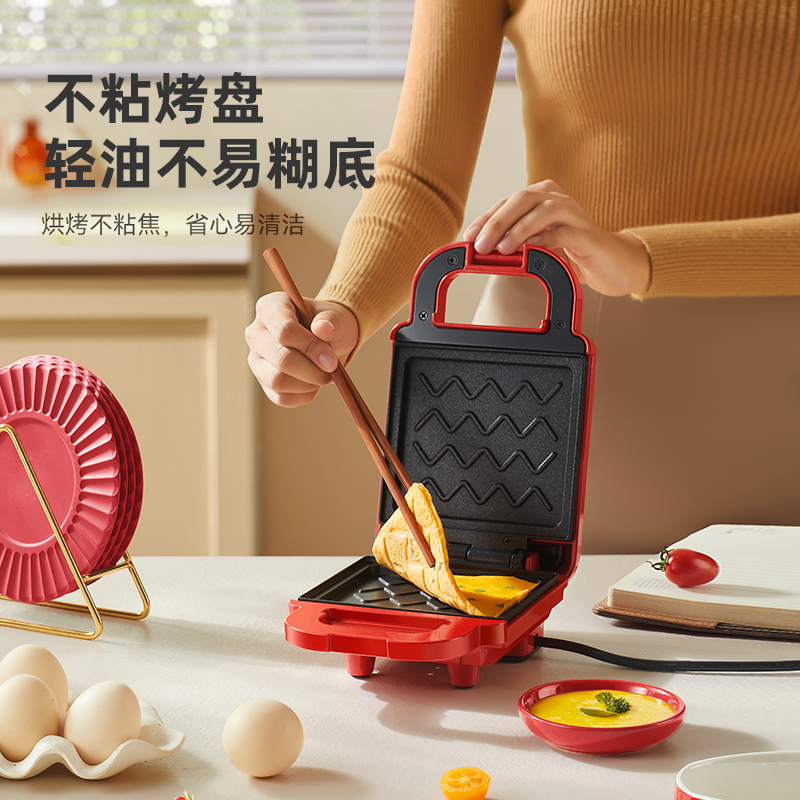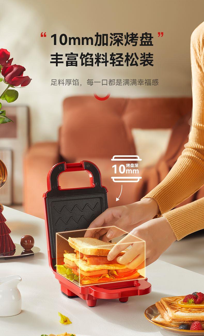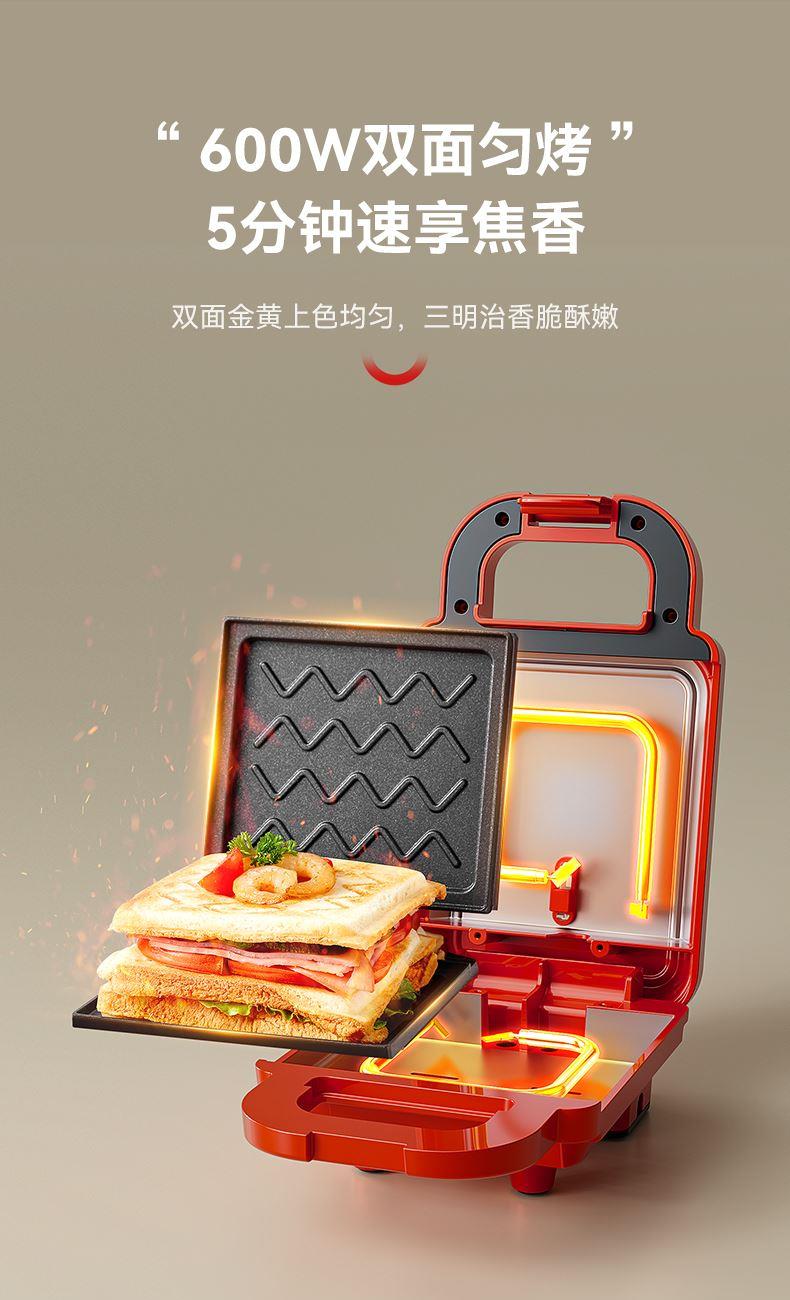 产品净重:0.85KG 产品毛重:1.03KG 额定功率 :600W 额定电压:220v~ 内含:主机x1、电源线x1、说明书x1 1.大功率600W双面烤3分钟快速早餐 ,焦香三明治手到擒来; 2.配置加深10mm烤盘,可容纳更多馅料, 自动封边不会散; 3.不粘烤盘,不易糊底 ,煎鸡蛋无油也不粘 ,使用简单轻松; 4.收纳方便,能卧能立 ,萌趣小巧宛如手提包 ,不占空间。