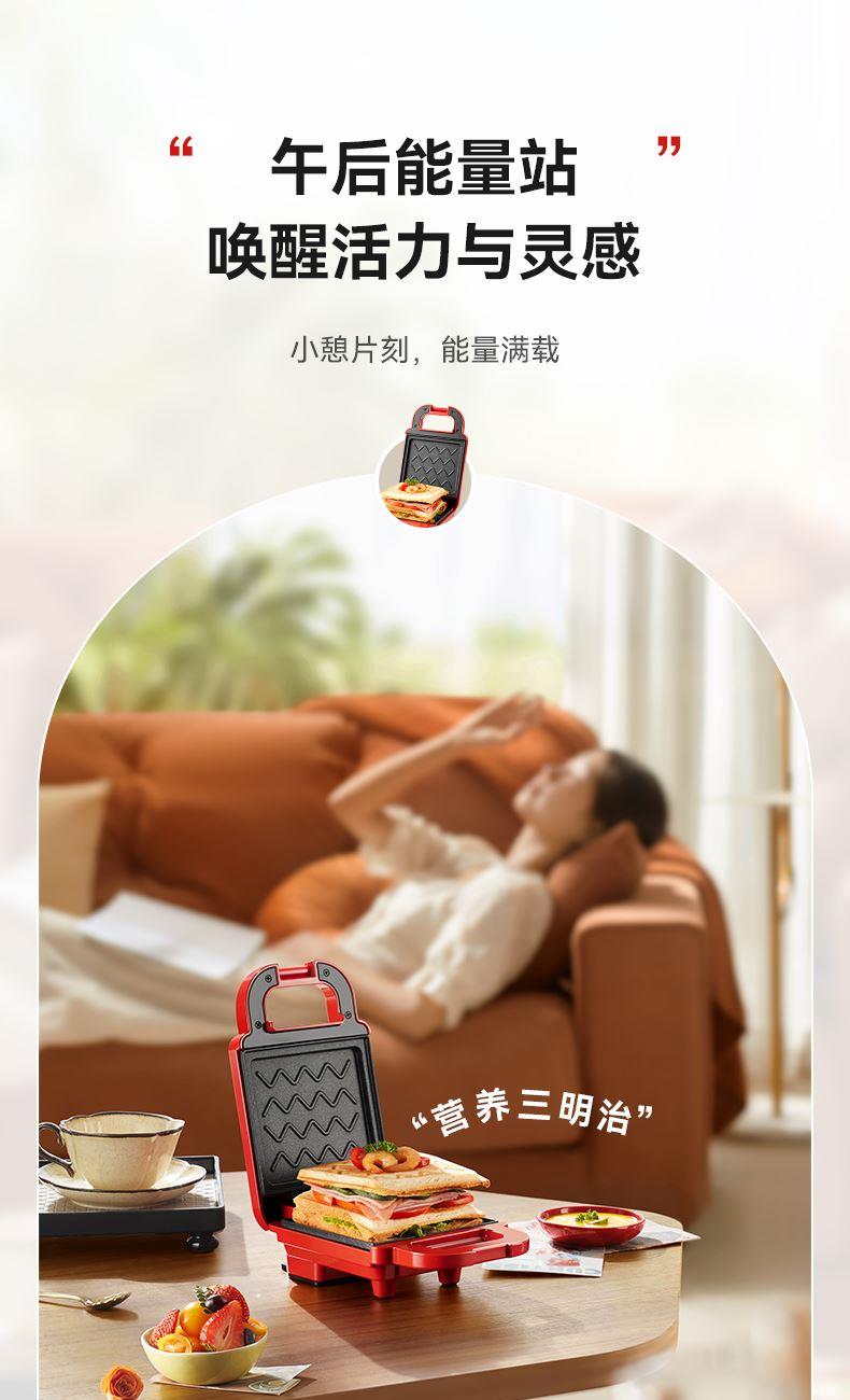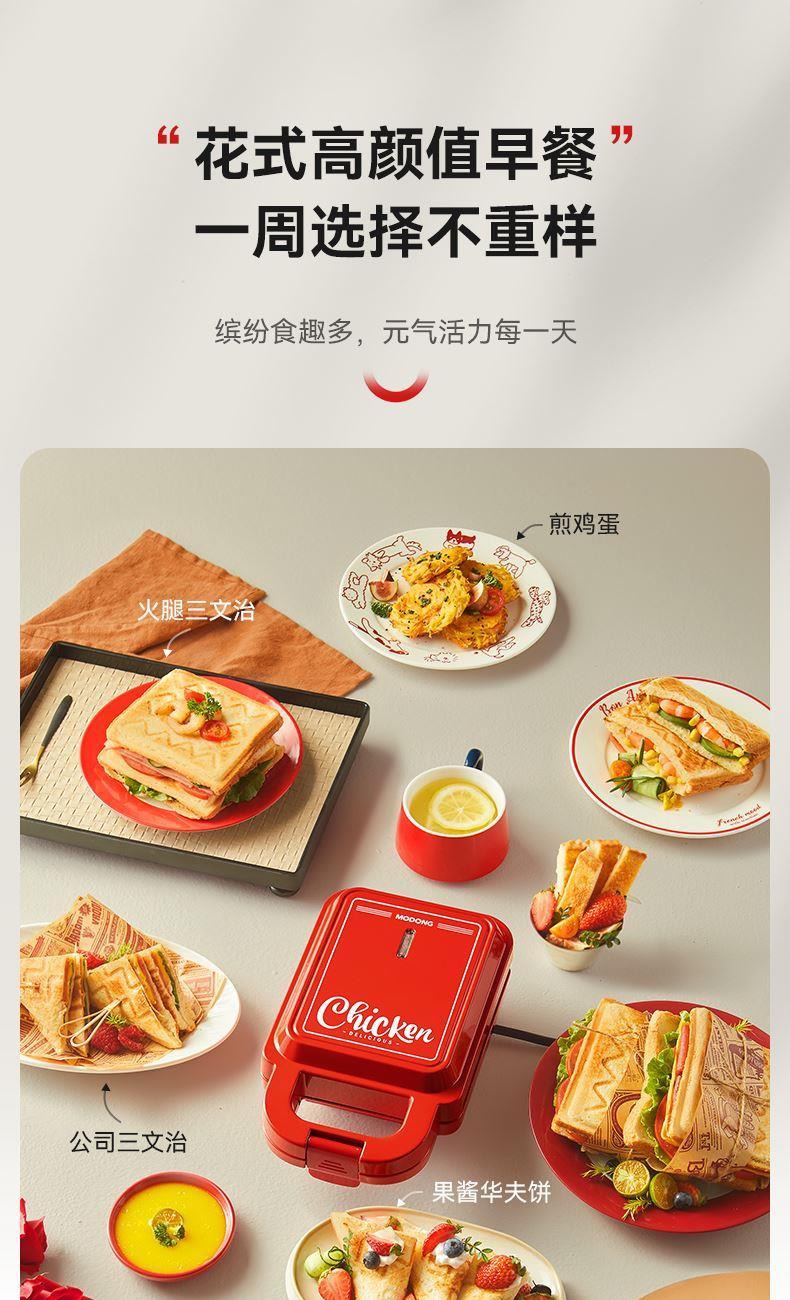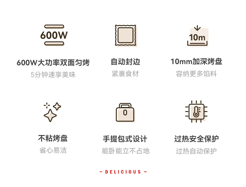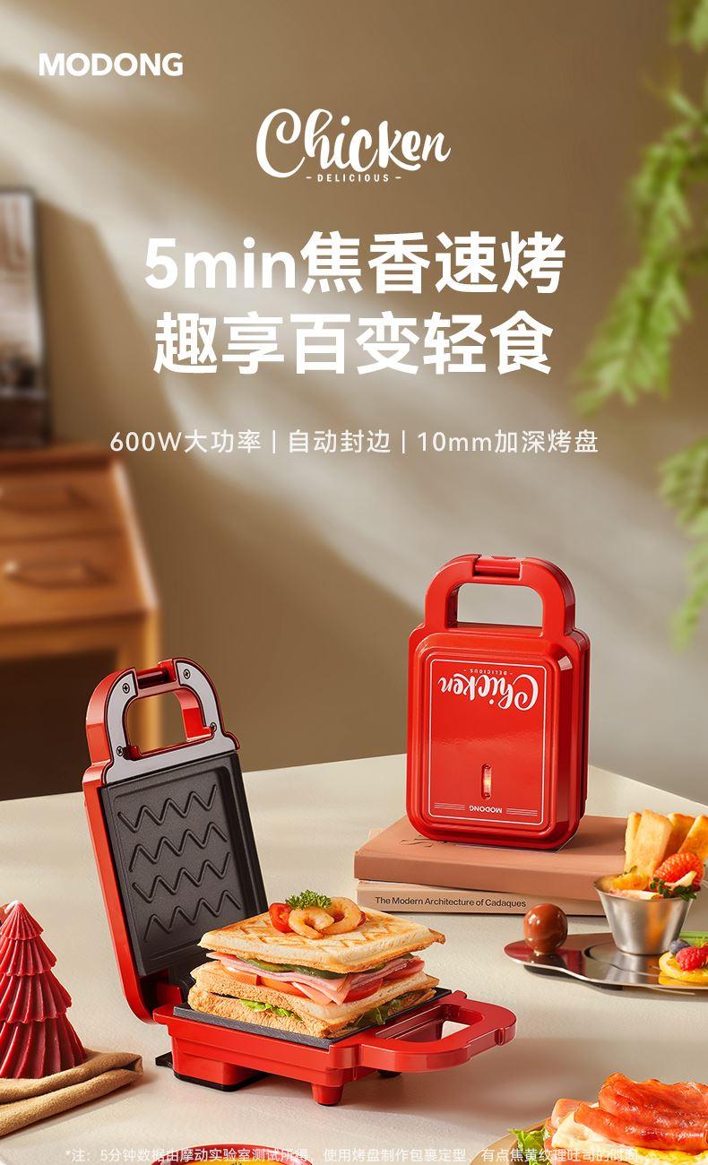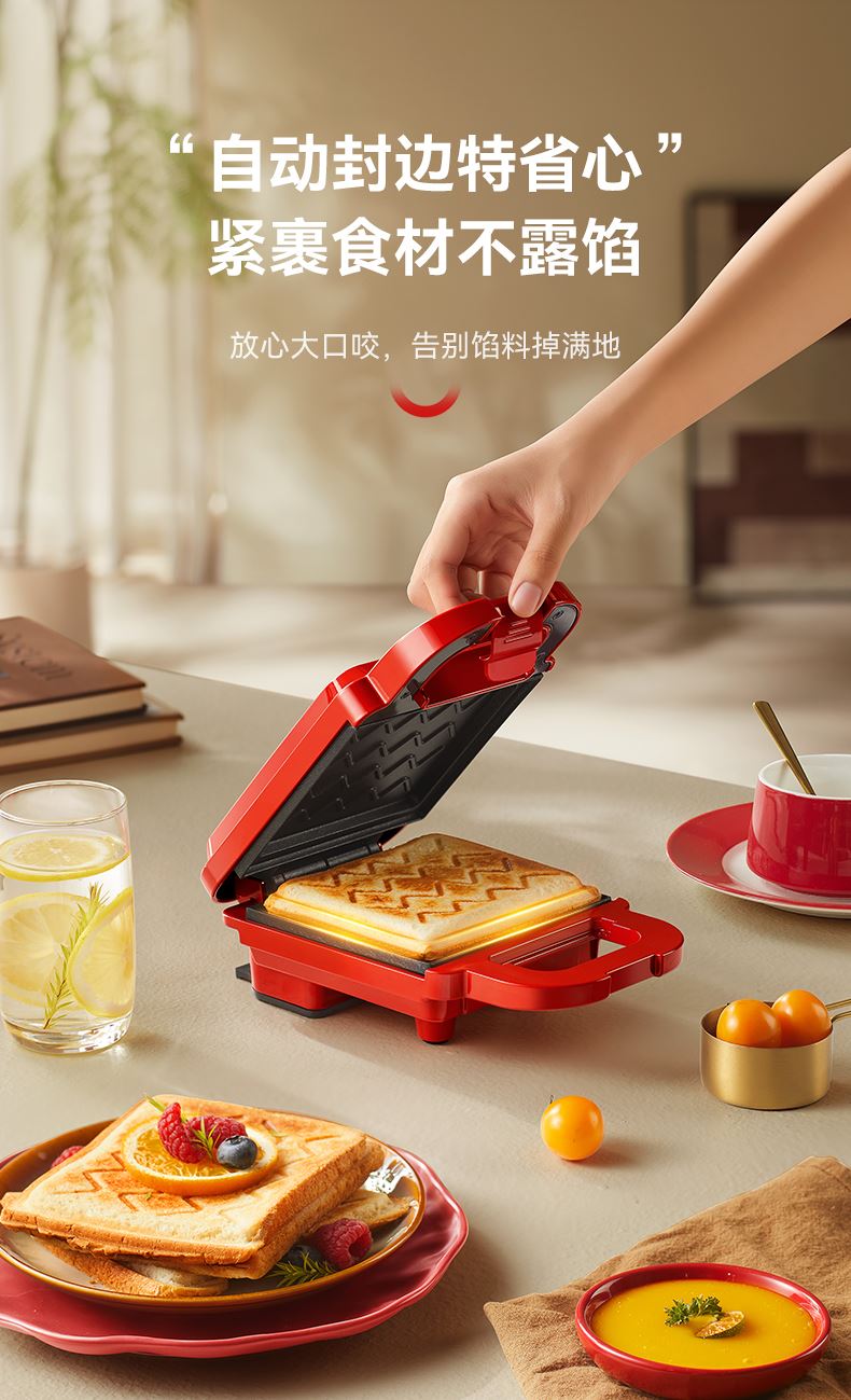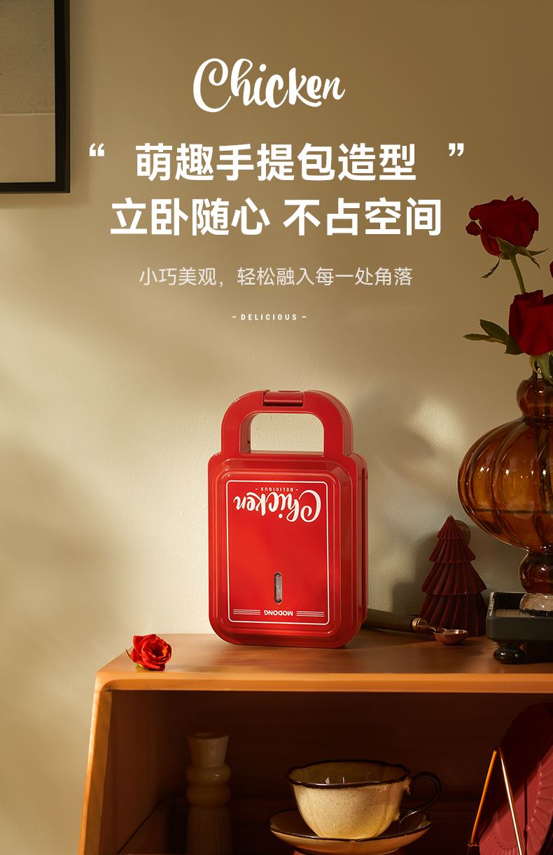 产品净重:0.85KG 产品毛重:1.03KG 额定功率 :600W 额定电压:220v~ 内含:主机x1、电源线x1、说明书x1 1.大功率600W双面烤3分钟快速早餐 ,焦香三明治手到擒来; 2.配置加深10mm烤盘,可容纳更多馅料, 自动封边不会散; 3.不粘烤盘,不易糊底 ,煎鸡蛋无油也不粘 ,使用简单轻松; 4.收纳方便,能卧能立 ,萌趣小巧宛如手提包 ,不占空间。