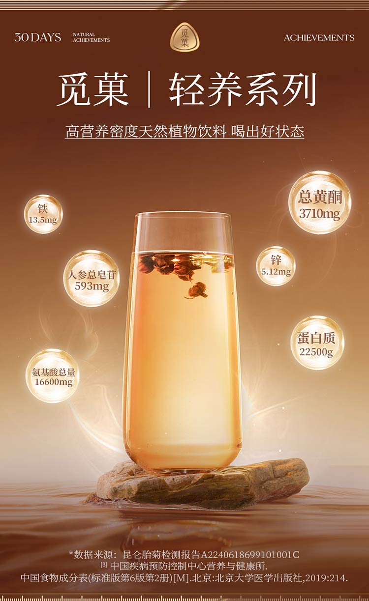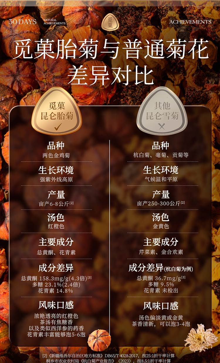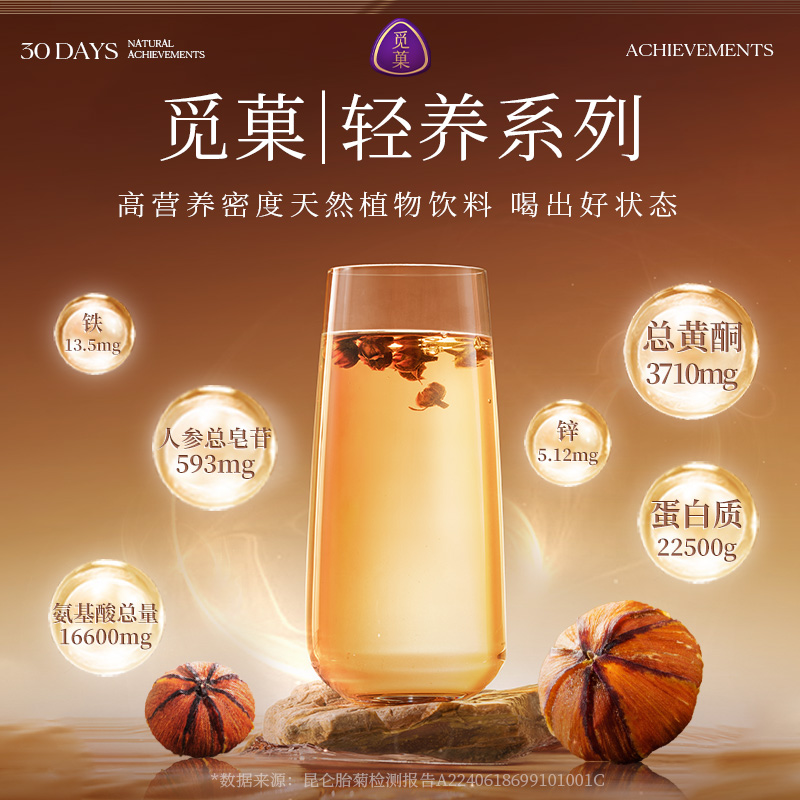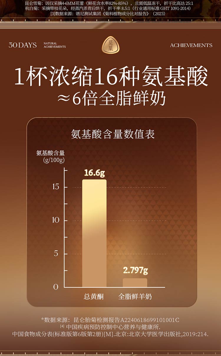 生来高贵 源自新疆克里阳 雪菊之乡 天然菊香 只选头序花蕾初开嫩芽 菊香未散 ,隐于花苞 留存更多天然活性物质 富含营养 1杯泡饮浓缩16种氨基酸 ≈6倍全脂鲜奶