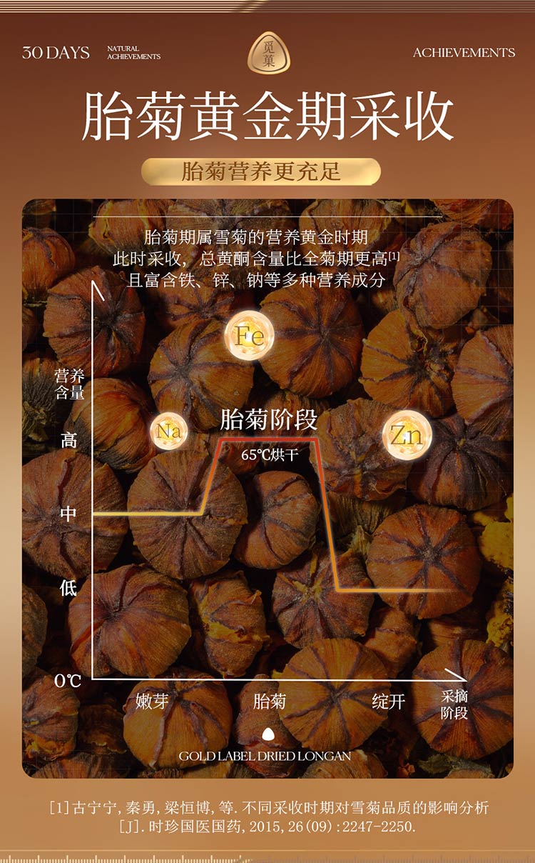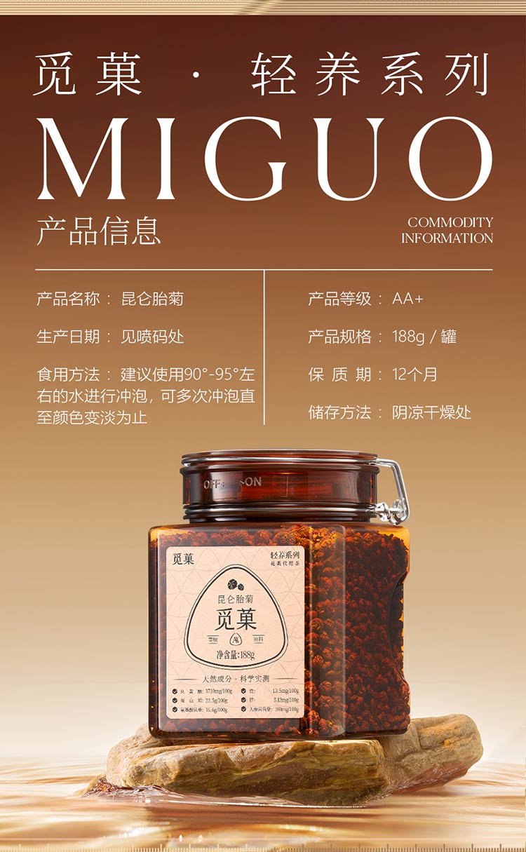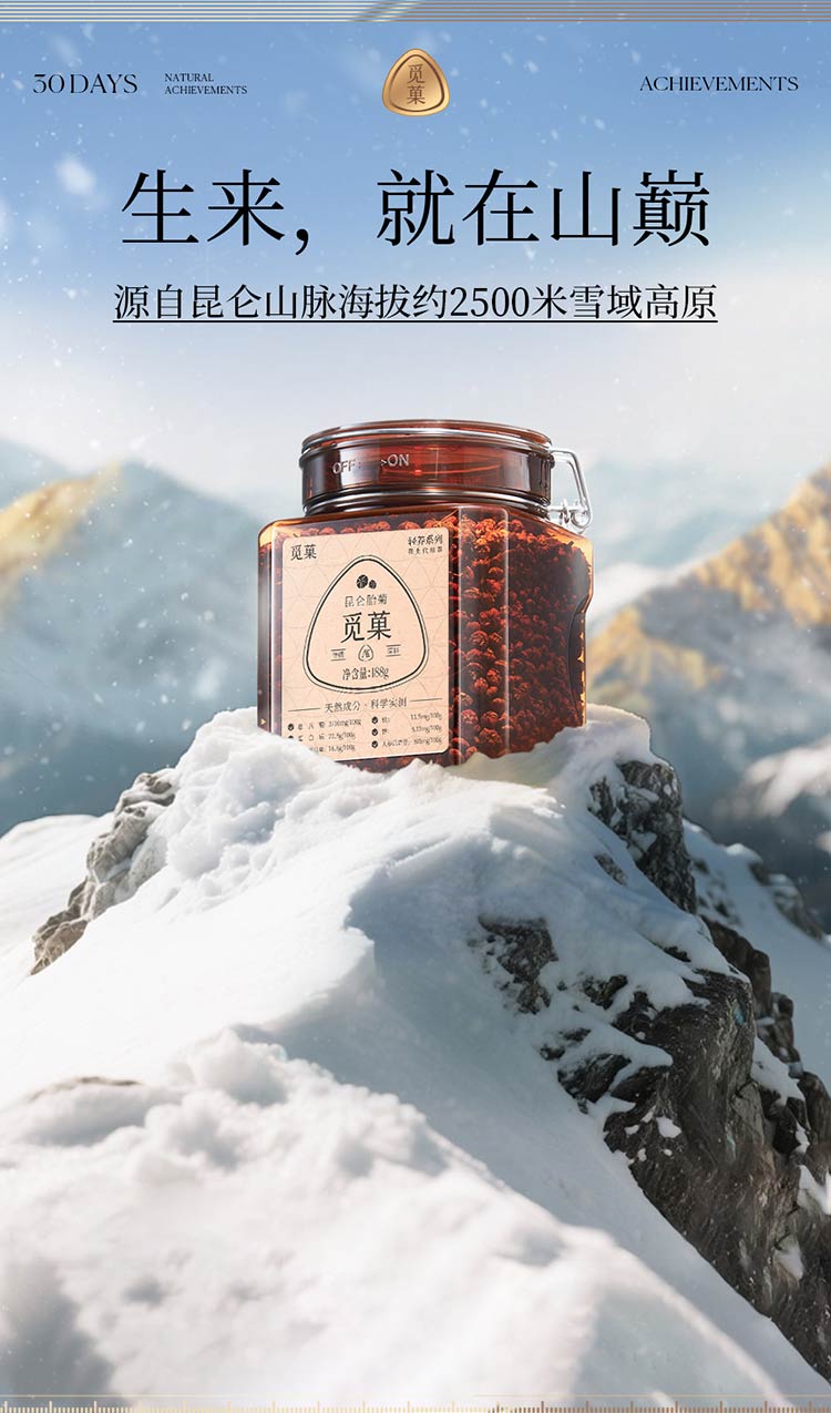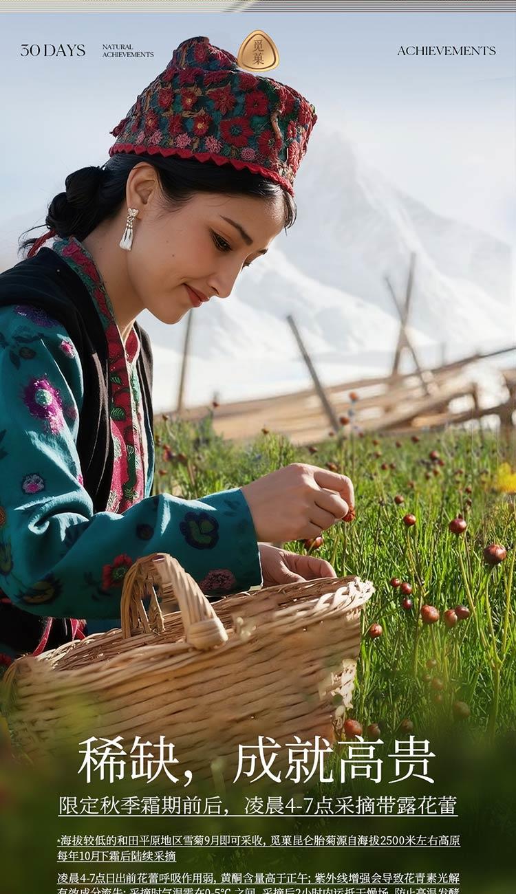 生来高贵 源自新疆克里阳 雪菊之乡 天然菊香 只选头序花蕾初开嫩芽 菊香未散 ,隐于花苞 留存更多天然活性物质 富含营养 1杯泡饮浓缩16种氨基酸 ≈6倍全脂鲜奶