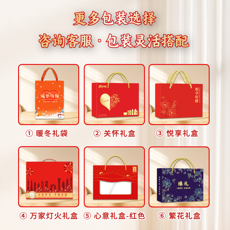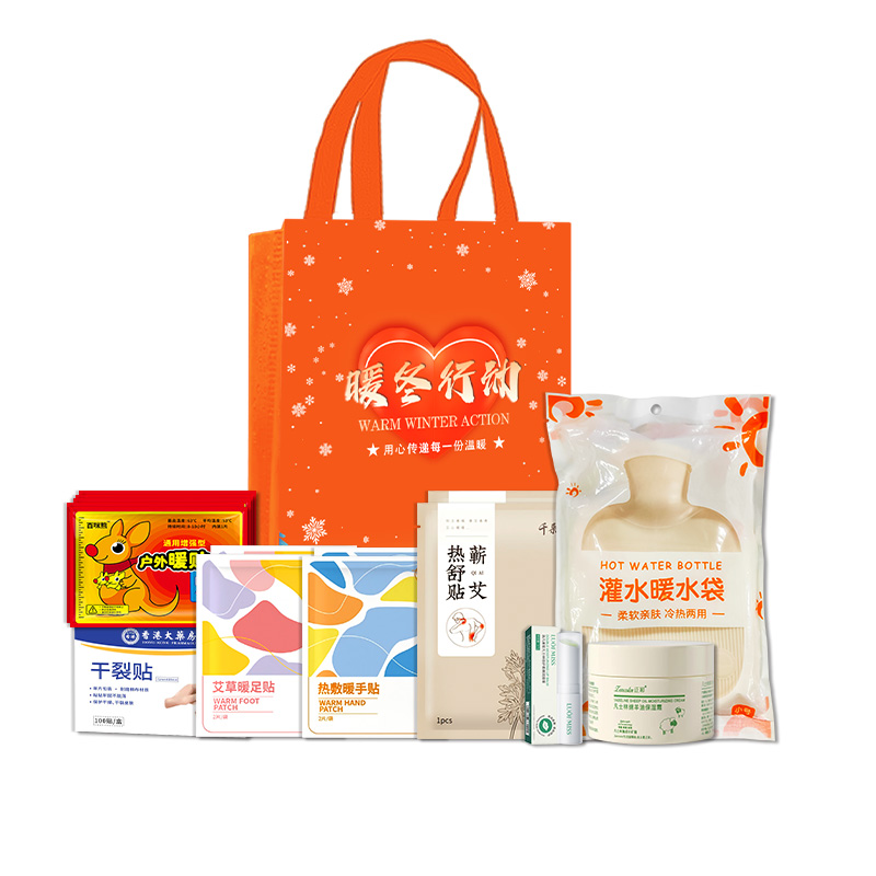 礼袋尺寸:20*27*10cm 包装尺寸:66* 45*51 CM 产品配置:(香型随机) 暖宝宝(1片装/袋)*5袋 暖手贴(2片装/袋)*2袋 热舒贴(2片装/袋)*2袋 暖足贴(2片装/袋)*2袋 暖水袋500ml 香港大药房手足干裂贴(100贴) 凡士林润唇膏2.7g 凡士林保湿霜140g 精美礼袋