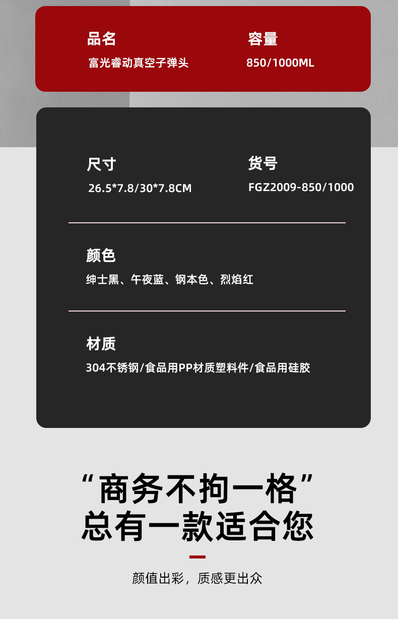 容量:1000ml 尺寸:78*30cm 颜色: 白色 黑色 红色 蓝色 纯本色 材质:304奥氏体不锈钢内胆、食品级PP,PC配件 包装:单瓦盒