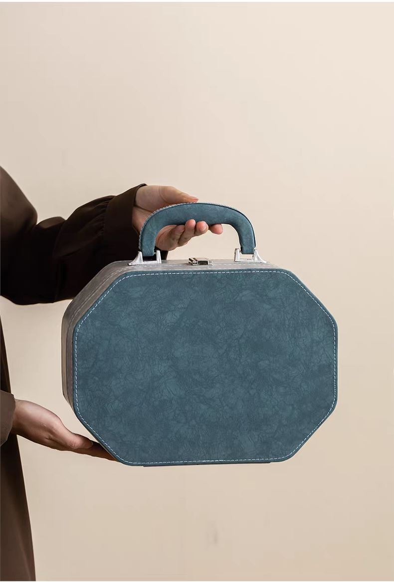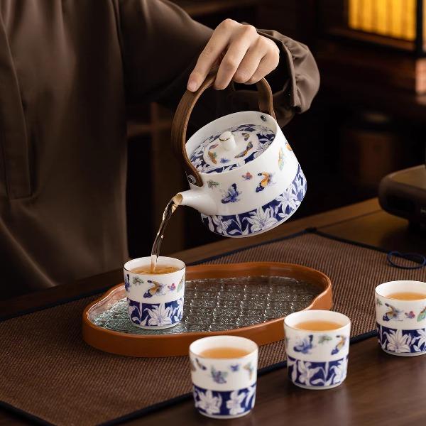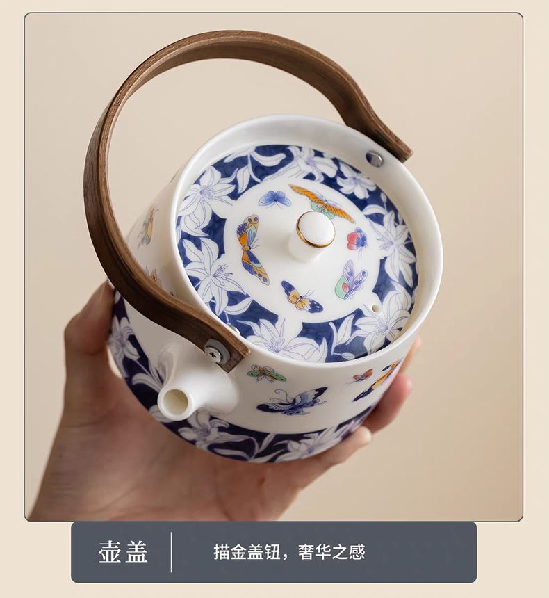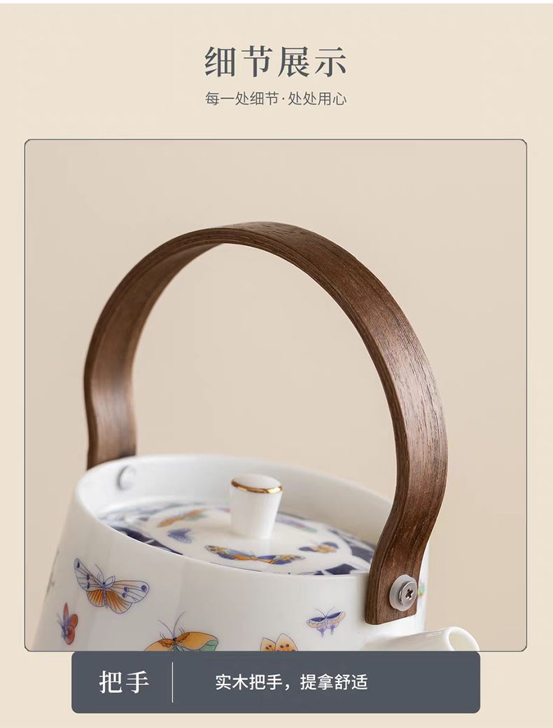 配置:提梁壶长度14.2cm高度17cm 容量500ml, 茶杯长度6.2cm高度6cm 容量100ml, 茶盘长度29cm宽度20.5cm高度2.2cm, 礼盒长度30cm宽度22cm。高度12cm