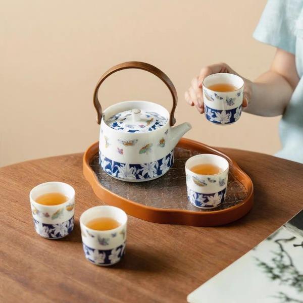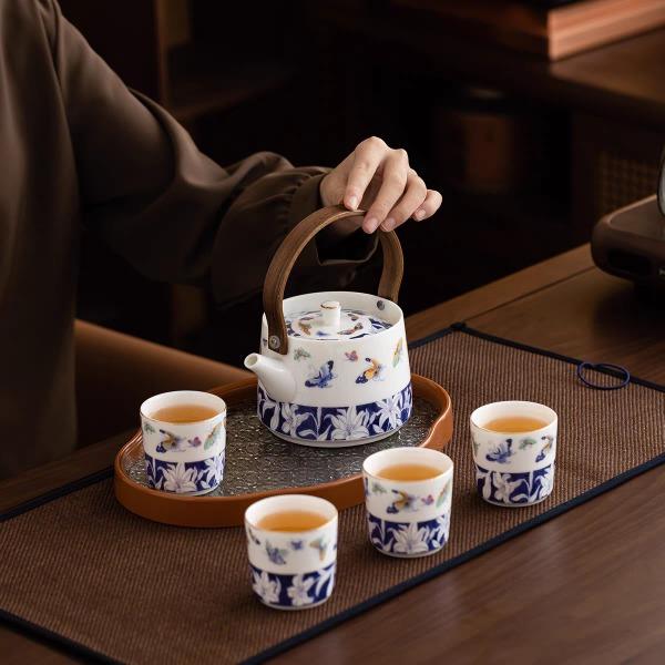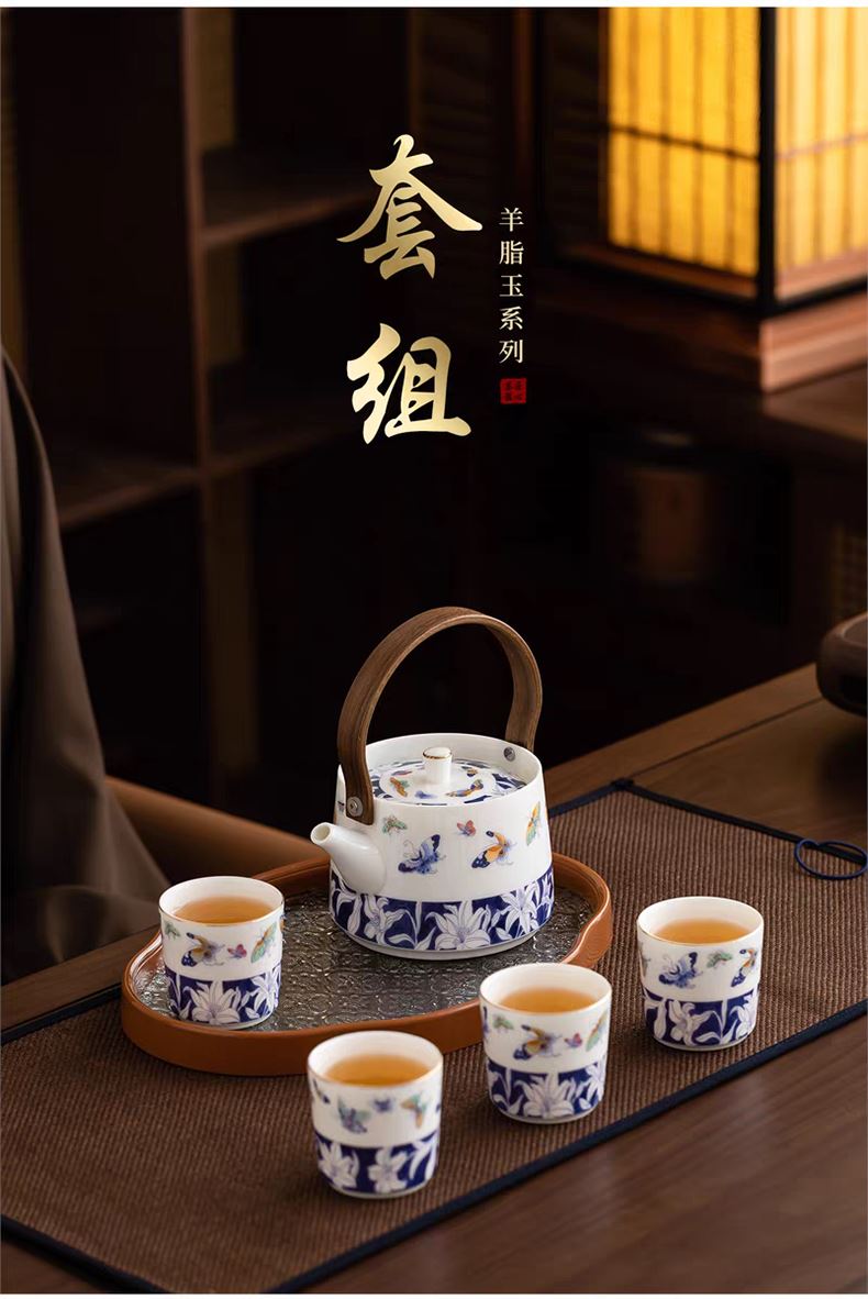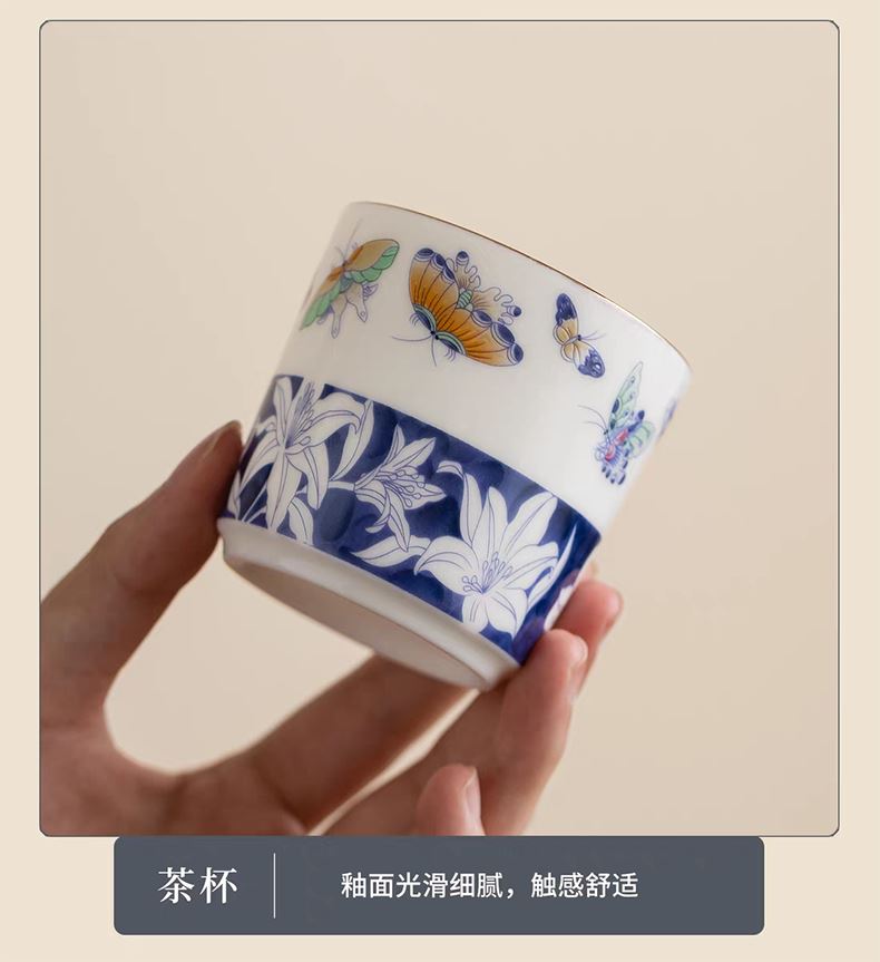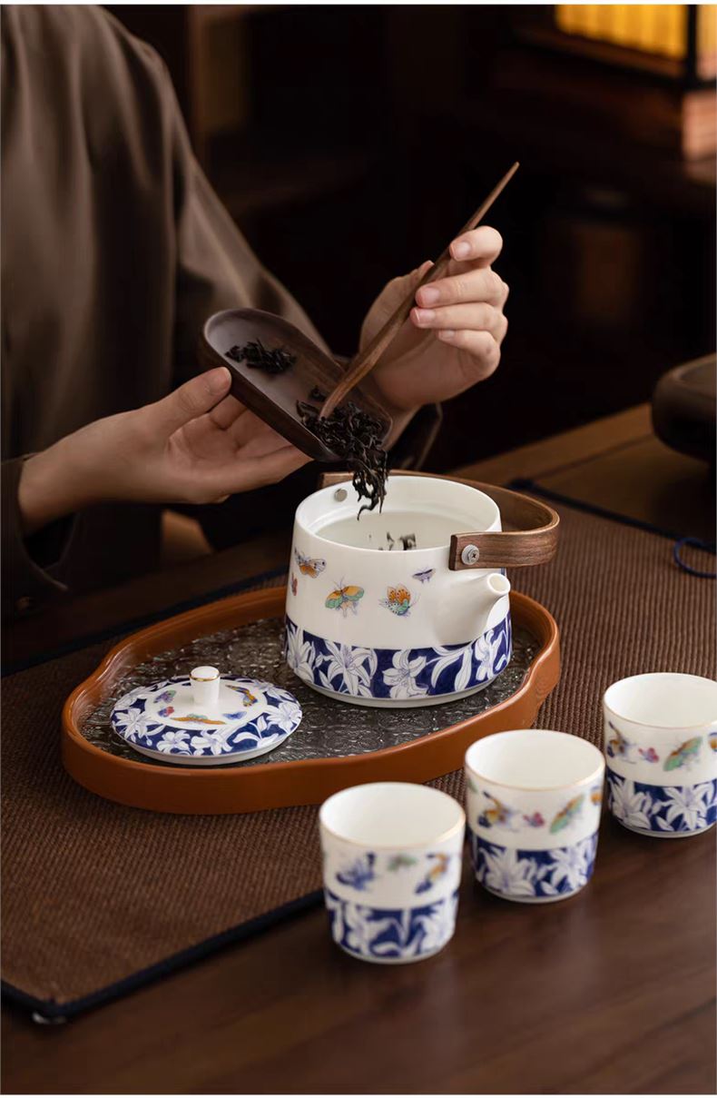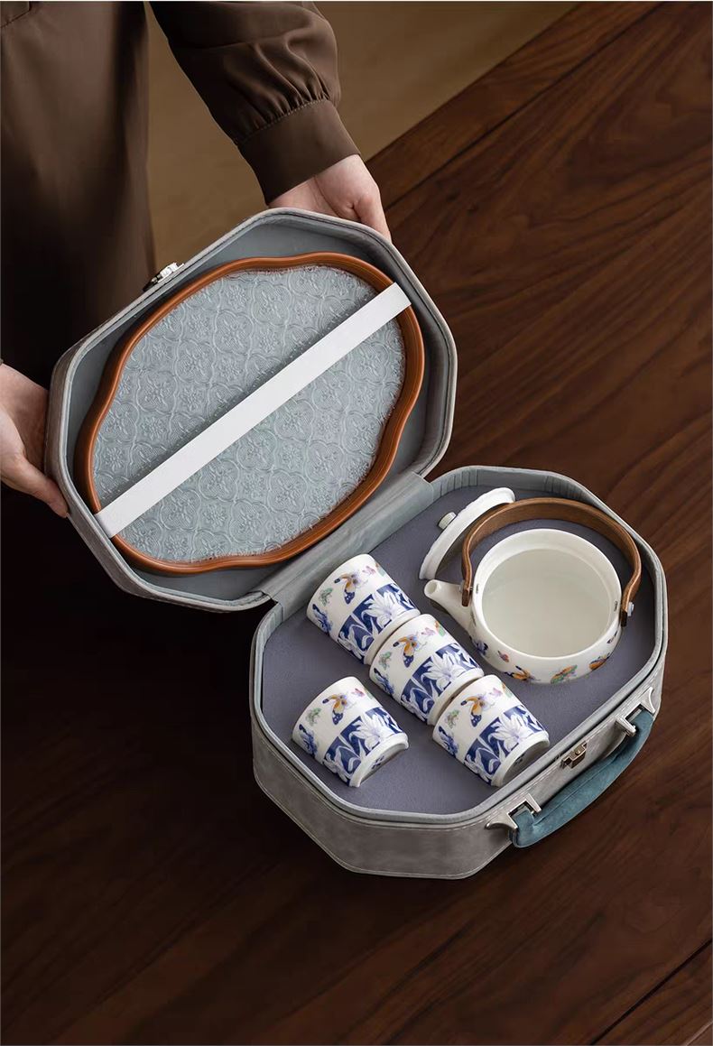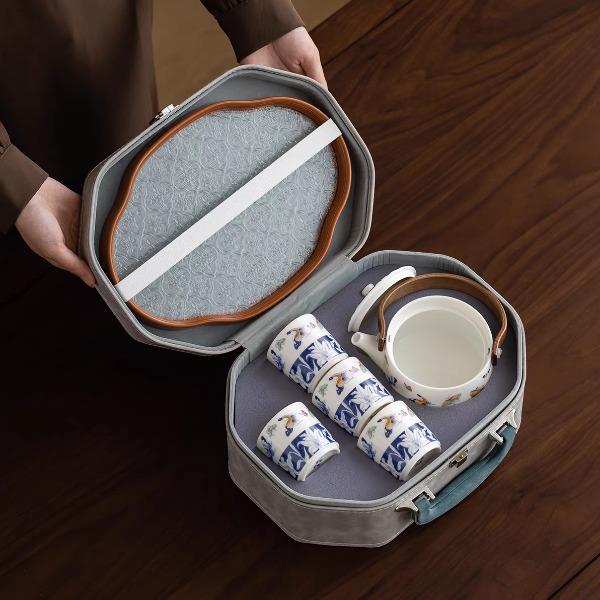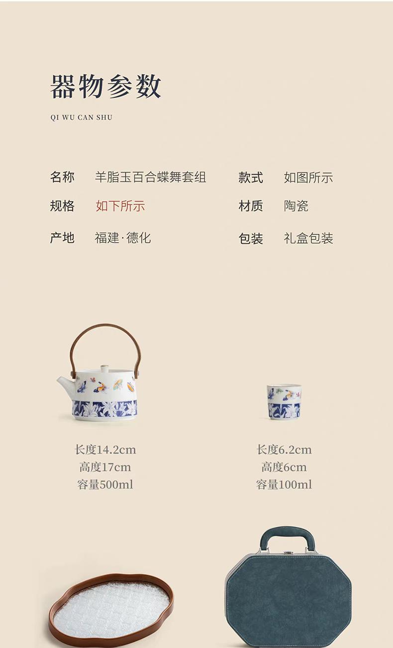 尾桥下窑青花百合蝶舞旅行茶具套装羊脂玉瓷茶具伴手礼年会礼品