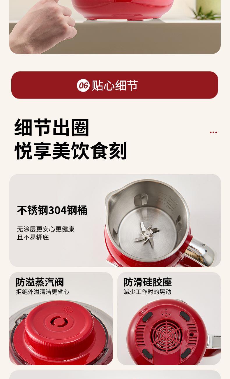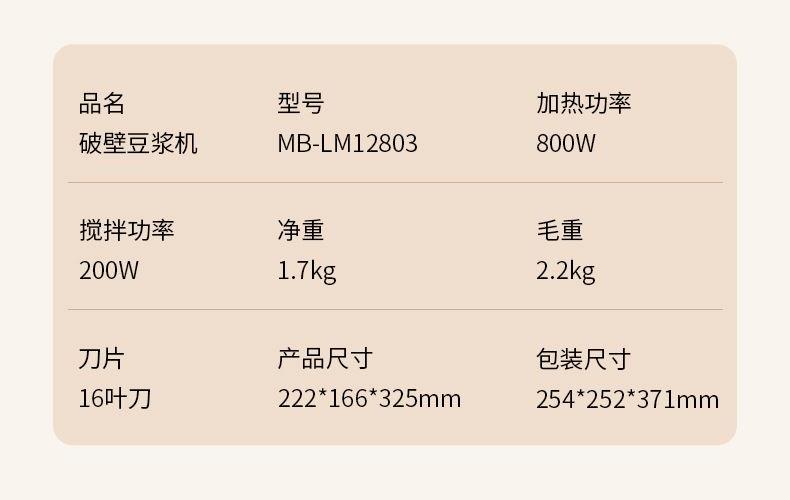 产品参数: 产品容量:1.2L 额定电压:220V~ 额定频率:50Hz 加热功率:800W 搅拌功率:200W 毛净重:2.2/1.82kg 产品尺寸:222*166*325(mm) 彩盒尺寸:251x249x368mm 产品卖点: 1. 1.2L大容量,可供1-6人使用。. 16叶精钢刀组,细腻无渣。 2. 24H小时超长智能预约. 8大预设智能菜谱,营养美味不重样。 3. 干豆直打,免泡免滤,便捷香浓无渣。 4. 5430大电机。23000转/分,动力强劲 5. 不锈钢304钢桶,无涂层更安心更健康。 6. 一键清洗,快速便捷。开盖保护,避免机器误操作,安全放心使用。 7. 静音隔音罩设计,隔绝工作噪音。