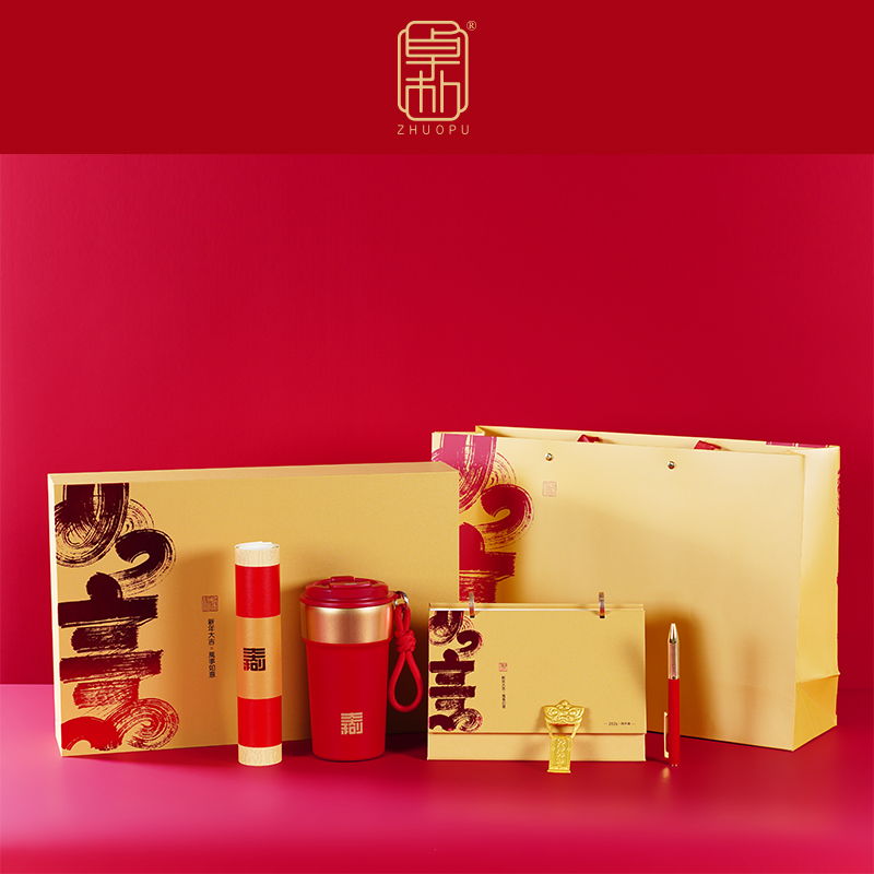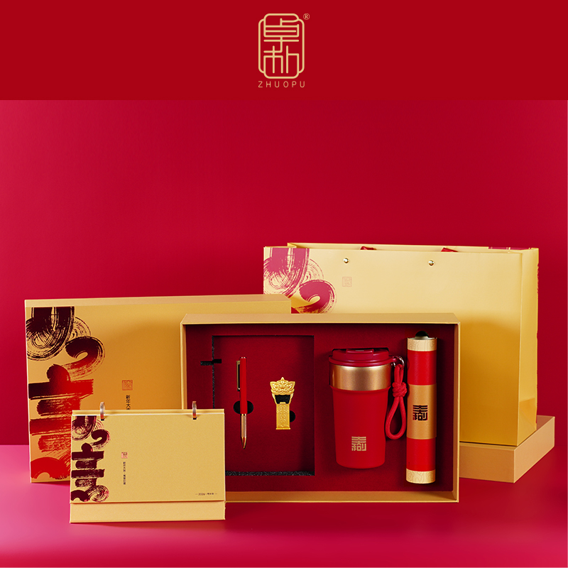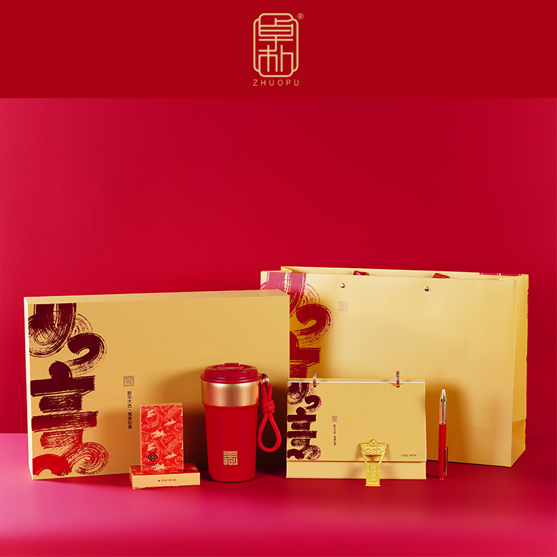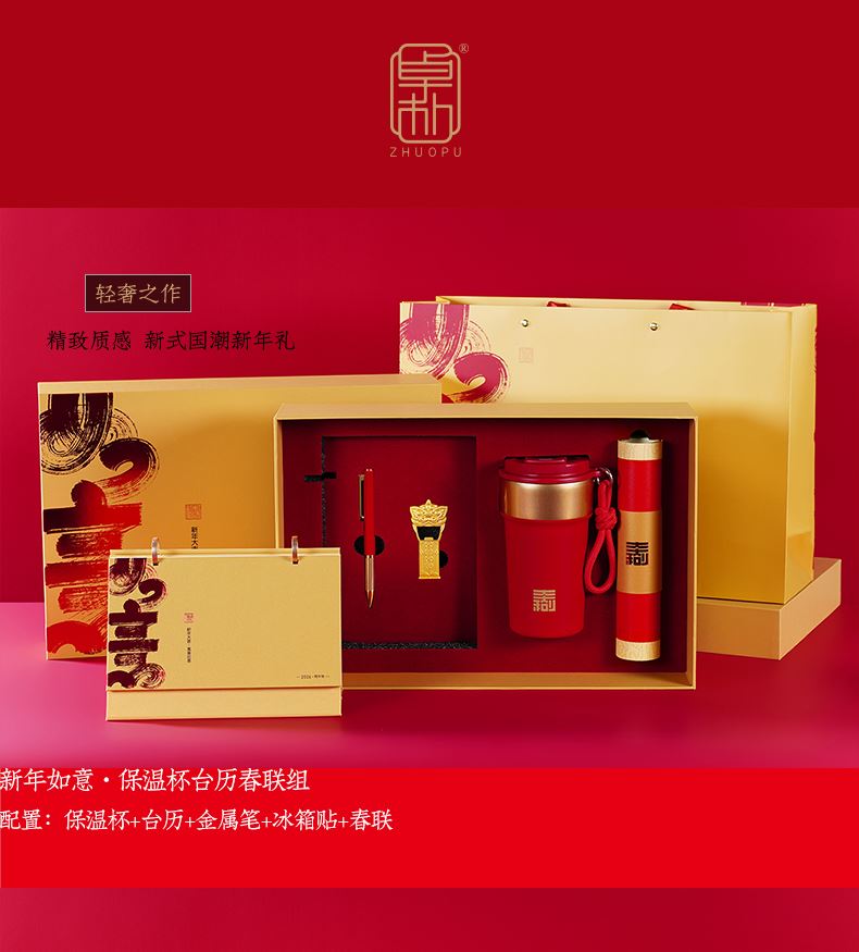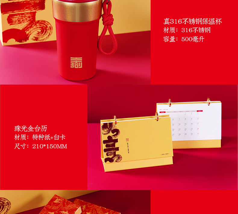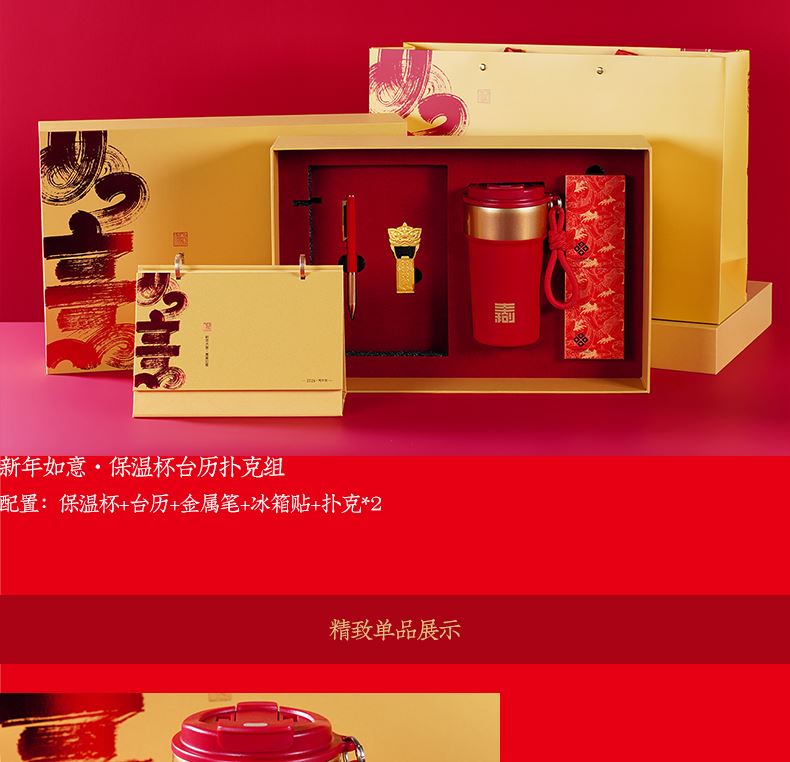 配置:保温杯+台历+签字笔+开瓶器冰箱贴+扑克*2 材质:珠光金纸+白卡+合金+316不锈钢 尺寸:保温杯500mL 台历210*150mm 签字笔138*11mm 冰箱贴80*40mm 扑克99*62mm 包装:珠光金礼盒(400*268*105mm)+手提袋