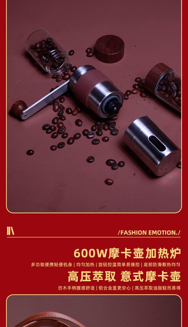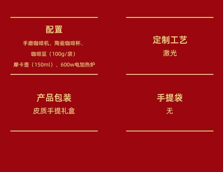 配置 手磨咖啡机*1 意式拼配咖啡豆*1袋(100克) 星空灰色摩卡壶*1 150毫升 约3杯 红色咖啡杯*1说明书*1 600w摩卡壶加热炉*1 尺寸6*14cm 皮质手提礼盒*1 材质 榉木-黑瓷机芯-骨瓷--食品级硅胶- 尺寸 礼盒:247*346*100mm 企业定制-免费/场景呈现/赠送重要人士/私人赠送/随手礼