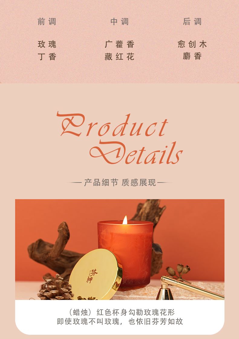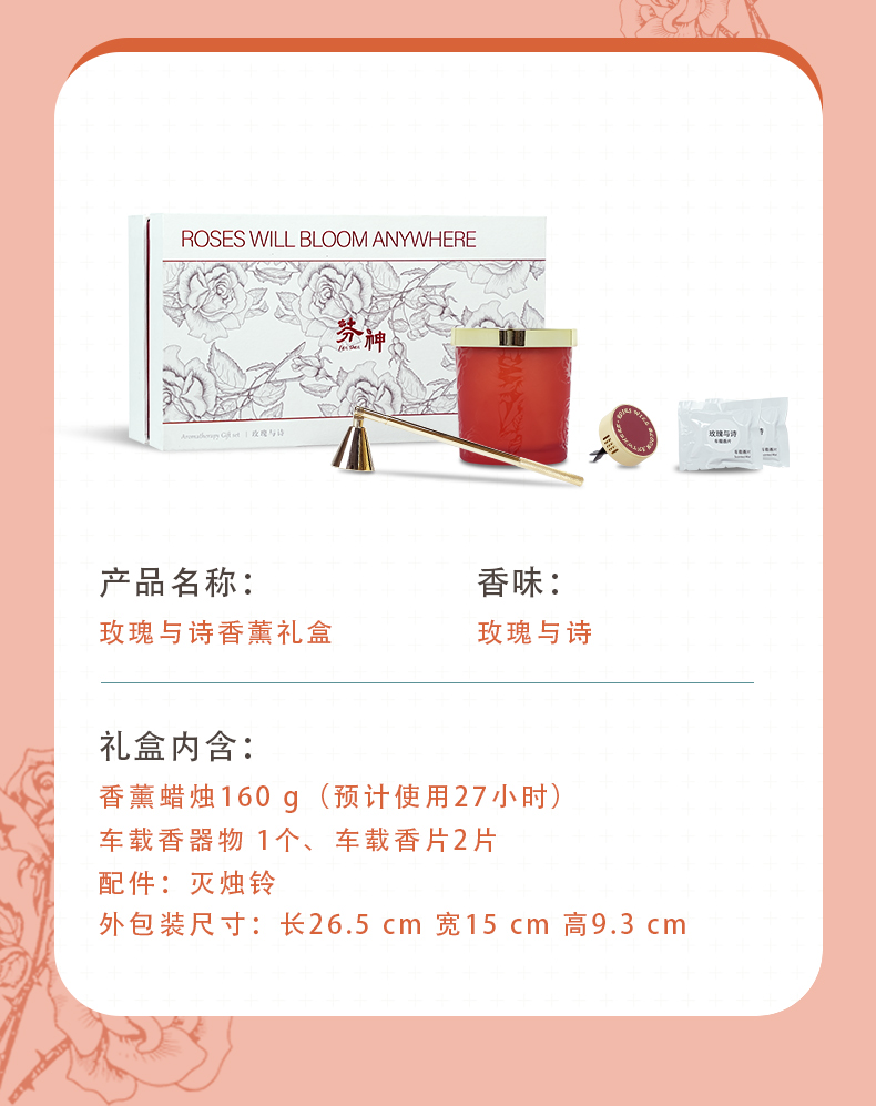产品规格:香薰蜡烛160g,车载香片2片 礼盒尺寸:26.5 x 18 x 9.5 cm 香味:丝玫乌木 前调:玫瑰、丁香 中调:广藿香、藏红花 后调:愈创木、麝香