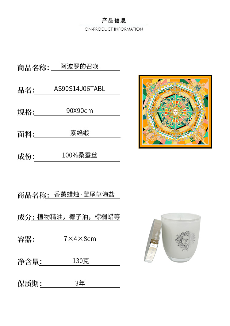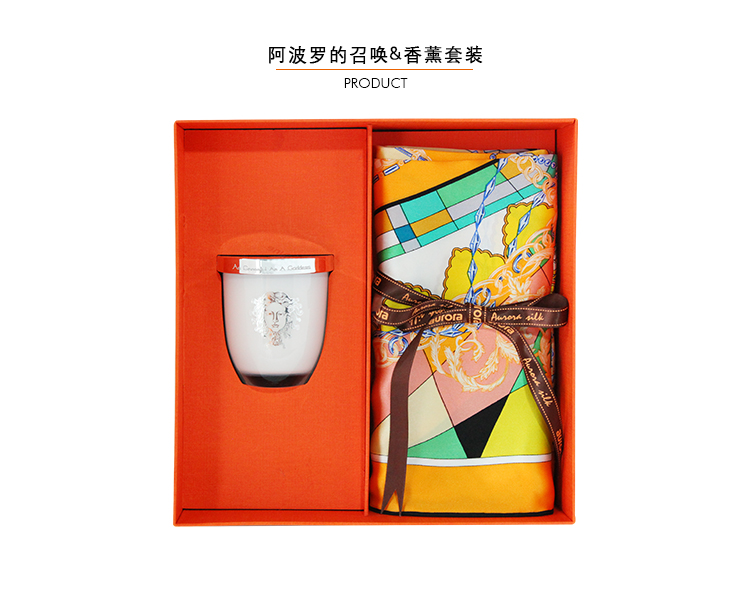 实用,小资 适用礼盒 「阿波罗的召唤」大方巾百搭款 尺寸:90×90cm 成分:桑蚕丝 面料:14姆米真丝素绉缎 卷边:手工密针反卷边 工艺:手工台版印 香薰蜡烛-鼠尾草海盐 主要成分:含植物精油,椰子蜡,棕榈蜡等 容器:70×40×80cm 保质期:3年 净含量:130g