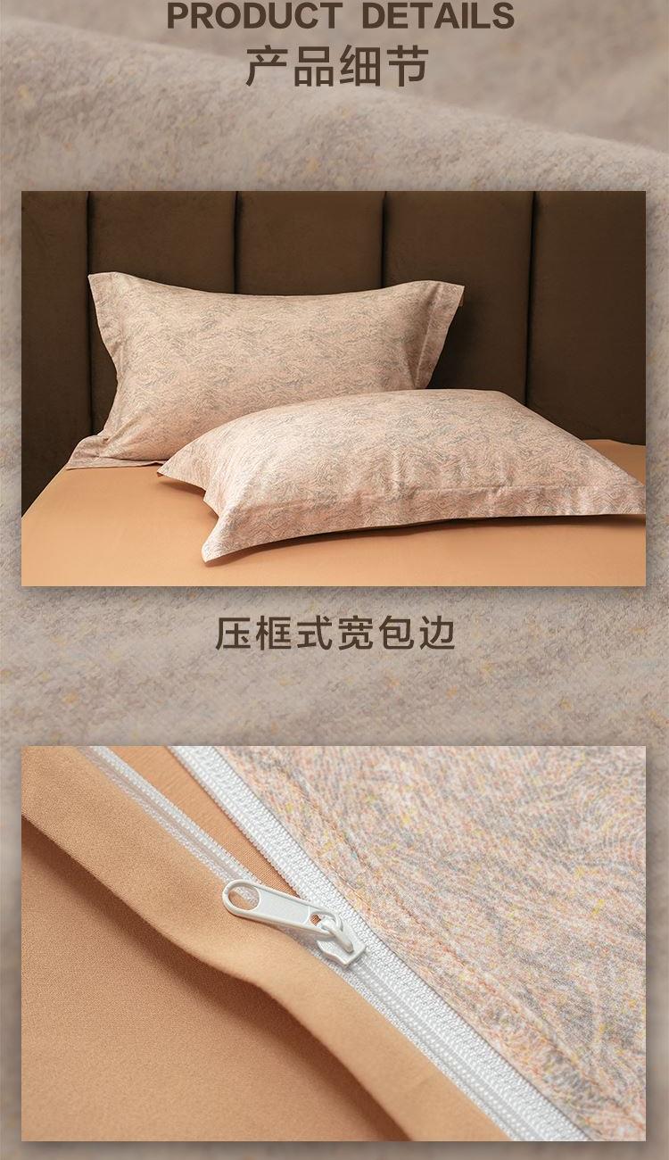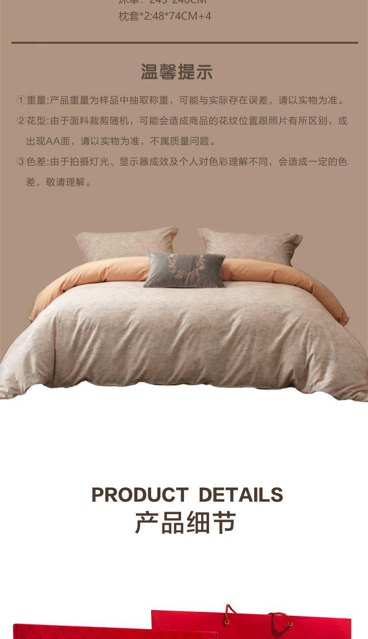 产品规格:1.8m(6英尺)床: 被套:220*240cm 床单:240*245cm 枕套*2:48*74cm+4cm 产品材质:棉 1、选用60支优质高支棉,纱支越高磨毛工艺要求越高,双面磨毛柔暖加倍。 2、AB双面磨毛,绒毛丰富密实触摸起来更柔更软,简约拼接温柔裸色适用于多种家居的风格。