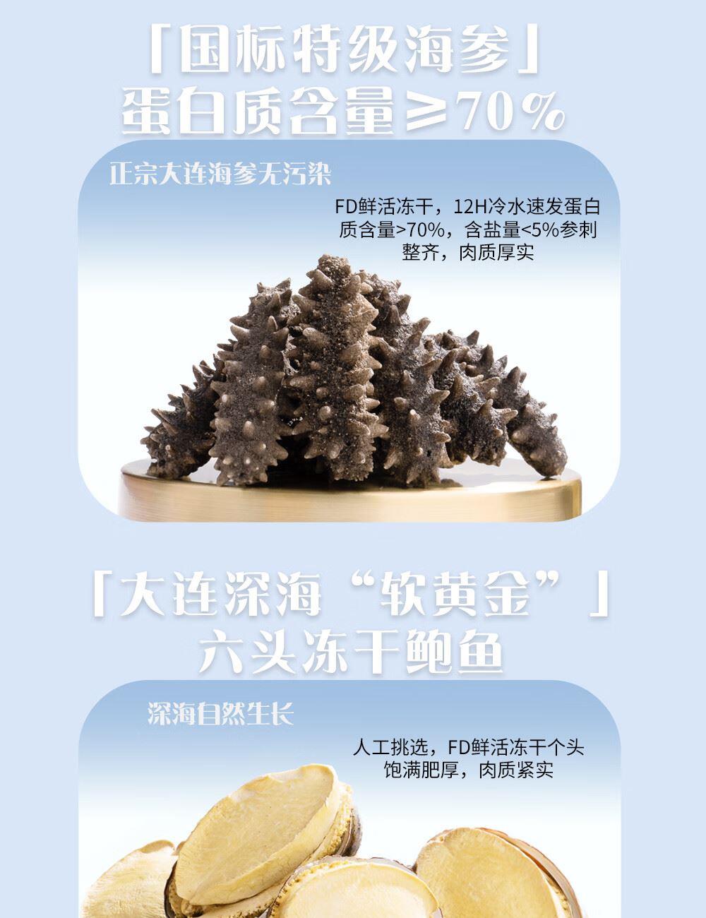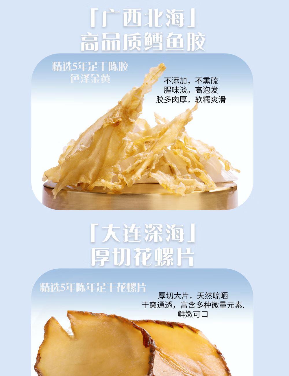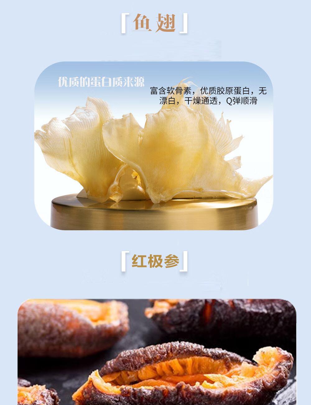 规格:红极参45克、干海参10克、干鲍鱼60克、鳕鱼胶30克、鳐鱼翅30克、花螺片150克 卖点: ✅ 珍贵食材 精挑细选 ✅ 传统滋补 现代工艺 ✅ 高贵礼赠 彰显品味 ✅ 四季养生 倍添活力 一份礼盒,六重滋养,百分诚意🎉
