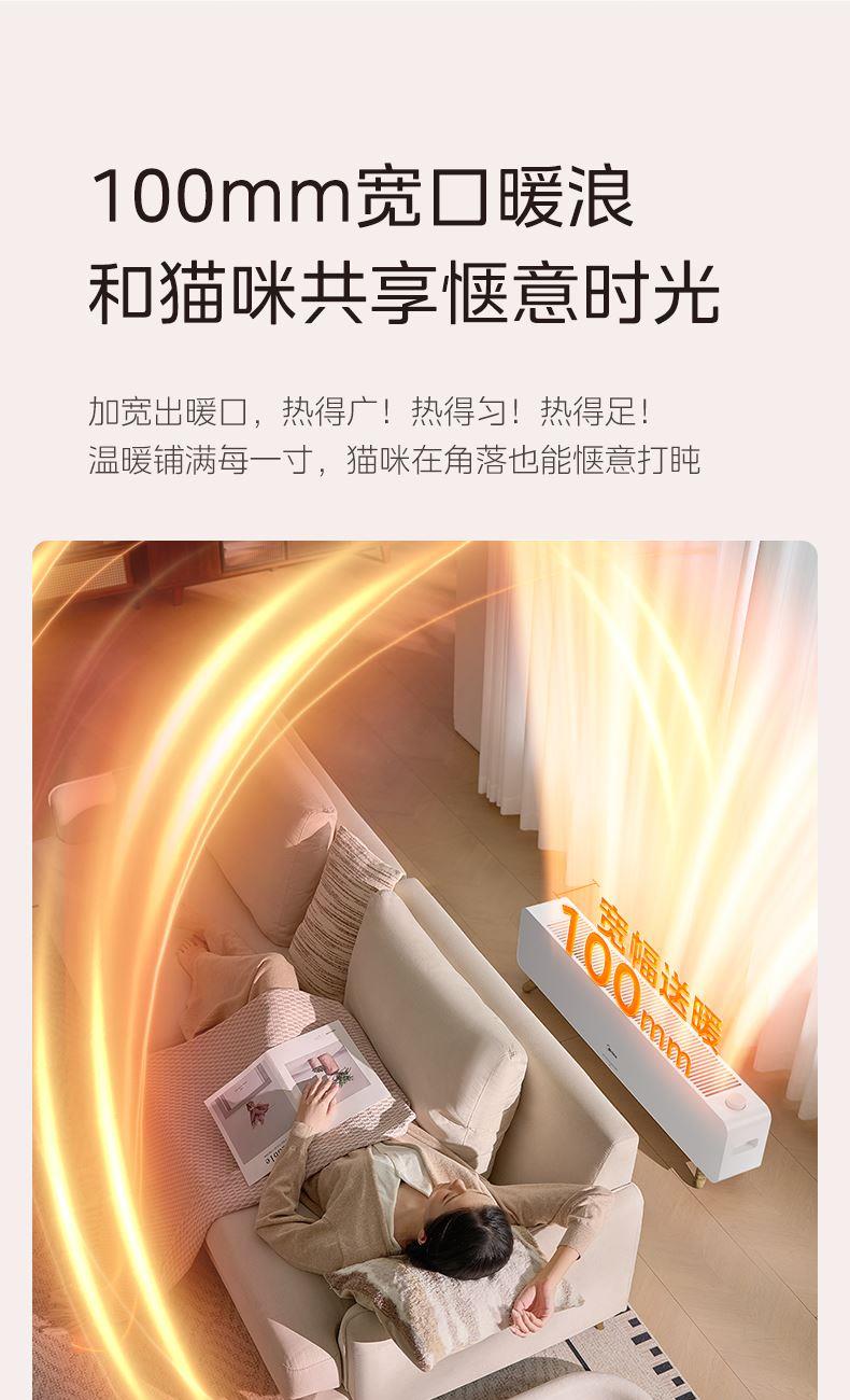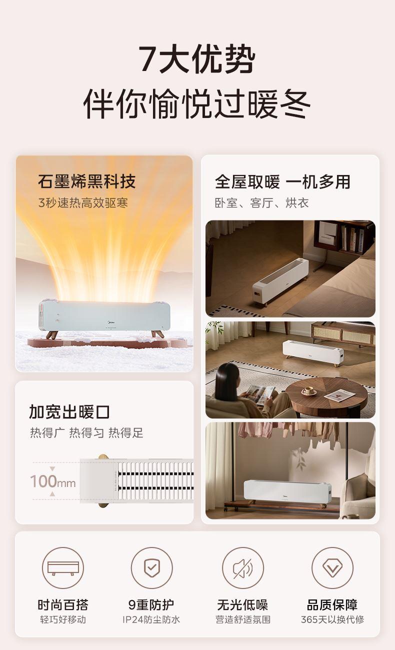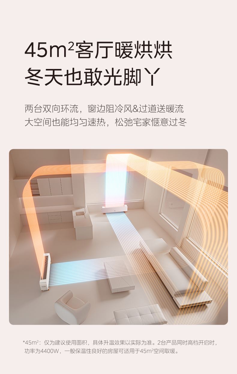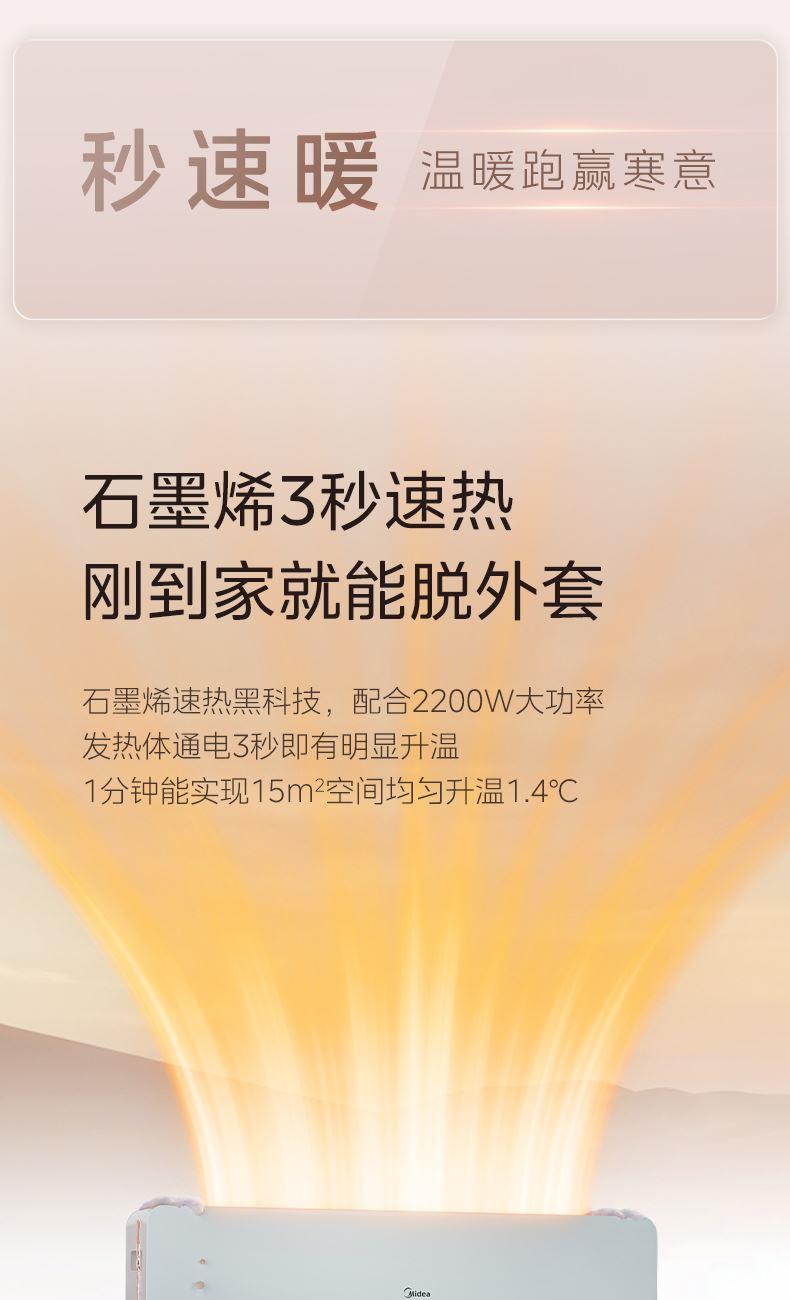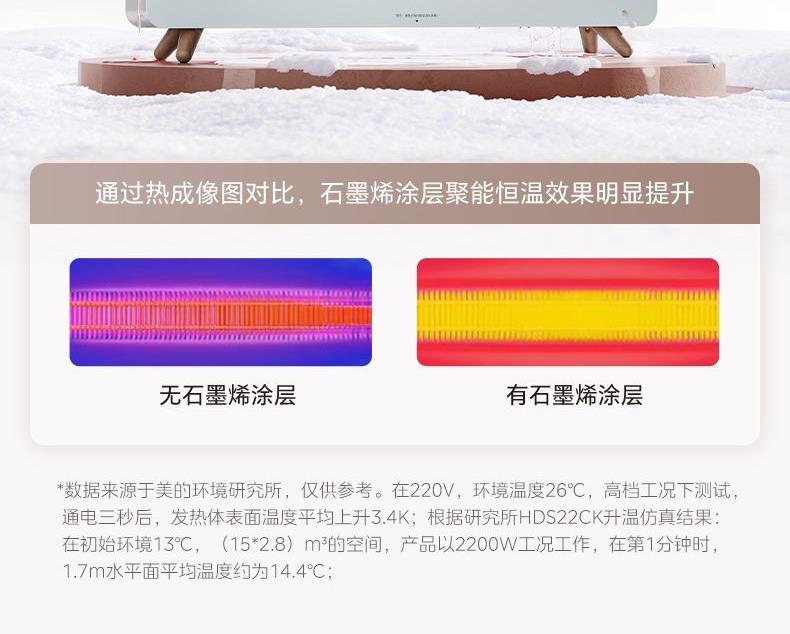 【温暖无需等待】 石墨烯速热“黑”科技,3秒快速释放热量。石墨烯热光波与人体同频,更容易被人体感知。温和舒适,如同冬日沐浴阳光一般; 加宽出暖口,充分散热,热量更足。出暖口加宽至100mm,对比老品增加22%; 【愉悦每个冬日场景】 卧室安静升温。无光低噪温和升温,搭配智能睡眠曲线,宝宝整晚安睡,不用担心踢被子着凉 快速烘衣暖衣。早上赖个床的时间,衣服暖了;晚上安静烘衣,第二天起床就有干衣服穿了 客厅均匀升温。2台一起用,一台放在窗边阻隔室外冷空气,一台放在客餐厅交界处,双向