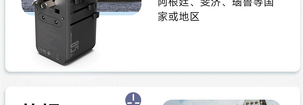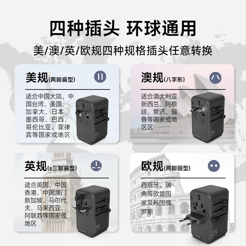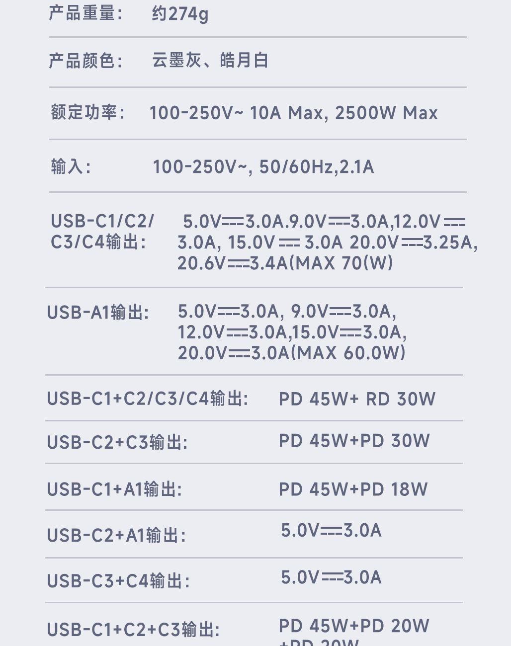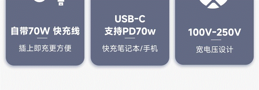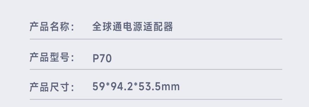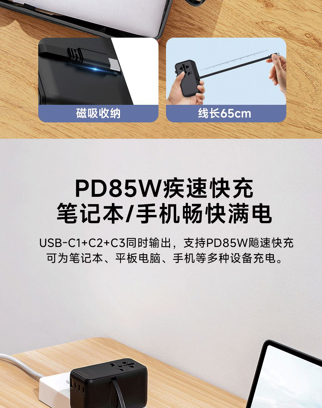 采用航天领域新型半导体材料GaN氮化镓,使芯片集成度和能量转化率更高,实现体积、性能、安全三大平衡 100V-250V宽电压设计,各国标准插头集成一体,轻松按推切换,三口85W快充 全球差旅充电一个就够 五口充电AC+USB-A+3*USB-C,USB-C支持PD70W,USB-C1+C2+C3同时输出,支持PD85W飚速快充,可为笔记本、平板电脑、手机等多种设备充电,多个设备同时充电,功率自动分配 内置65cm可伸缩USB-C线,支持PD70W大功率输出,飚速快充笔记本,办公告别电量焦虑 防火PC材料,阻燃耐高温,安全放心,75N安全保护门,相当于7.5Kg重物产生的压力,不用担心小孩误插 产品尺寸:59*94.2*53.5mm 重量:约274g 颜色:云墨灰、皓月白