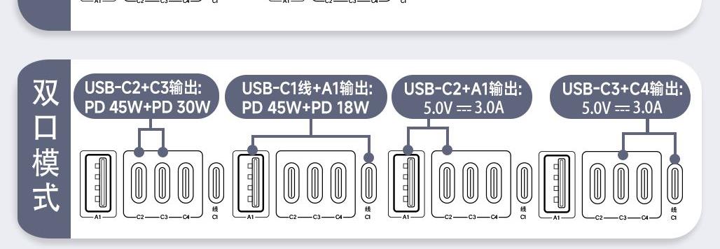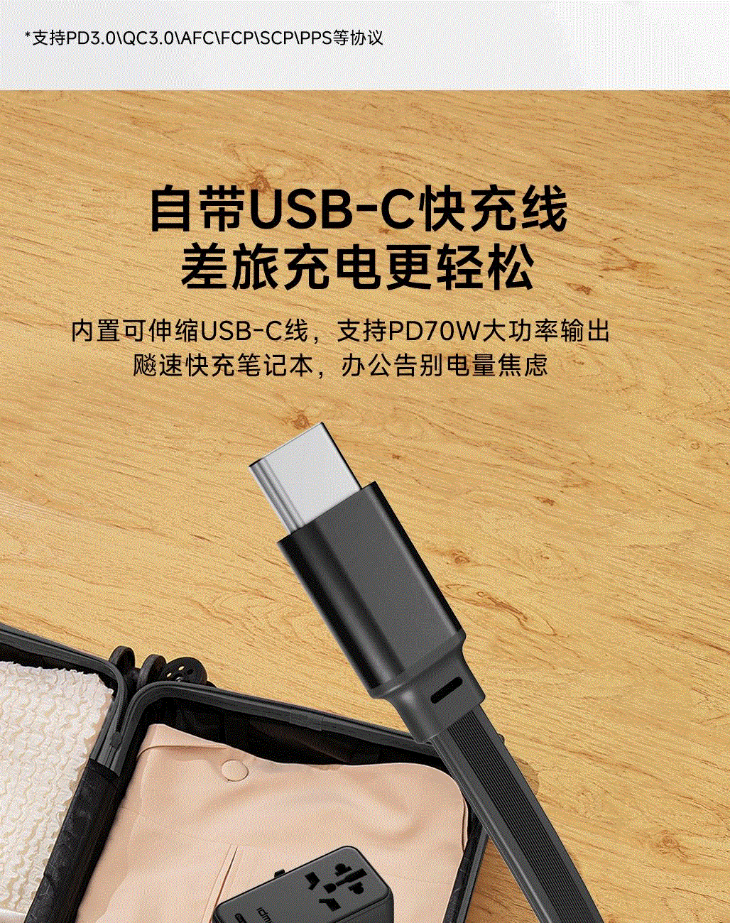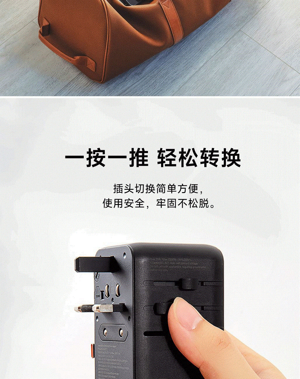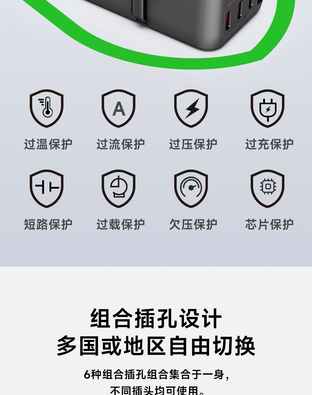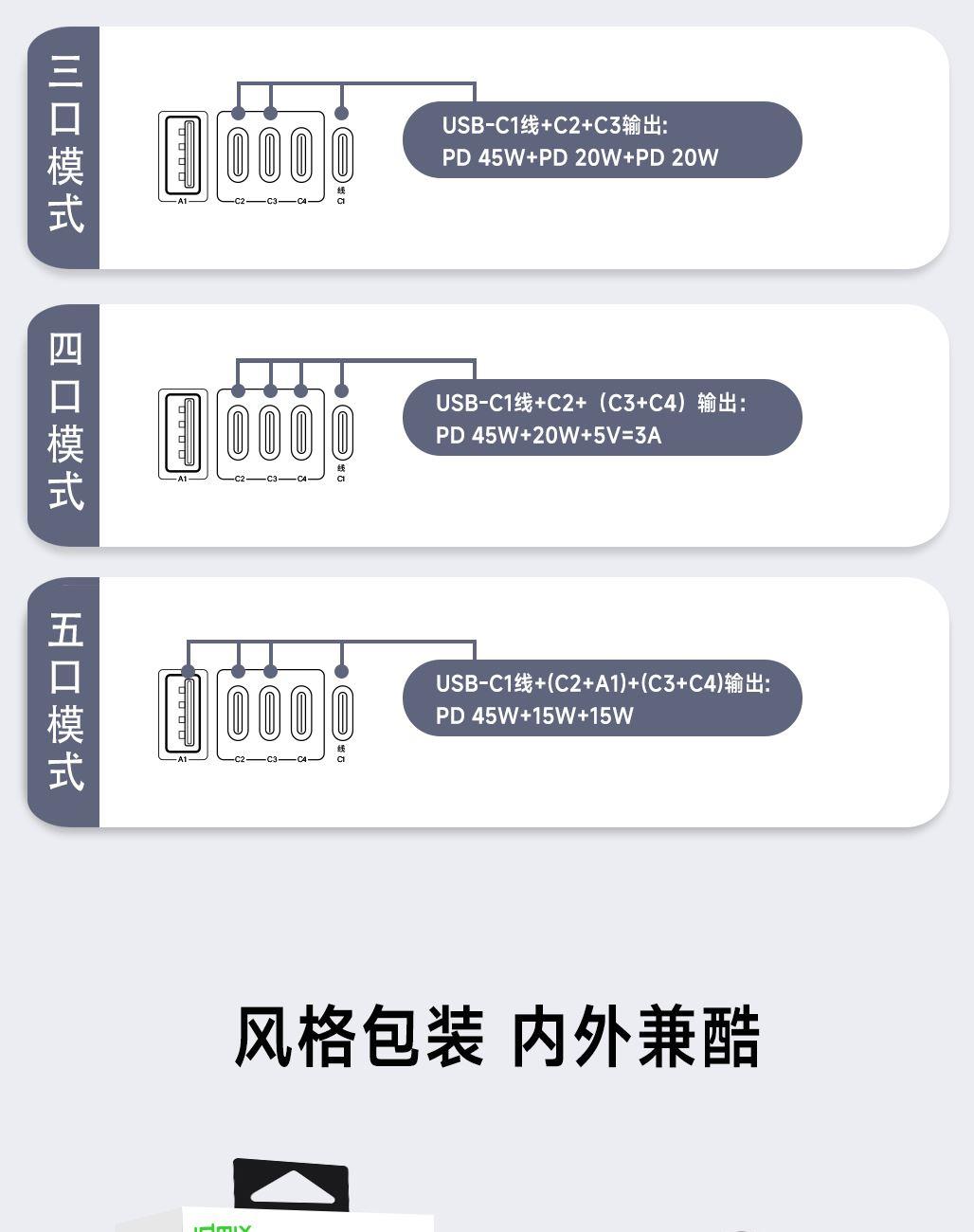 采用航天领域新型半导体材料GaN氮化镓,使芯片集成度和能量转化率更高,实现体积、性能、安全三大平衡 100V-250V宽电压设计,各国标准插头集成一体,轻松按推切换,三口85W快充 全球差旅充电一个就够 五口充电AC+USB-A+3*USB-C,USB-C支持PD70W,USB-C1+C2+C3同时输出,支持PD85W飚速快充,可为笔记本、平板电脑、手机等多种设备充电,多个设备同时充电,功率自动分配 内置65cm可伸缩USB-C线,支持PD70W大功率输出,飚速快充笔记本,办公告别电量焦虑 防火PC材料,阻燃耐高温,安全放心,75N安全保护门,相当于7.5Kg重物产生的压力,不用担心小孩误插 产品尺寸:59*94.2*53.5mm 重量:约274g 颜色:云墨灰、皓月白