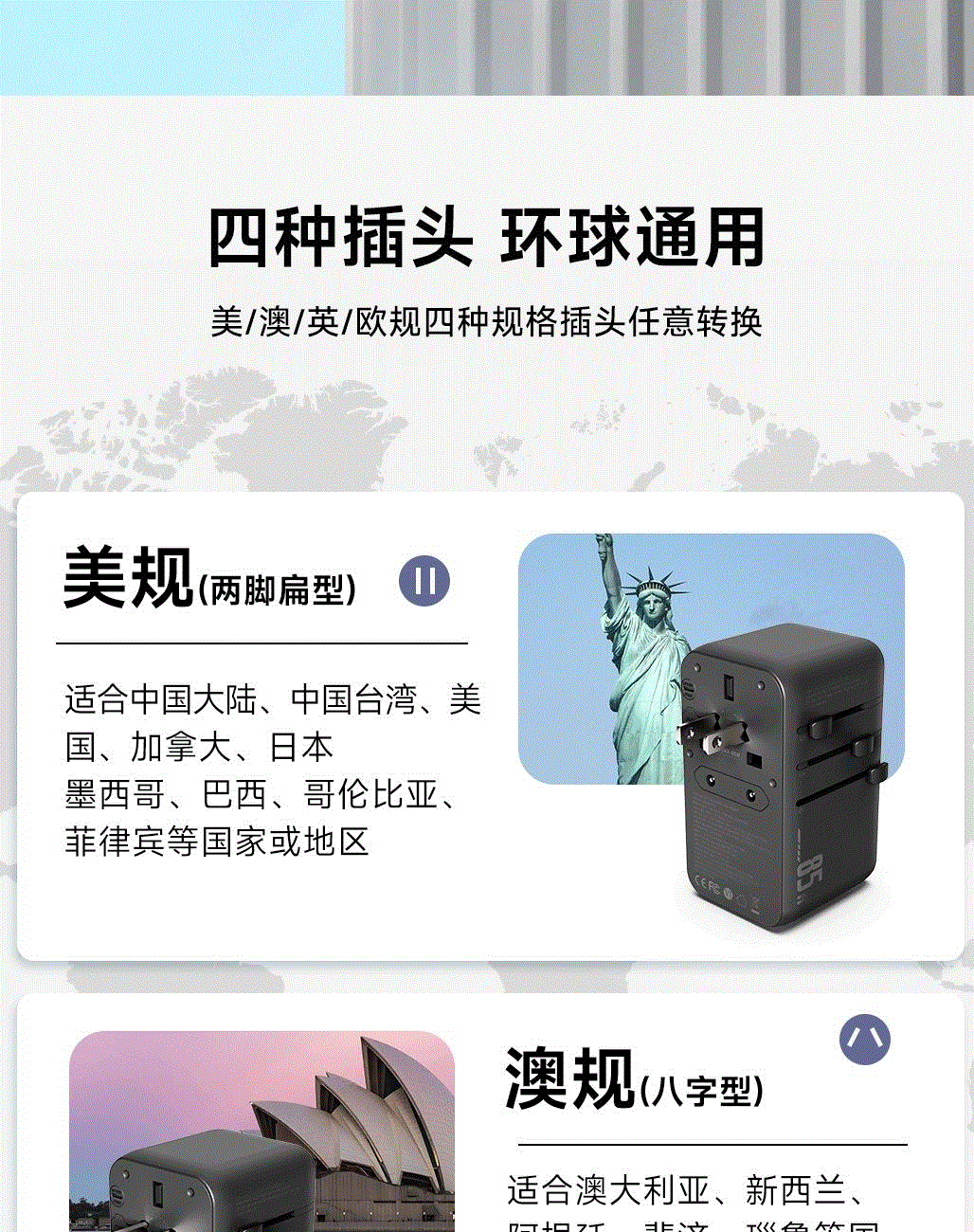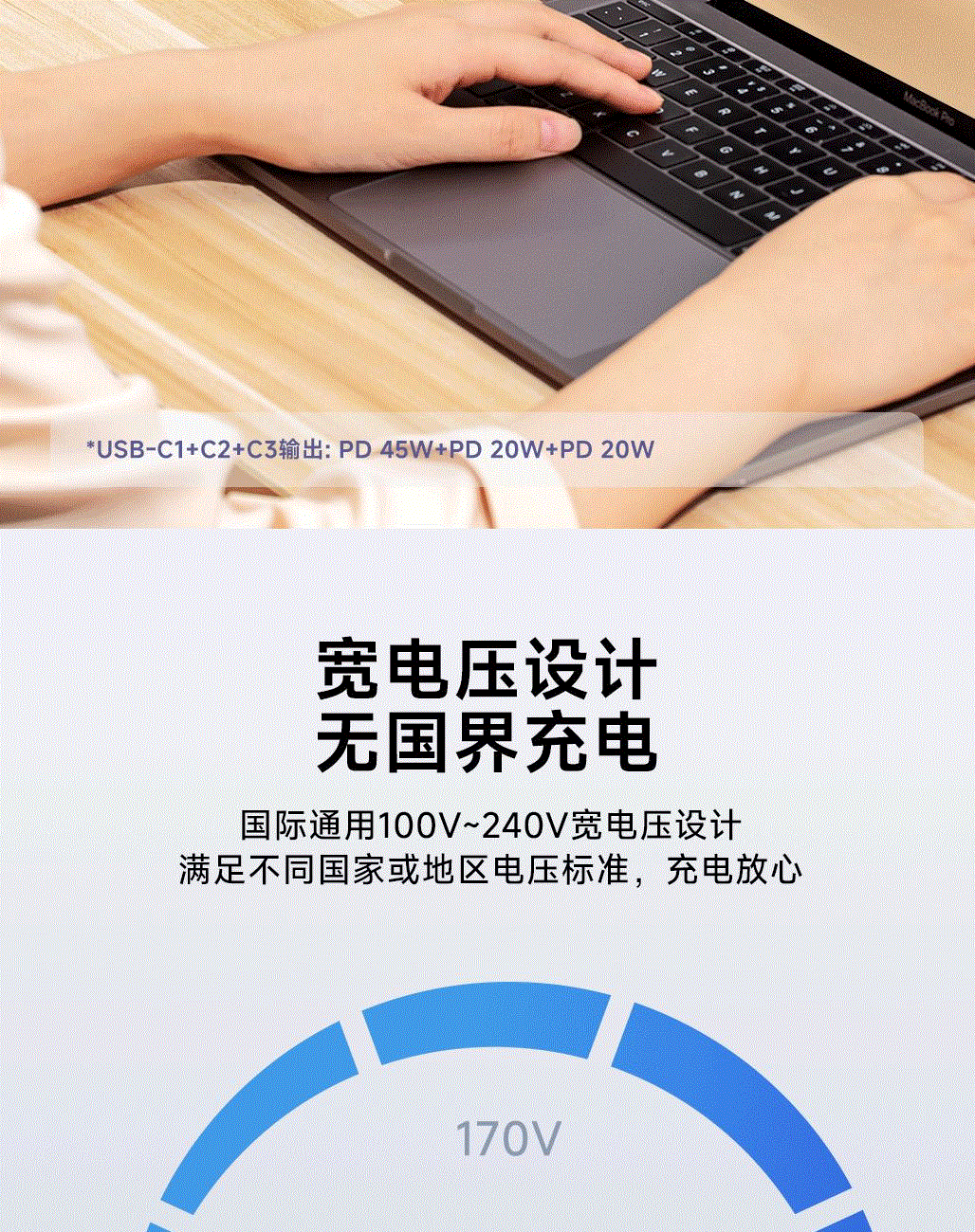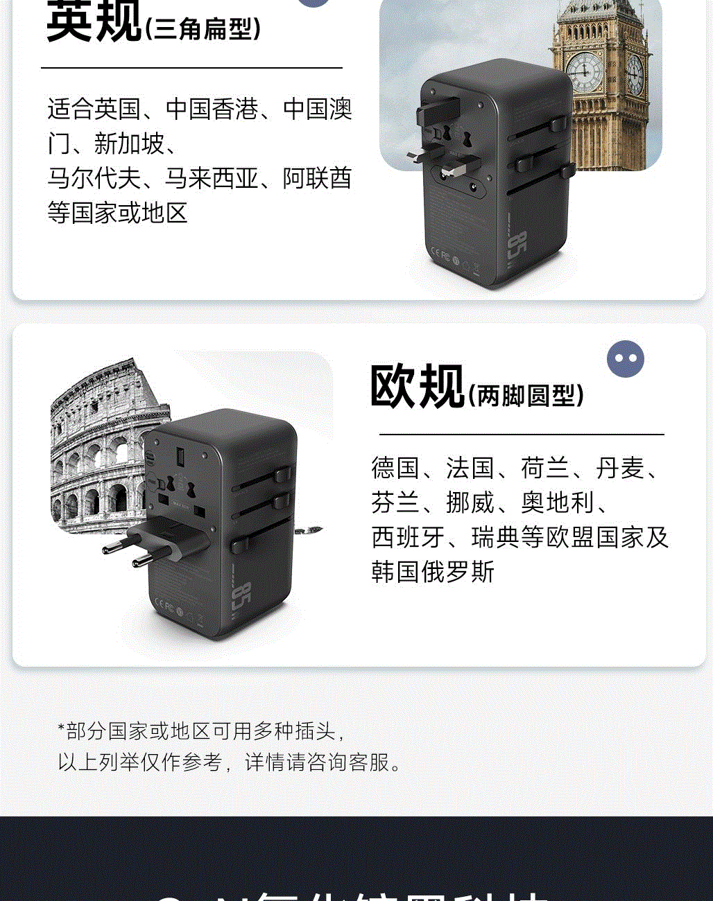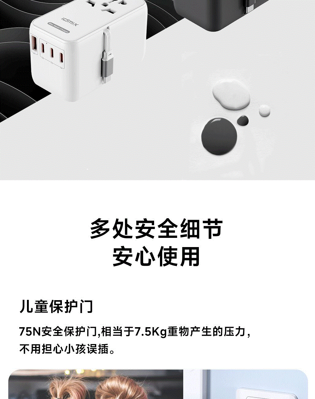 采用航天领域新型半导体材料GaN氮化镓,使芯片集成度和能量转化率更高,实现体积、性能、安全三大平衡 100V-250V宽电压设计,各国标准插头集成一体,轻松按推切换,三口85W快充 全球差旅充电一个就够 五口充电AC+USB-A+3*USB-C,USB-C支持PD70W,USB-C1+C2+C3同时输出,支持PD85W飚速快充,可为笔记本、平板电脑、手机等多种设备充电,多个设备同时充电,功率自动分配 内置65cm可伸缩USB-C线,支持PD70W大功率输出,飚速快充笔记本,办公告别电量焦虑 防火PC材料,阻燃耐高温,安全放心,75N安全保护门,相当于7.5Kg重物产生的压力,不用担心小孩误插 产品尺寸:59*94.2*53.5mm 重量:约274g 颜色:云墨灰、皓月白