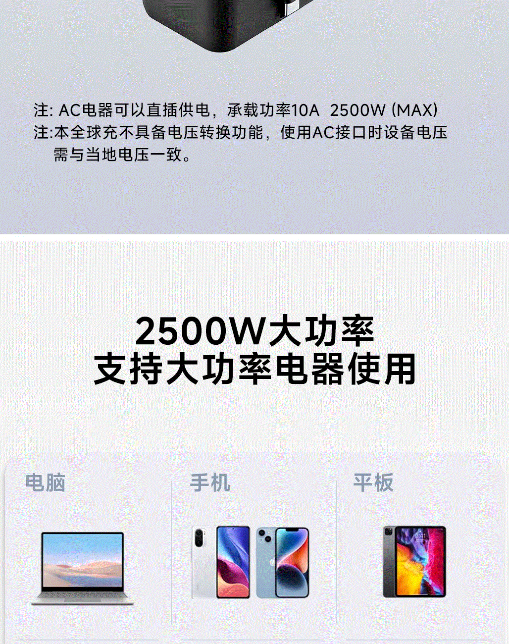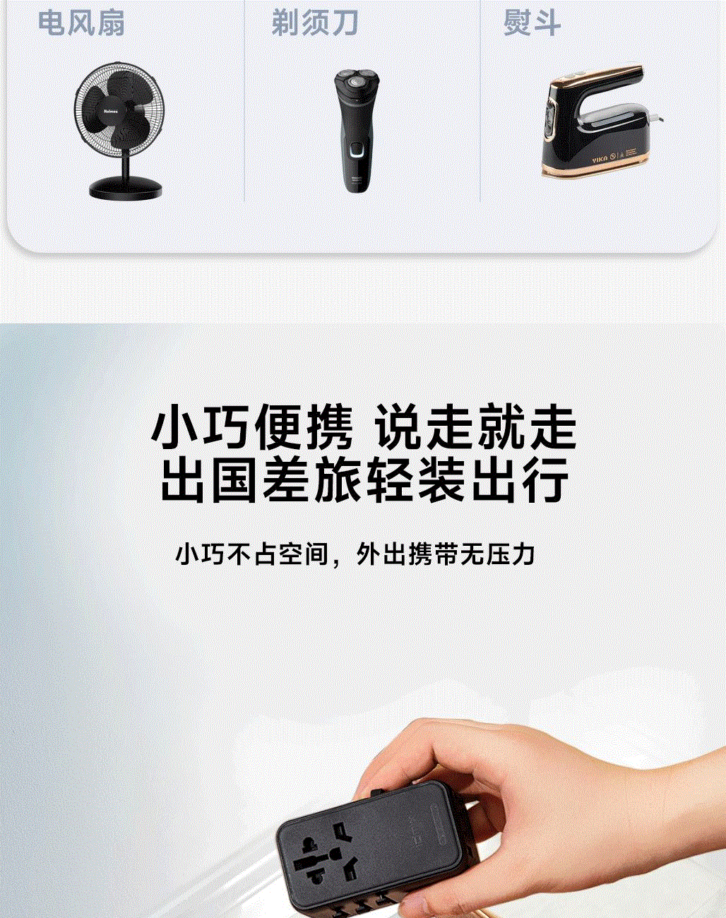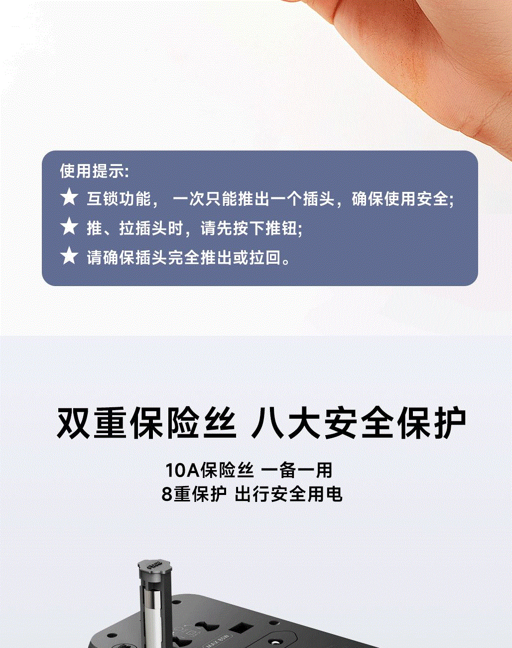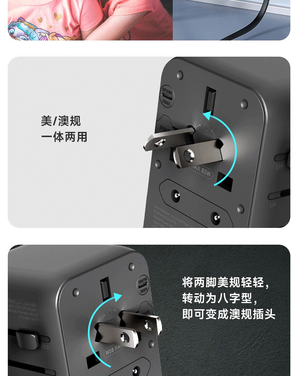 采用航天领域新型半导体材料GaN氮化镓,使芯片集成度和能量转化率更高,实现体积、性能、安全三大平衡 100V-250V宽电压设计,各国标准插头集成一体,轻松按推切换,三口85W快充 全球差旅充电一个就够 五口充电AC+USB-A+3*USB-C,USB-C支持PD70W,USB-C1+C2+C3同时输出,支持PD85W飚速快充,可为笔记本、平板电脑、手机等多种设备充电,多个设备同时充电,功率自动分配 内置65cm可伸缩USB-C线,支持PD70W大功率输出,飚速快充笔记本,办公告别电量焦虑 防火PC材料,阻燃耐高温,安全放心,75N安全保护门,相当于7.5Kg重物产生的压力,不用担心小孩误插 产品尺寸:59*94.2*53.5mm 重量:约274g 颜色:云墨灰、皓月白