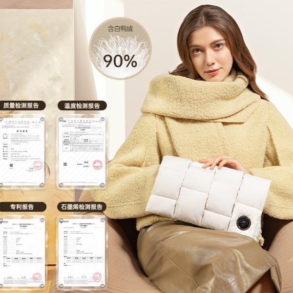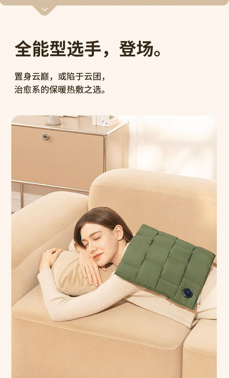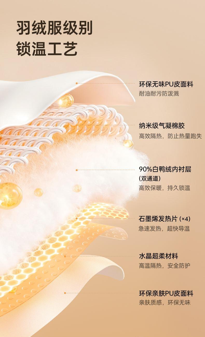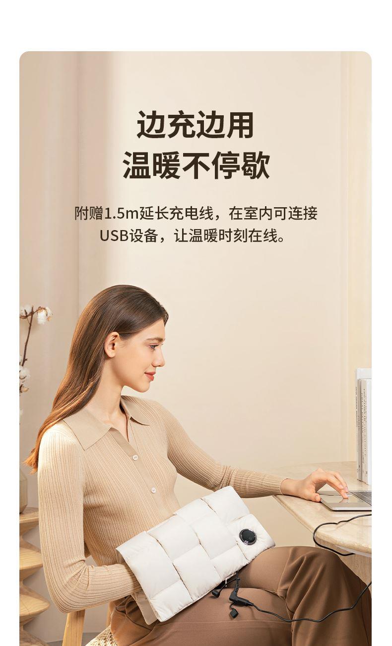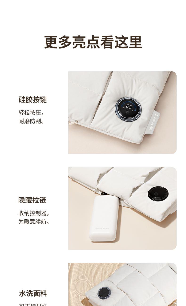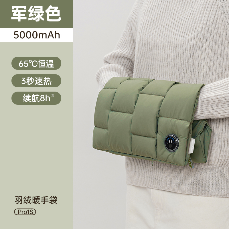 极速升温,双面发热,含绒量90% 六档调温,智能数显温度,边冲边用不断电 暖手/腰/腹/背多场景使用,可水洗清洁 产品材质:环保无味肤感PU皮+聚酯纤维+白鸭绒 产品颜色:米白、军绿色 电池容量:5000mAh(DC版充电口)