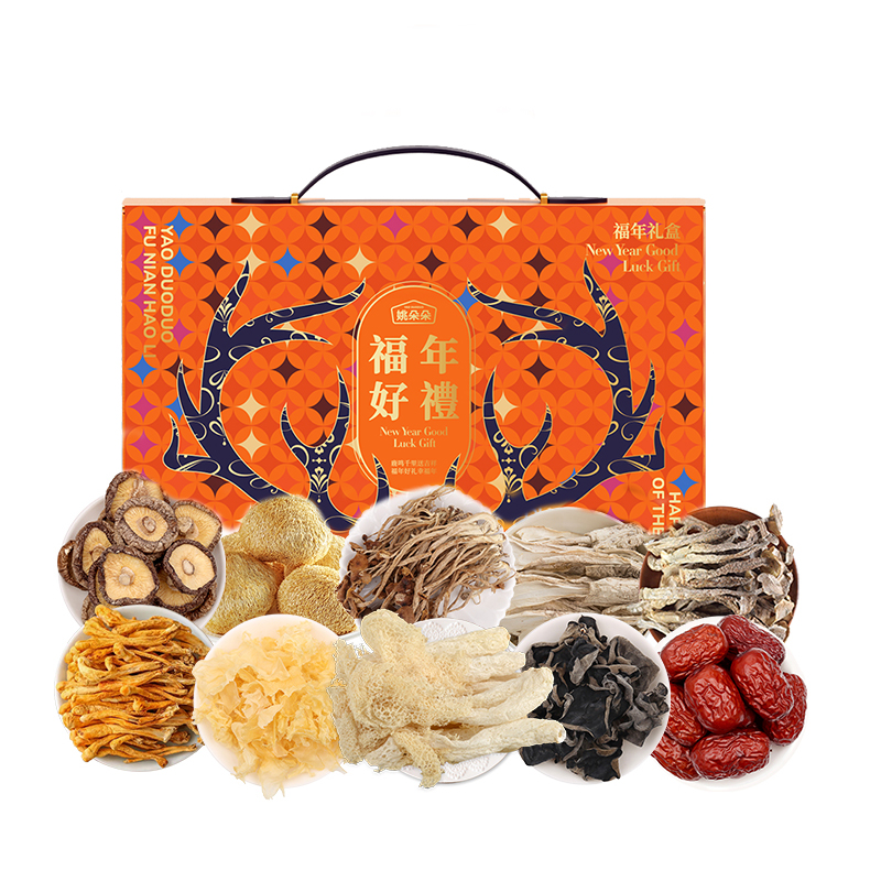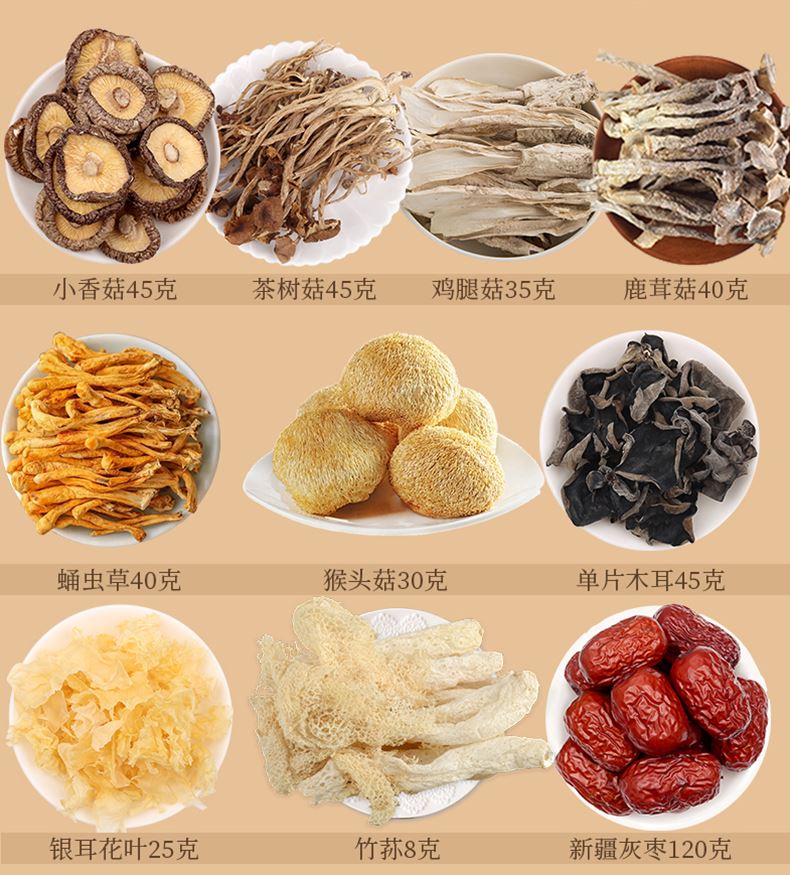 小香菇45克 茶树菇45克 鸡腿菇35克 鹿茸菇40克 蛹虫草40克 猴头菇30克 单片木耳45克 银耳花叶25克 新疆灰枣120克 竹荪8克 包装盒-福年好礼(小号)
