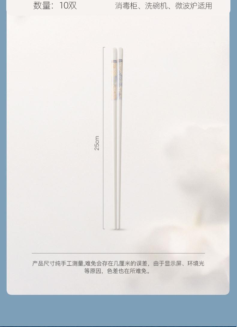 产品型号:KZ-10A 产品花色:时光漫步 产品尺寸:25*0.8*0.5mm 产品配置:10双装 产品材质:陶瓷 包装方式:快递盒 单套重量:0.5KG 包装尺寸:29*6*6CM 产品条码: