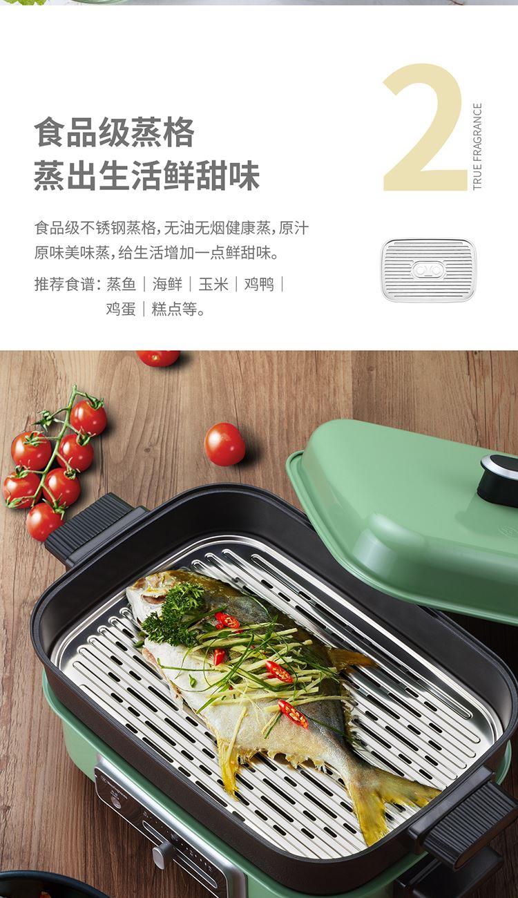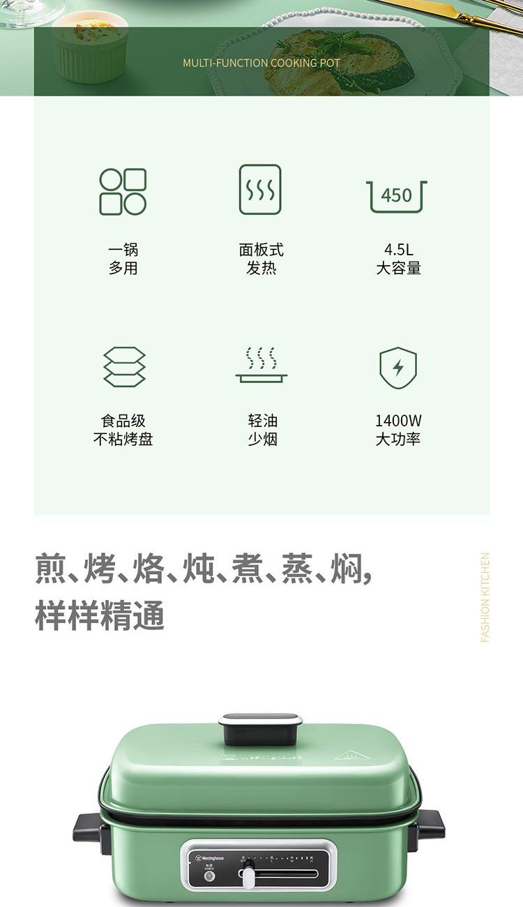 产品规格: 1、产品容量:4.5L 2、额定电压:220V 3、额定频率:50Hz 4、额定功率:1400W 产品特点: 1、面板式一体压铸发热盘 整体受热无死角 2、推杆式温控 火候尽在掌握 3、煎.烤、烙.炖.煮.蒸.焖样样精通,做有才艺的百变料理锅 4、4.5L深煮锅 焖煮随意,美味即得 5、食品级蒸格 蒸出生活鲜甜味 6、食品级不粘涂层 轻油少烟,健康饮食