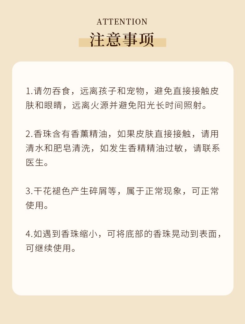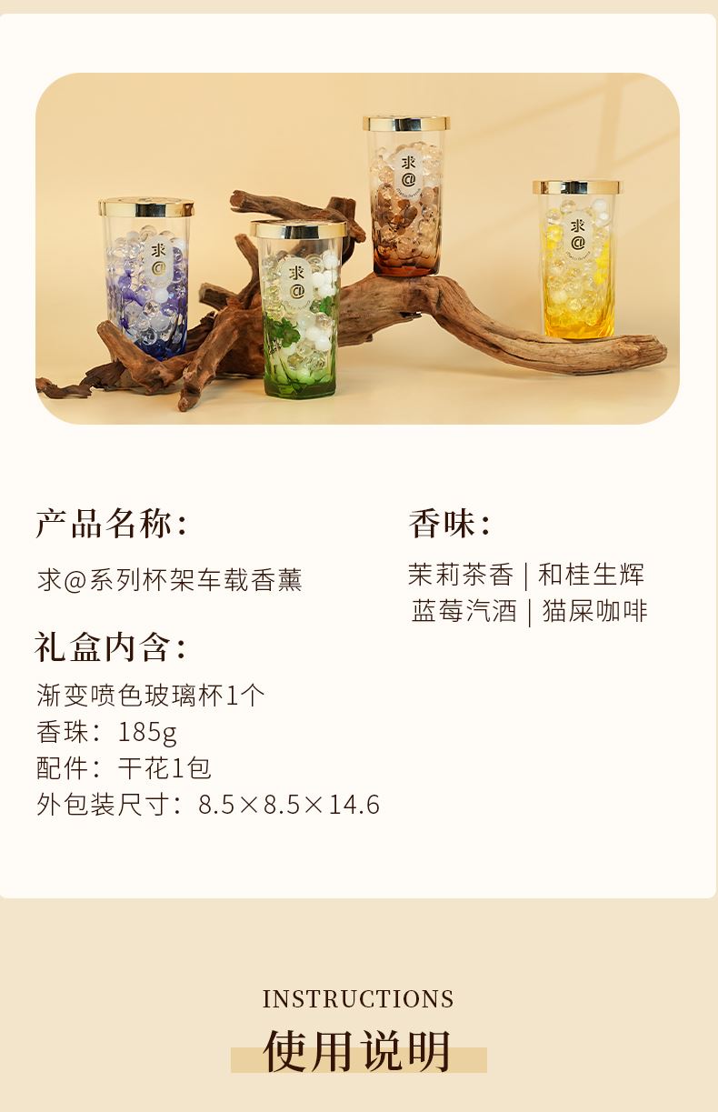 和桂生辉6975567692675 蓝莓汽酒6975567692682 猫屎咖啡6975567692699 茉莉茶香6975567692668 规格:渐变喷色玻璃杯1个、香珠185g 扩香时长:预计30天 配件:香珠一包