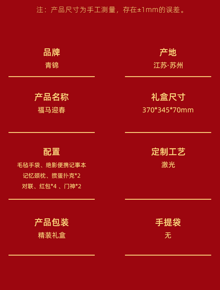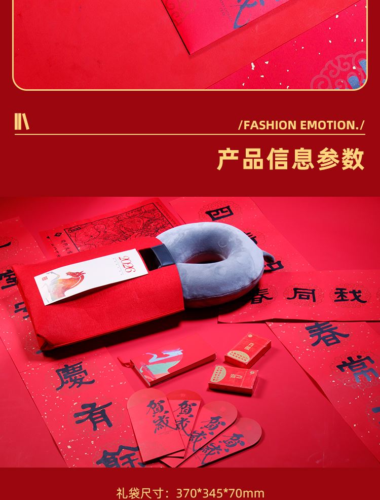 配置 毛毡手袋*1 绝影便携记事本*1 记忆颈枕*1 掼蛋扑克*2 对联*1-红包*4 门神*2