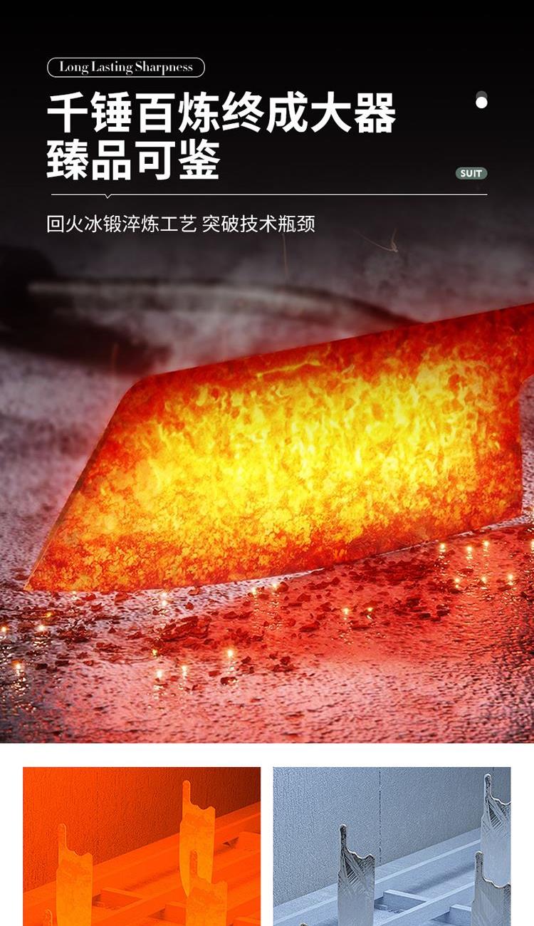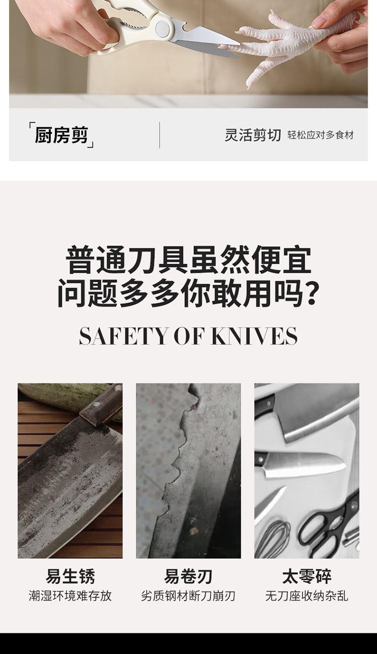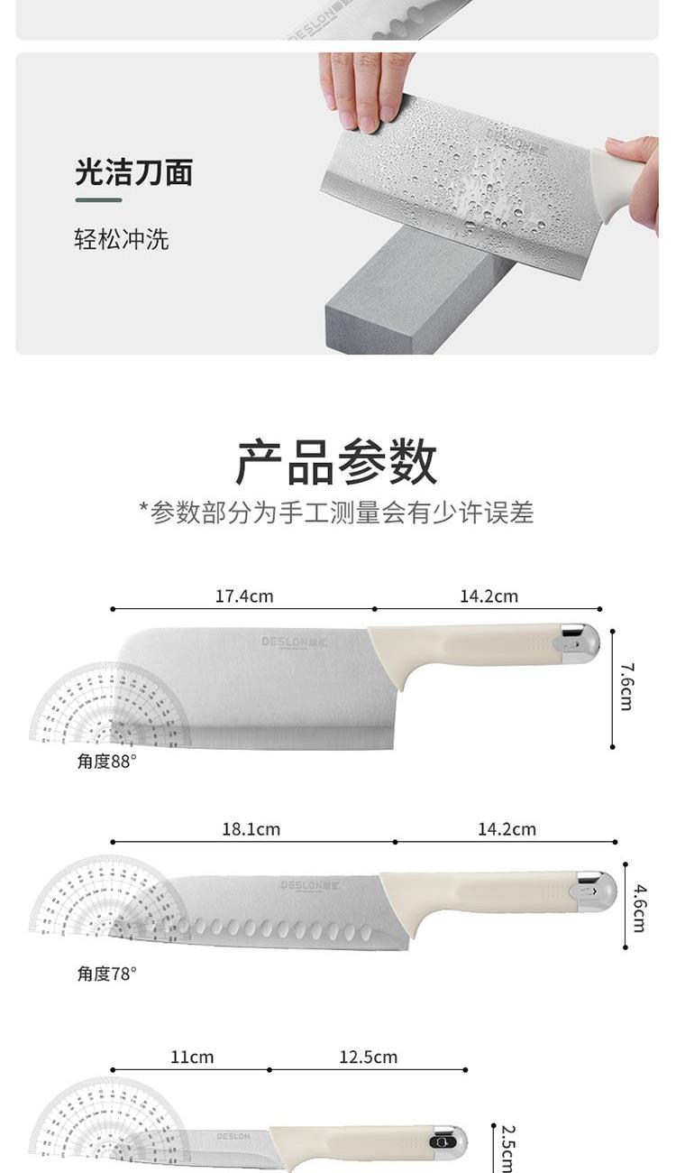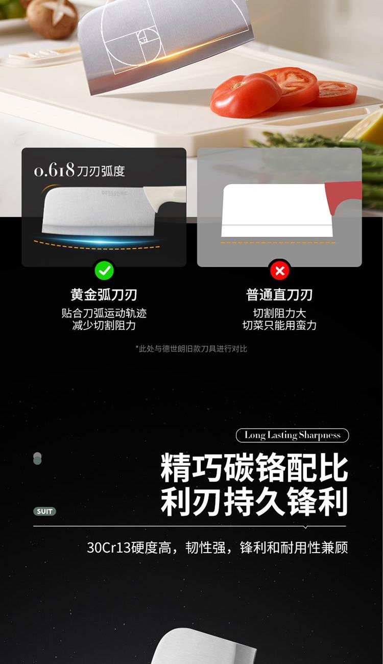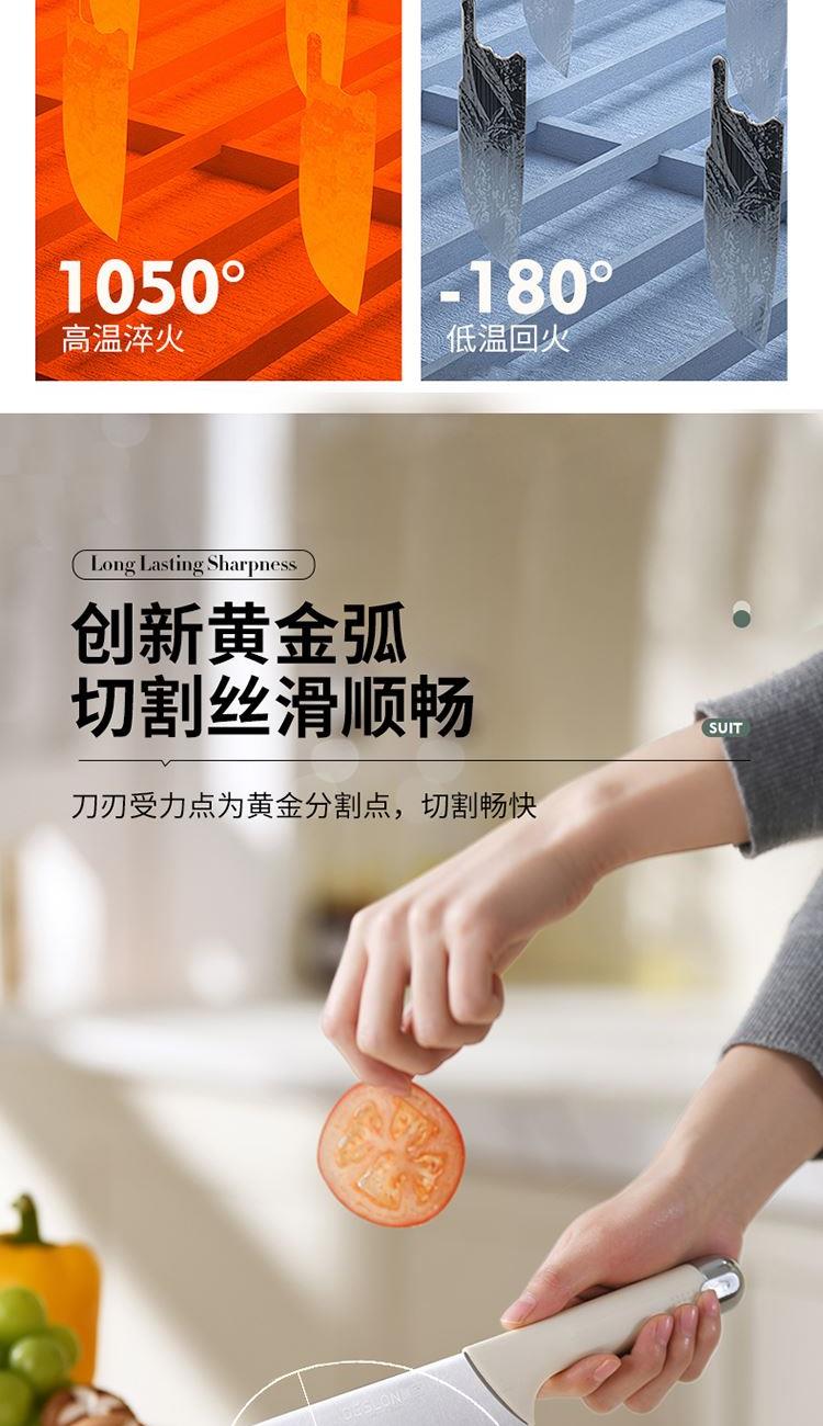 产品配置:切菜刀、三德刀、水果刀、 剪刀、刀座 刀身材质:30Cr13不锈钢(食品接触用) 包装方式:彩盒+邮购盒+外箱 1、刀具材质采用30Cr13不锈钢,硬度强、韧性高、不易生锈; 2、V型刀刃角度工艺,多达8道手工开刃工序,使刀刃平滑均匀; 3、人性化刀柄设计,符合人体工程学原理,握感舒适,长时间使用也轻松自如; 4、经由多道淬火热处理与回火工艺,刀刃锋利; 5、45度刀背磨抛,让您使用倍感舒适; 6、搭配时尚刀座,收置刀具,节约空间,干净整齐。