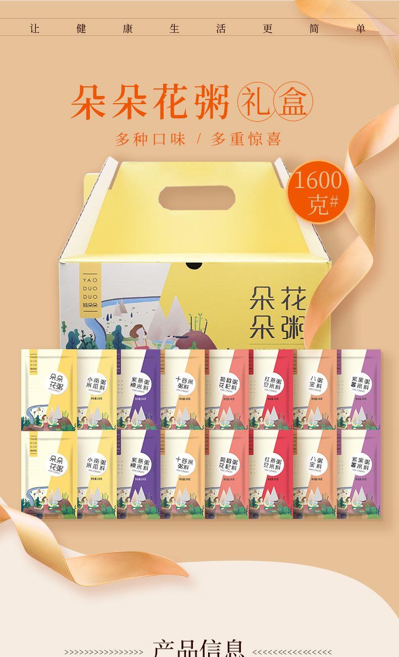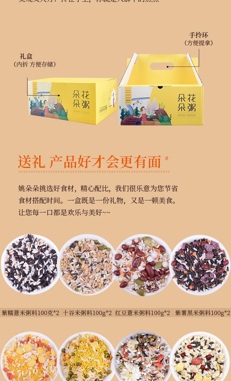 小米南瓜粥料100克*2 紫糯薏米粥料100克*2 菊花枸杞粥料100克*2 紫薯黑米粥料100克*2 八宝粥料100克*2 红豆薏米粥料100克*2 十谷米粥料100克*2 玉米胡萝卜粥料100克*2 朵朵花粥礼盒
