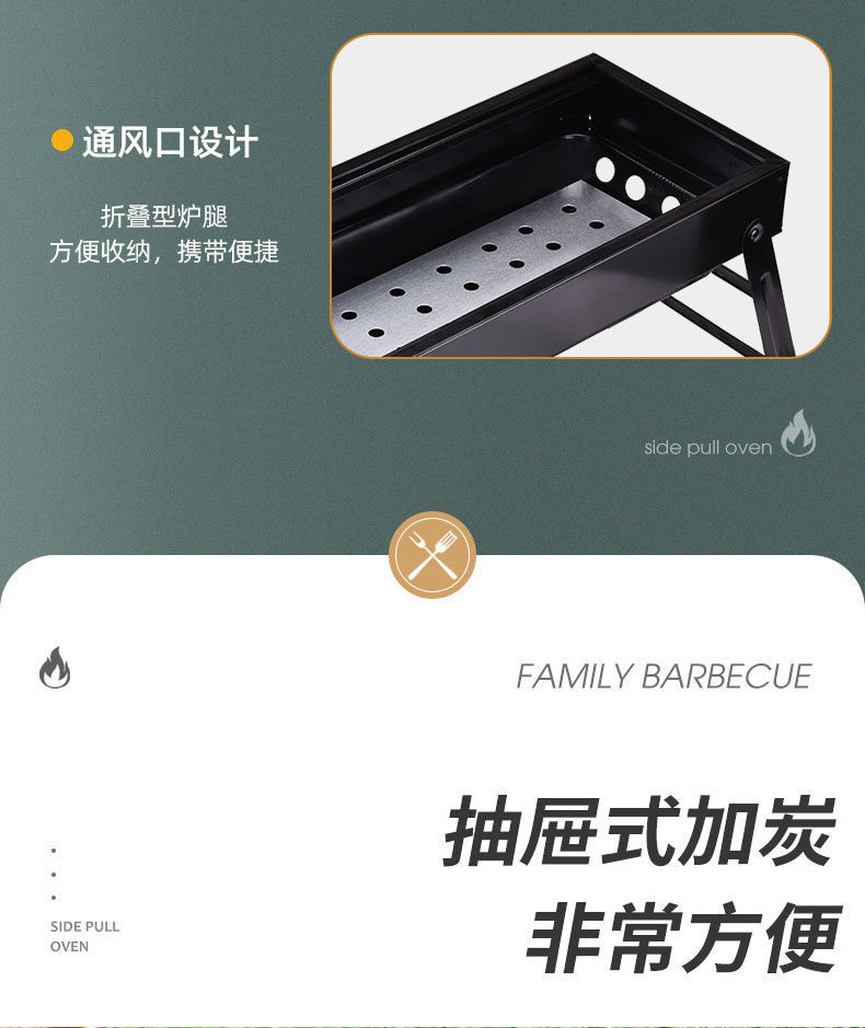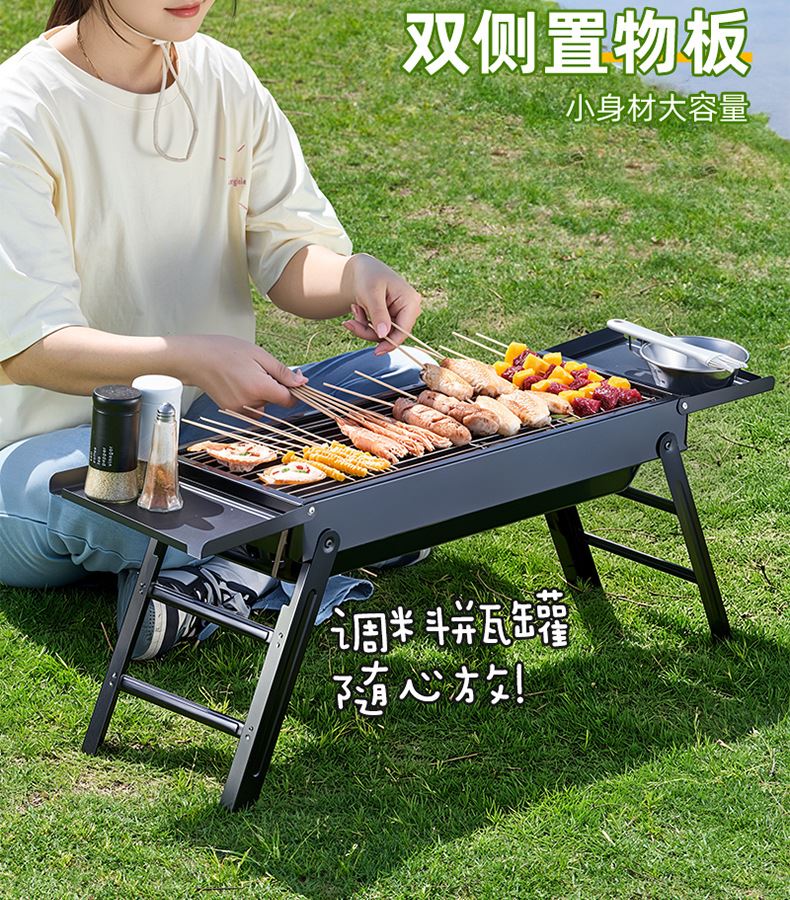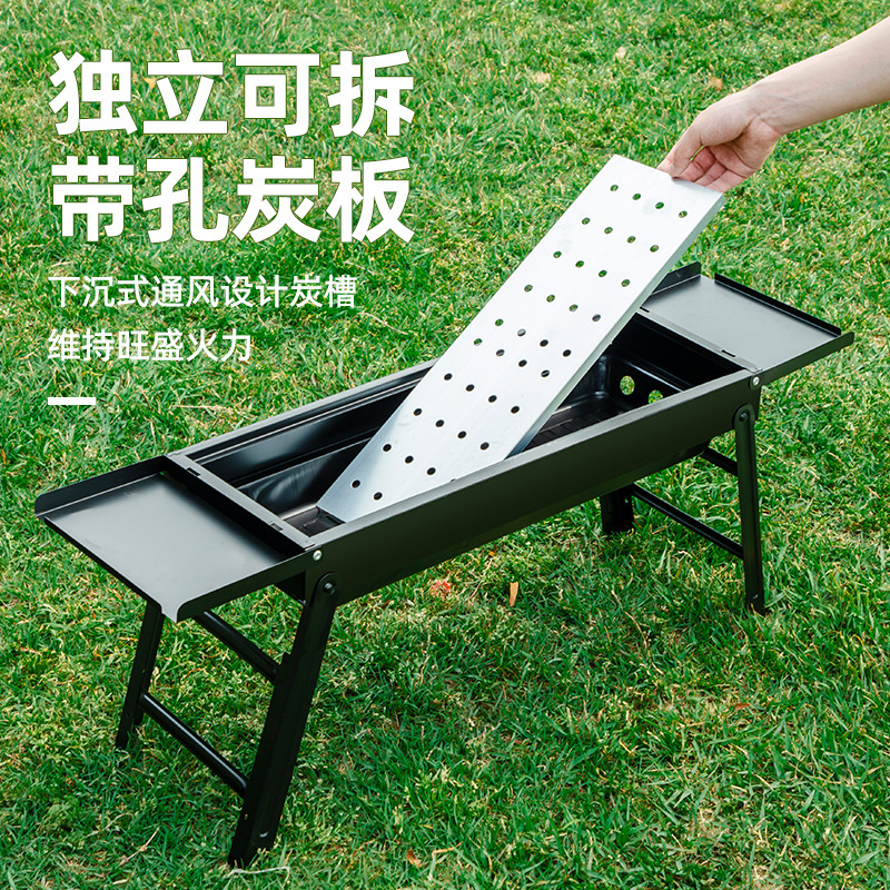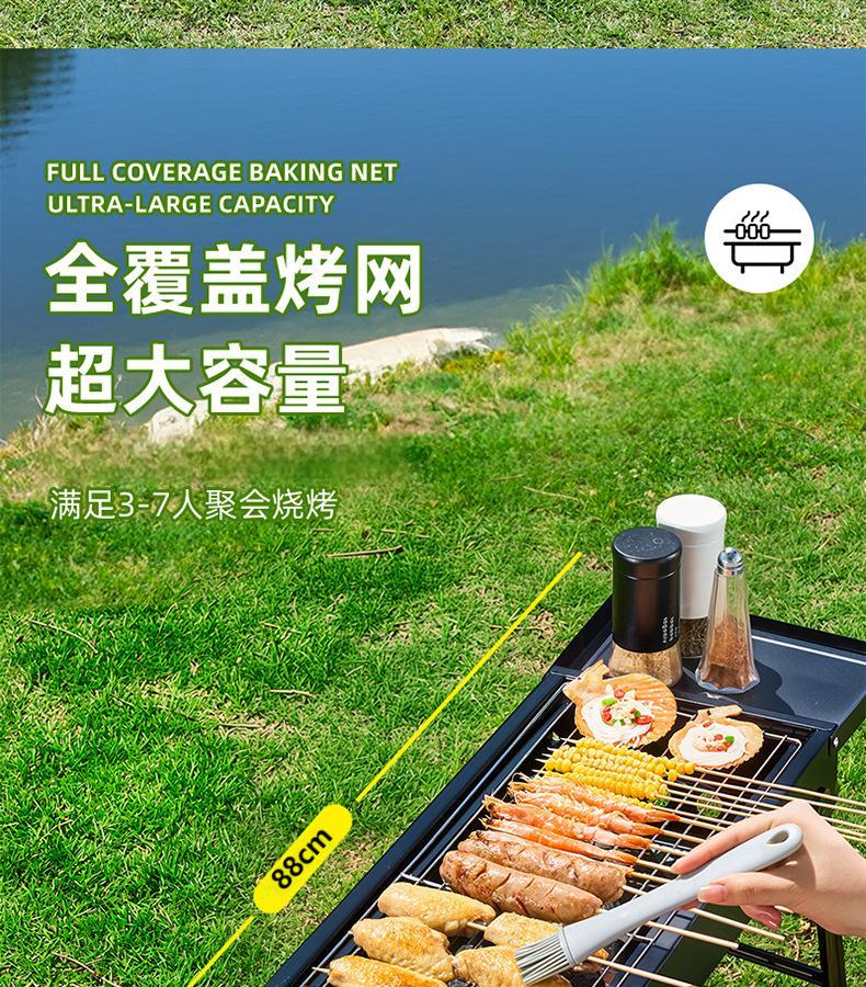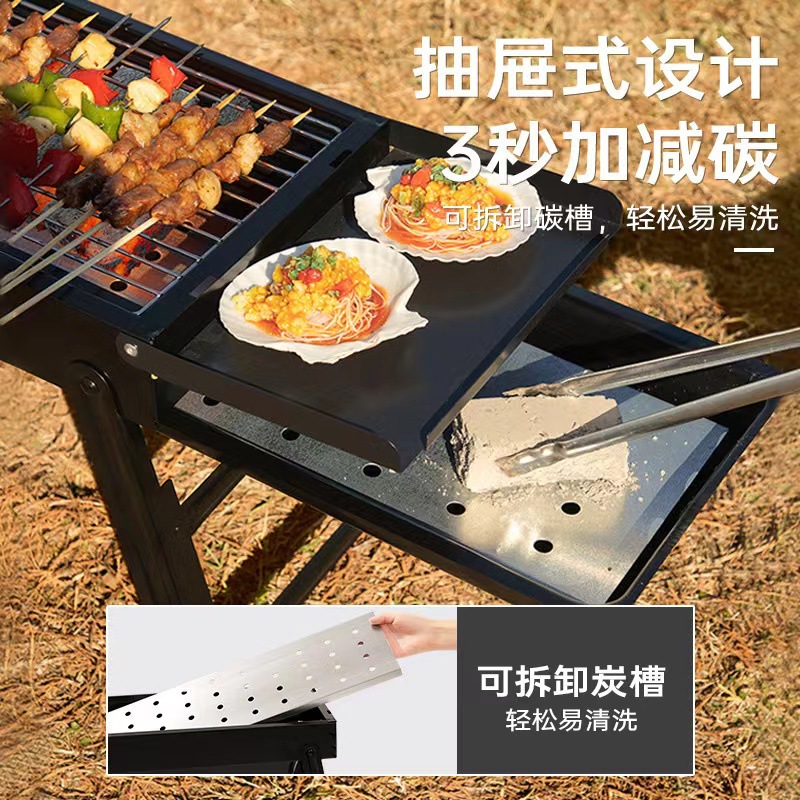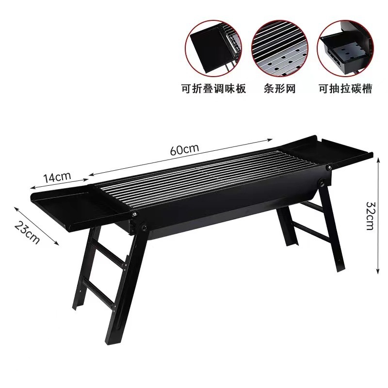 材质:冷扎铁+不锈钢烤网 展开尺寸:88*32*22.5cm 颜色:铁黑 类型:炭烧烤架 净重:3.2kg 1、便携折叠设计,不占空间; 2、大尺寸大容量,冷扎铁底座+不锈钢烤网; 3、分布式设计,受热均匀; 4、升级不锈钢烤网、经久耐用 5、两侧带隔板,加大空间