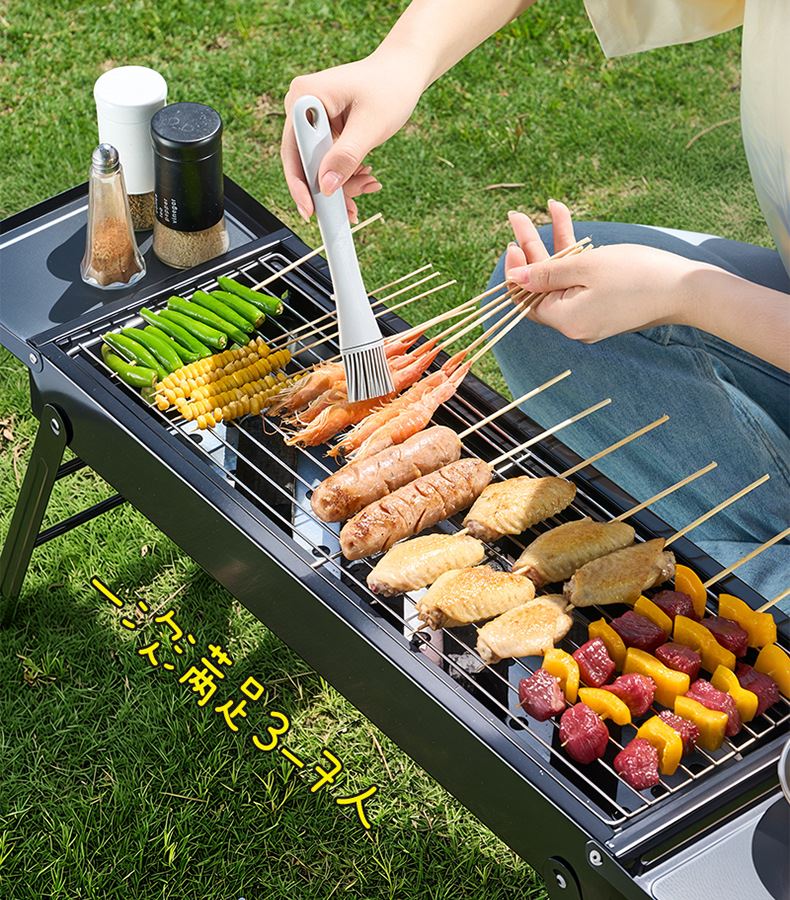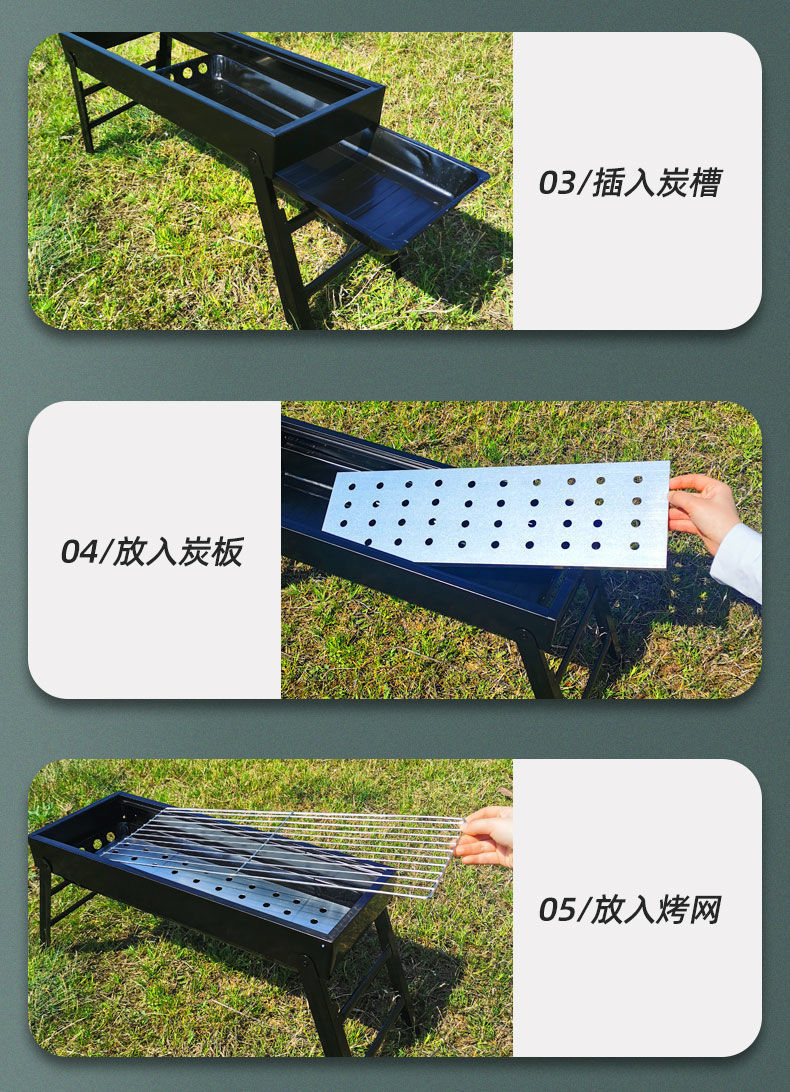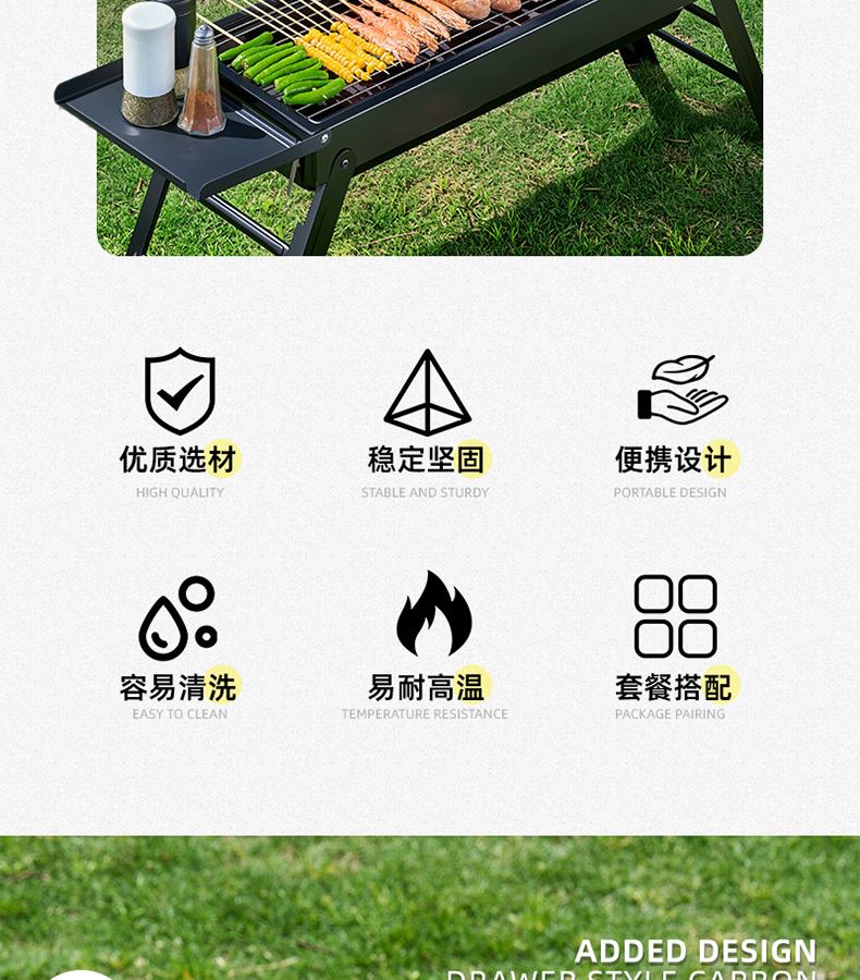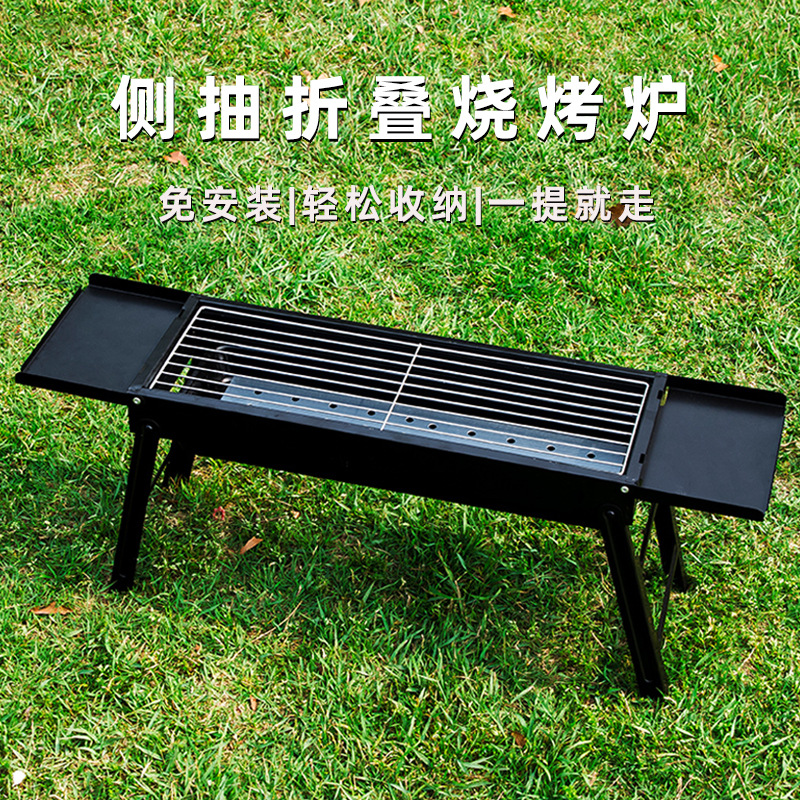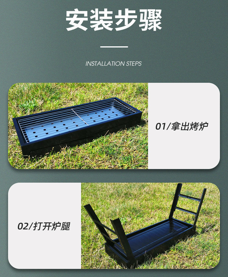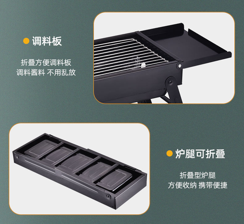 材质:冷扎铁+不锈钢烤网 展开尺寸:88*32*22.5cm 颜色:铁黑 类型:炭烧烤架 净重:3.2kg 1、便携折叠设计,不占空间; 2、大尺寸大容量,冷扎铁底座+不锈钢烤网; 3、分布式设计,受热均匀; 4、升级不锈钢烤网、经久耐用 5、两侧带隔板,加大空间