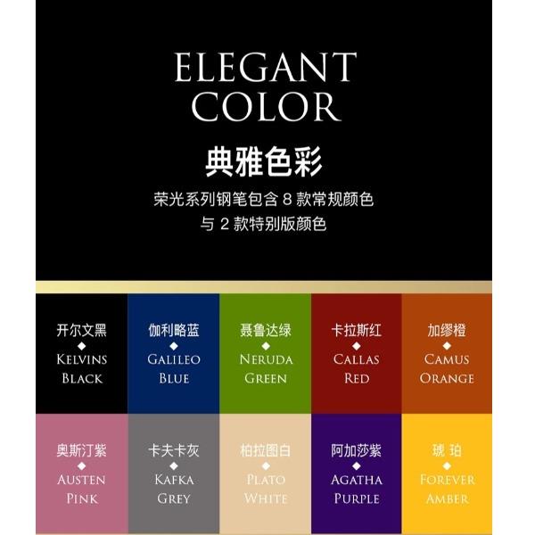 型号:荣光系列签字笔 类型:可替换芯宝珠笔 重量:墨水/宝珠笔25g/30g 颜色分类:开尔文黑/卡拉斯红/奥斯汀紫/加缪橙/伽利略蓝/卡夫卡灰/柏拉图白 书写粗细:0.6mm 整笔材质:铝铜 笔盖:卡扣嵌套设计 笔握:24mm中距笔握 套餐类型:官方标配 方式:鸿运笔芯笔记本礼盒装 适用场景:送礼书写 地区: 适用人群:文艺青年 笔杆材质:金属笔身纹理:磨砂