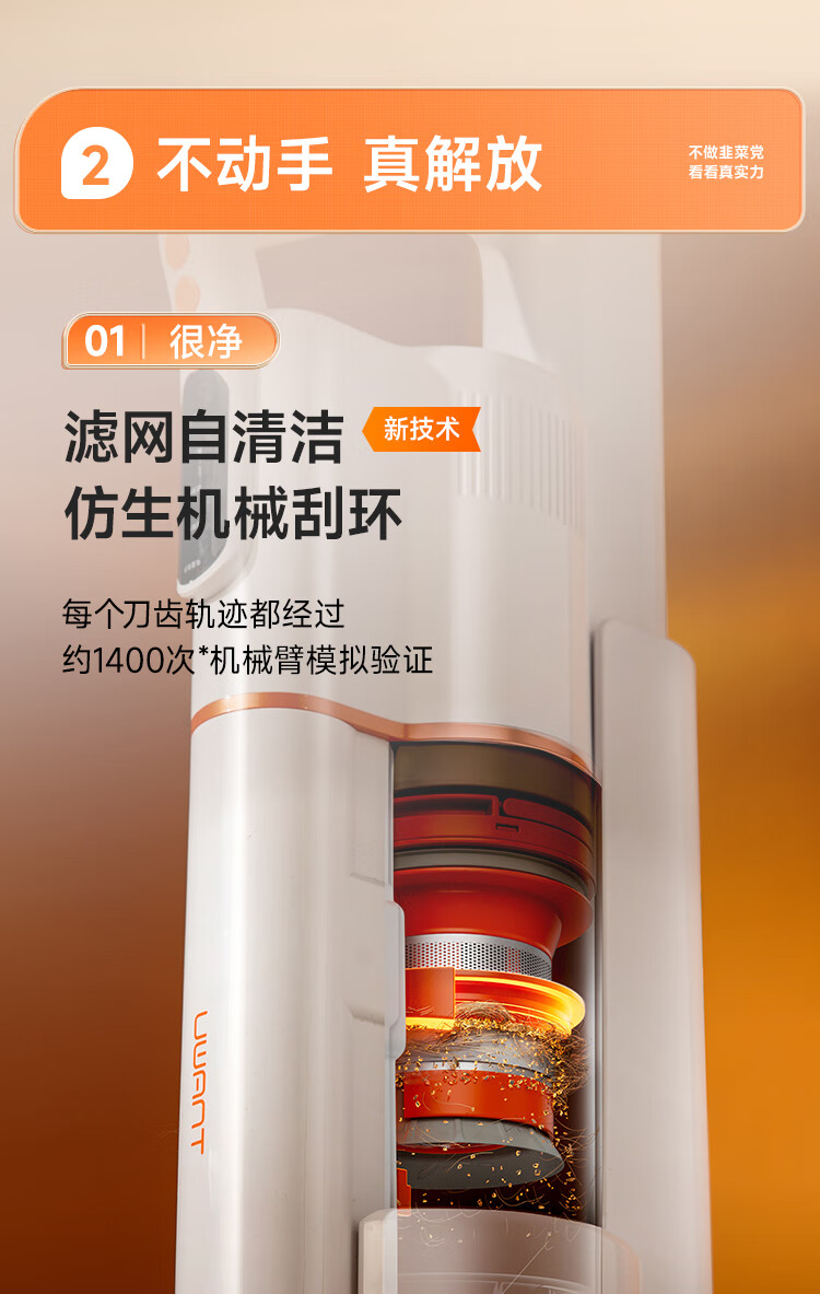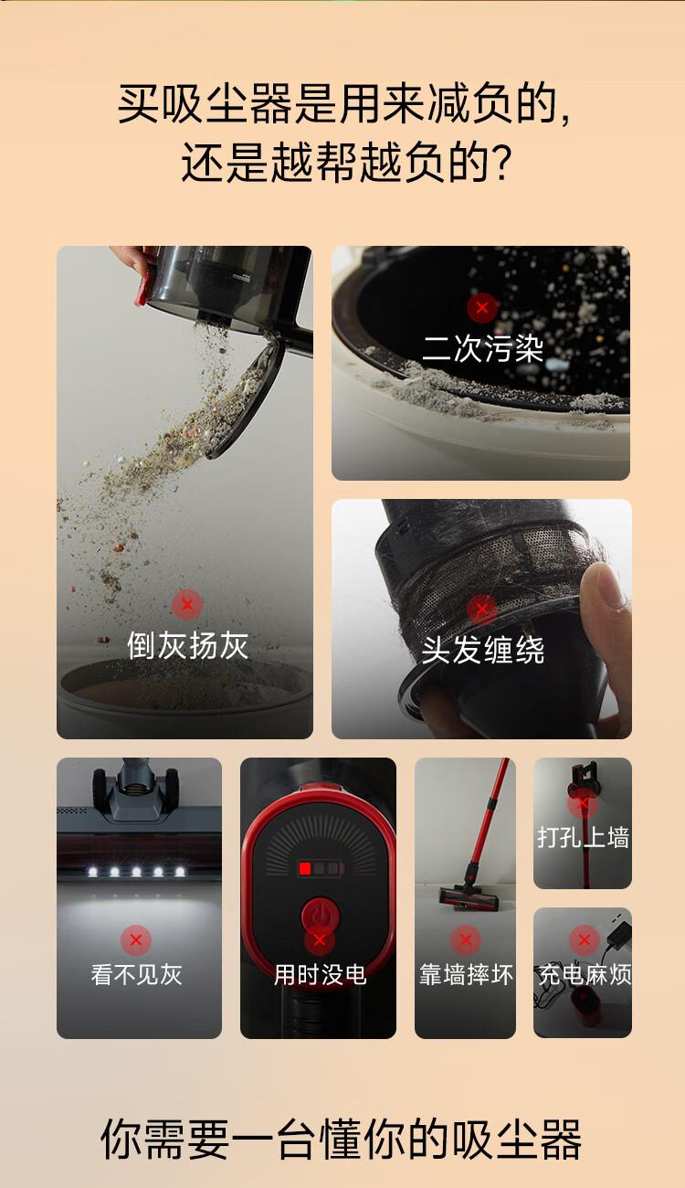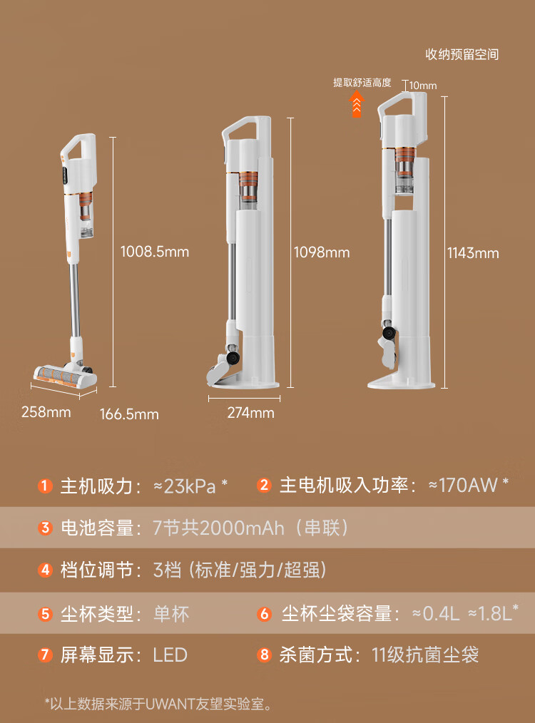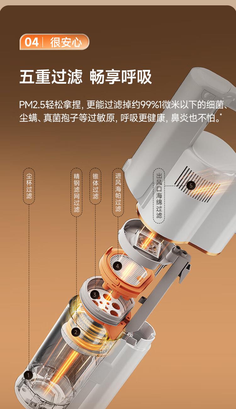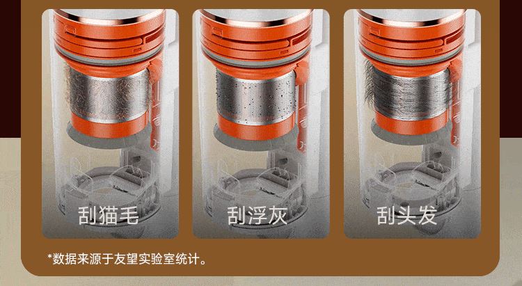 主电机吸入功率:~170AW 主机吸力:~23kPa* 电池容量:7节共2000mAh(串联) 档位调节:3档(标准/强力/超强) 尘杯类型:单杯 屏幕显示:LED 尘杯尘袋容量:≈0.4L ~1.8L 每个刀齿轨迹都经过约1400次*机械臂模拟验证 约0.4L大尘杯 ,约1.8L大尘袋 PM2.5轻松拿捏,更能过滤掉约99%1微米以下的细菌,尘螨、真菌孢子等过敏原,呼吸更健康,鼻炎也不怕。