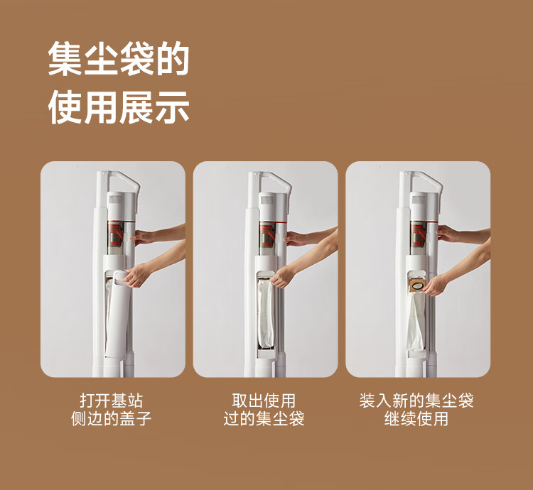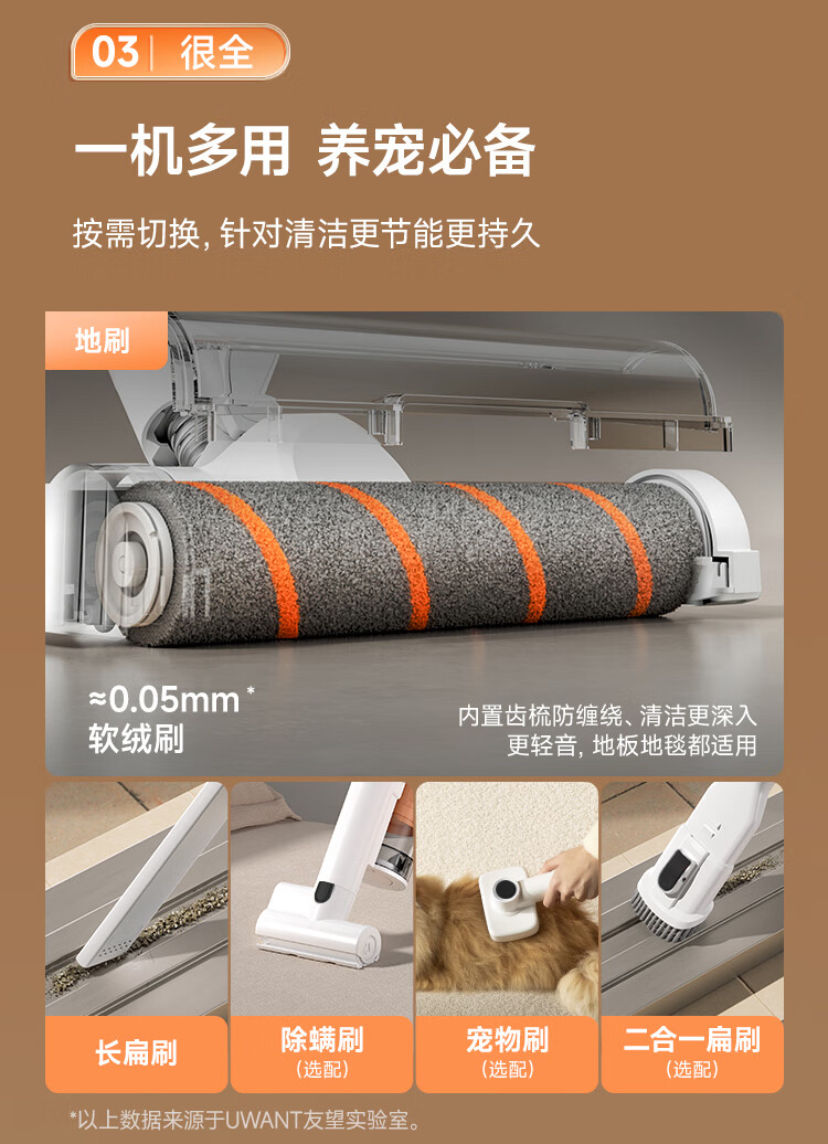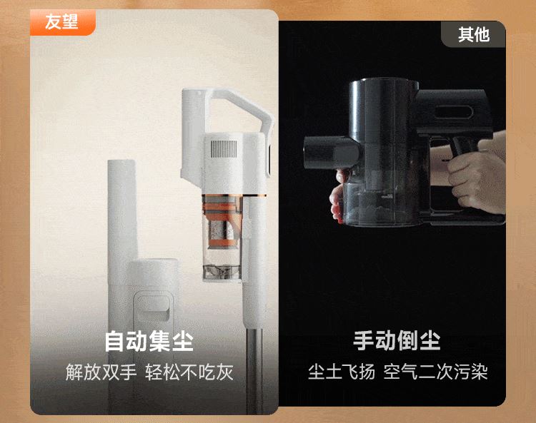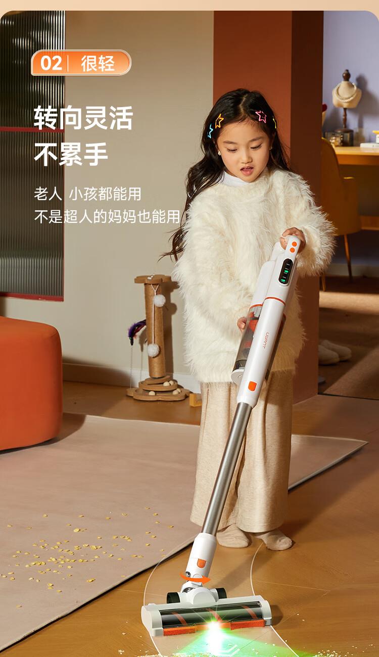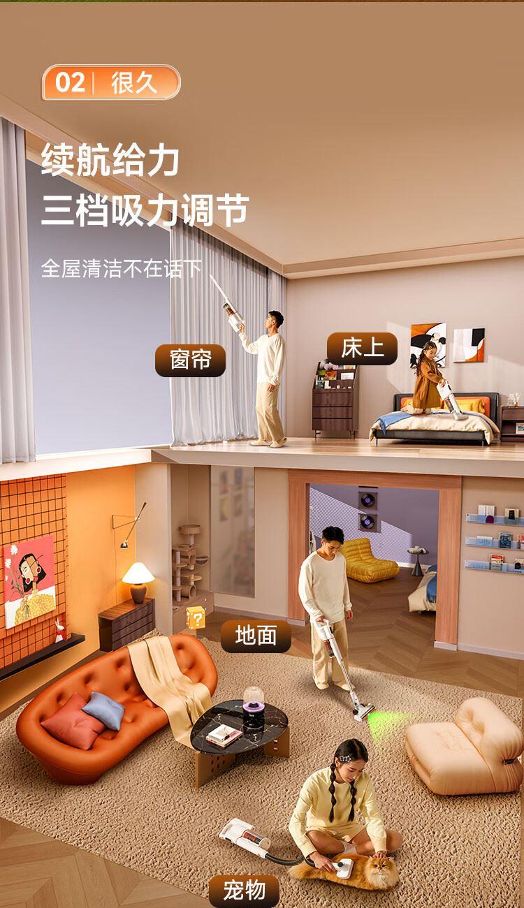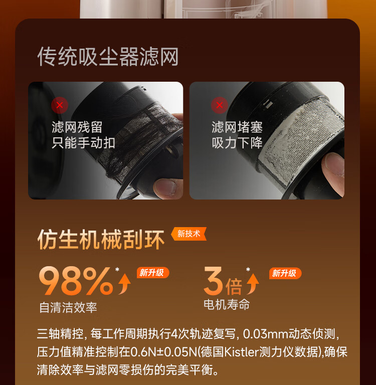 主电机吸入功率:~170AW 主机吸力:~23kPa* 电池容量:7节共2000mAh(串联) 档位调节:3档(标准/强力/超强) 尘杯类型:单杯 屏幕显示:LED 尘杯尘袋容量:≈0.4L ~1.8L 每个刀齿轨迹都经过约1400次*机械臂模拟验证 约0.4L大尘杯 ,约1.8L大尘袋 PM2.5轻松拿捏,更能过滤掉约99%1微米以下的细菌,尘螨、真菌孢子等过敏原,呼吸更健康,鼻炎也不怕。