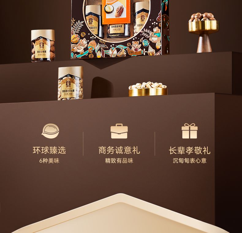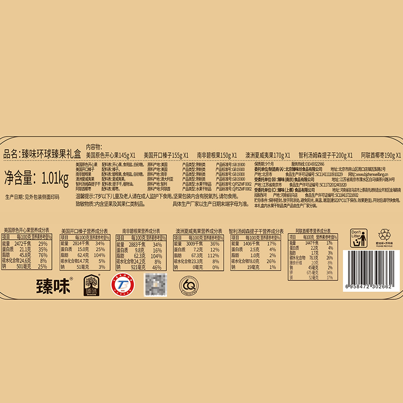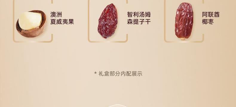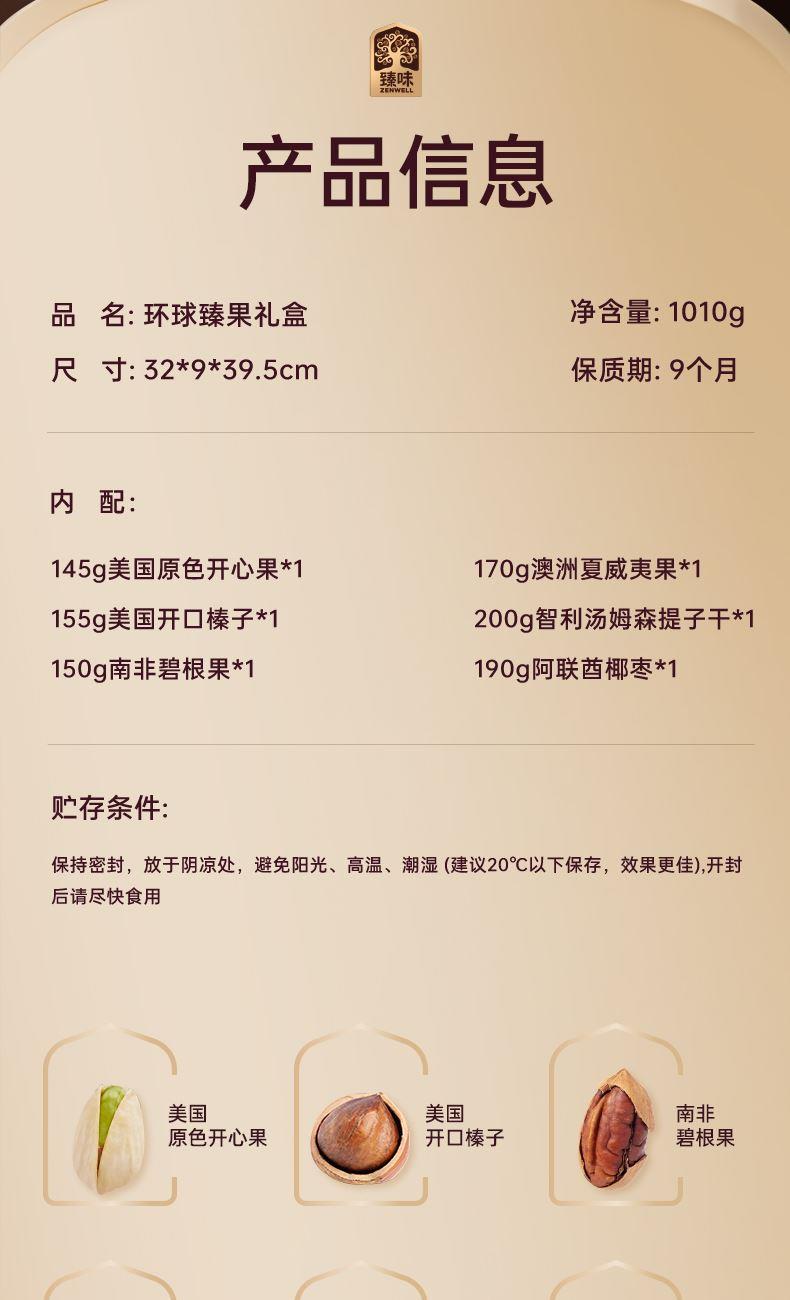 145g美国原色开心果*1 155g美国开口榛子*1 150g南非碧根果*1 170g澳洲夏威夷果*1 200g智利汤姆森提子干*1 190g阿联酋椰枣*1 包装圆形开窗设计,象征圆圆满满,更直观展现产品内里,质感也更为出众; 净含量:1010g,内含4种坚果、2种果干,真材实料,情满意足,是全渠道主推爆品。