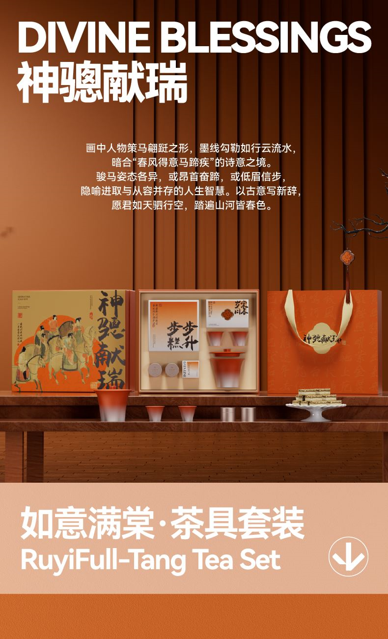 以“神骢献瑞”为引,取意《虢国夫人游春图》中骏马徐行、风华盈路的盛唐气象。马者,乾象天行,寓势如破竹、驰骋万里之志;新春者,万象更始,合纳福迎祥、天地同春之愿。神骢驮载千年文脉与时代新章,以古典笔意勾勒当代吉庆,将诗画中的雍容气度,化为礼盒间流转的东方韵律。