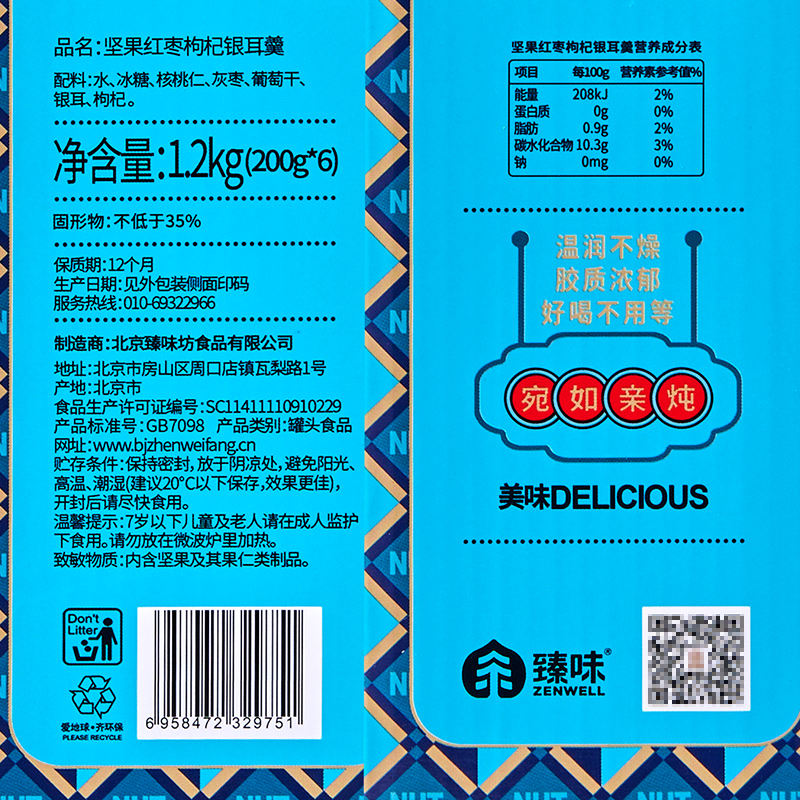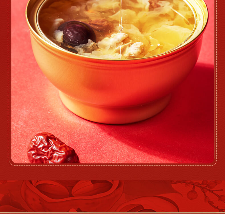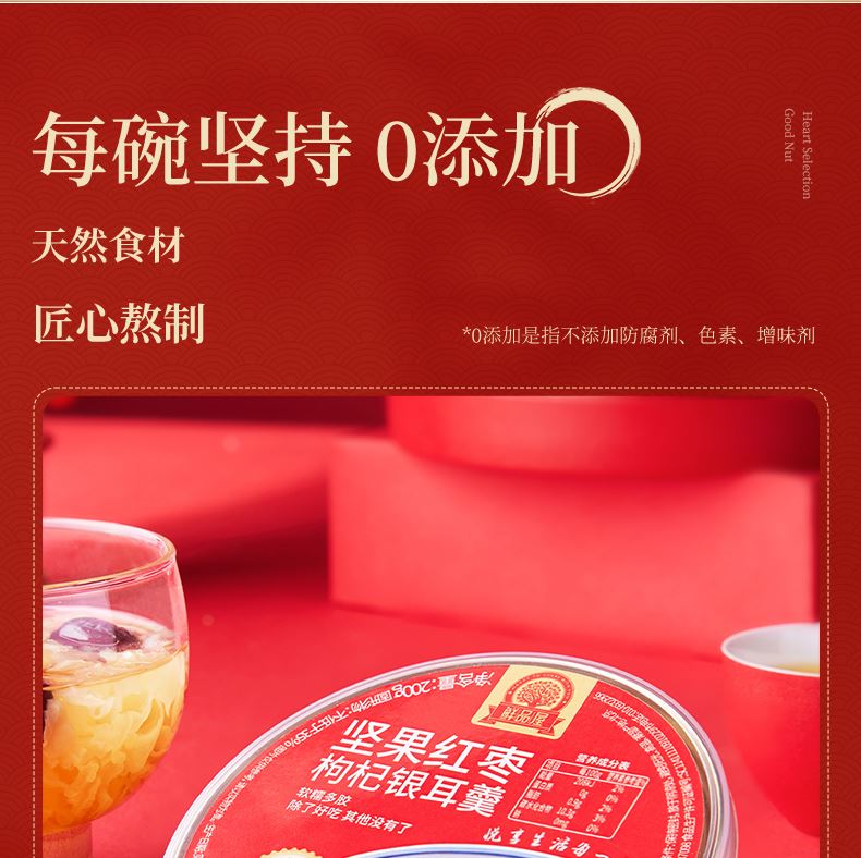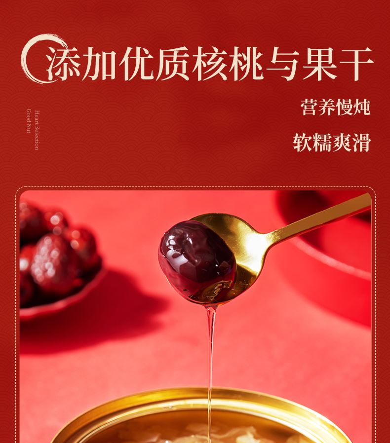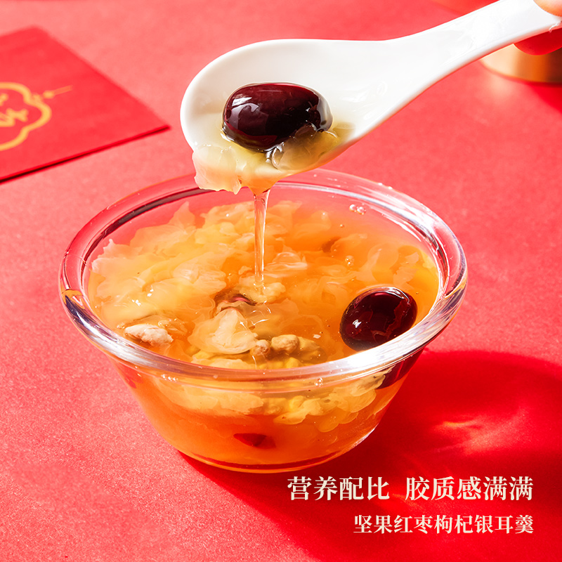 200g坚果红枣枸杞银耳羹*6 添加优质核桃与果干,搭配泡发后的胶质银耳,营养慢炖,软糯爽滑,每碗坚持0添加,独立包装开盖即食,轻松享受,健康滋养。