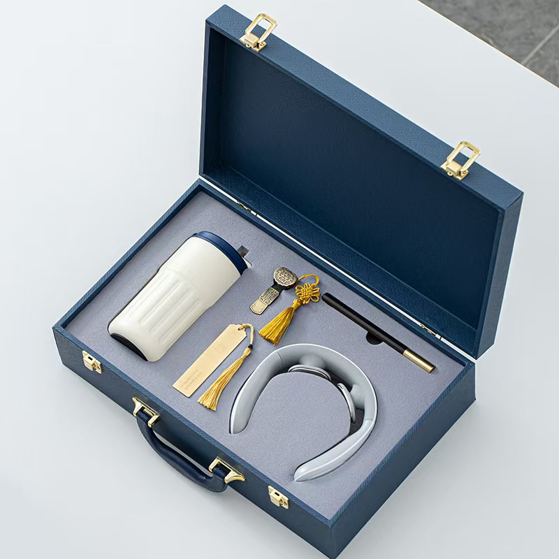 配 制: 1筋膜枪/颈椎仪 温显杯 写字笔 书签 优盘 锦盒 规格:筋膜枪:17.4*14cm 温显咖啡杯 15*6.7cm 颈椎仪:300毫安 礼盒38.2*11cm 工艺:商务实用性礼品,上班族刚需产品。专业级筋膜枪,6档变速,4种按摩头,液晶触屏,深度缓解肌肉酸胀。颈椎按摩仪,低频脉冲技术,缓解颈椎疼痛。温显咖啡杯,智能温显,长效保温保冷,可拎可握。