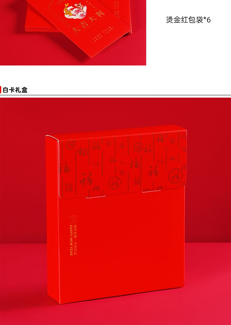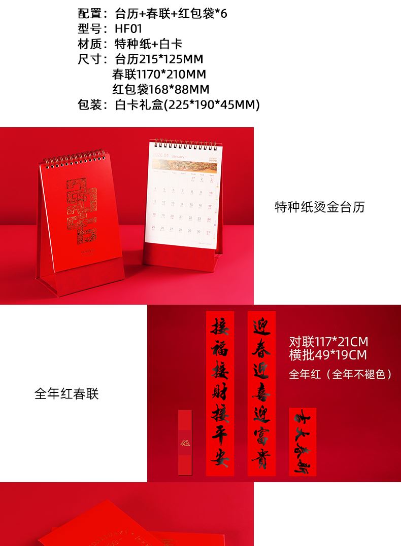 配置:台历+春联+红包袋*6 型号:NF01 材质:特种纸+白卡 尺寸:台历215*125mm 春联1170*210mm 红包袋168*88mm 包装:白卡礼盒(225*190*45mm)