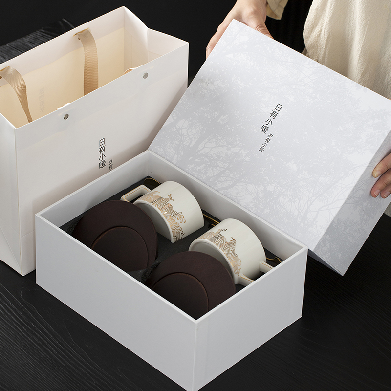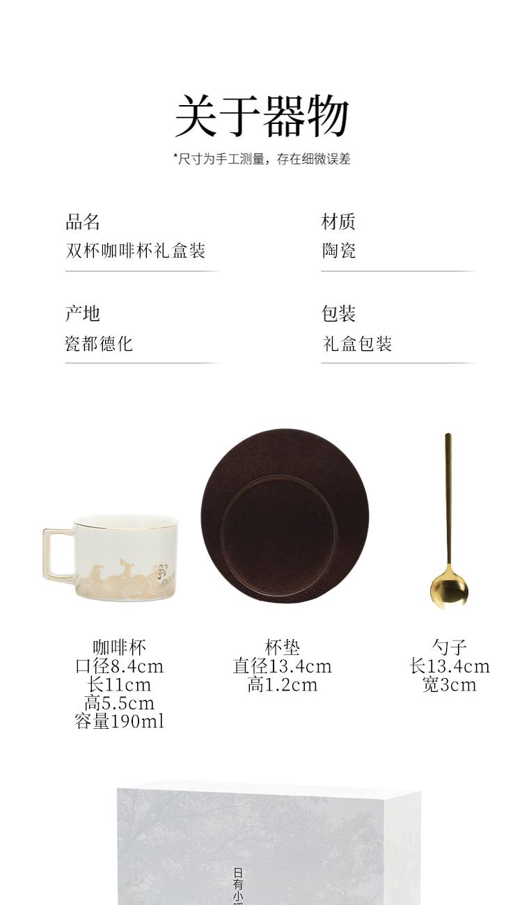配置:咖啡杯*2 不锈钢汤勺*2 杯垫*2 礼盒*1 手提袋*1 材质:羊脂玉瓷 礼盒尺寸:29cm*21cm*12cm 产品尺寸:咖啡杯:190ml 勺子:长13.4cm 杯垫直径:13.4cm